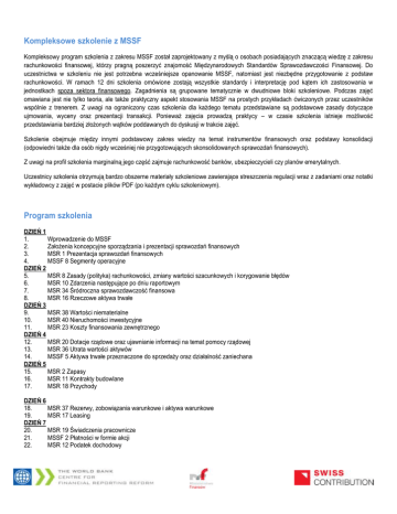 Kompleksowe szkolenie z MSSF Kompleksowy program szkolenia z zakresu MSSF został zaprojektowany z myślą o osobach posiadających znaczącą wiedzę z zakresu rachunkowości finansowej, którzy pragną poszerzyć znajomość Międzynarodowych Standardów Sprawozdawczości Finansowej. Do uczestnictwa w szkoleniu nie jest potrzebna wcześniejsze opanowanie MSSF, natomiast jest niezbędne przygotowanie z podstaw rachunkowości. W ramach 12 dni szkolenia omówione zostają wszystkie standardy i interpretację pod kątem ich zastosowania w jednostkach spoza sektora finansowego. Zagadnienia są grupowane tematycznie w dwudniowe bloki szkoleniowe. Podczas zajęć omawiana jest nie tylko teoria, ale także praktyczny aspekt stosowania MSSF na prostych przykładach ćwiczonych przez uczestników wspólnie z trenerem. Z uwagi na ograniczony czas szkolenia dla każdego tematu przedstawiane są podstawowe zasady dotyczące ujmowania, wyceny oraz prezentacji transakcji. Ponieważ zajęcia prowadzą praktycy – w czasie szkolenia istnieje możliwość przedstawiania bardziej złożonych wątków poddawanych do dyskusji w trakcie zajęć. Szkolenie obejmuje między innymi podstawowy zakres wiedzy na temat instrumentów finansowych oraz podstawy konsolidacji (odpowiedni także dla osób nigdy wcześniej nie przygotowujących skonsolidowanych sprawozdań finansowych). Z uwagi na profil szkolenia marginalną jego część zajmuje rachunkowość banków, ubezpieczycieli czy planów emerytalnych. Uczestnicy szkolenia otrzymują bardzo obszerne materiały szkoleniowe zawierające streszczenia regulacji wraz z zadaniami oraz notatki wykładowcy z zajęć w postacie plików PDF (po każdym cyklu szkoleniowym). Program szkolenia DZIEŃ 1 1. Wprowadzenie do MSSF 2. Założenia koncepcyjne sporządzania i prezentacji sprawozdań finansowych 3. MSR 1 Prezentacja sprawozdań finansowych 4. MSSF 8 Segmenty operacyjne DZIEŃ 2 5. MSR 8 Zasady (polityka) rachunkowości, zmiany wartości szacunkowych i korygowanie błędów 6. MSR 10 Zdarzenia następujące po dniu raportowym 7. MSR 34 Śródroczna sprawozdawczość finansowa 8. MSR 16 Rzeczowe aktywa trwałe DZIEŃ 3 9. MSR 38 Wartości niematerialne 10. MSR 40 Nieruchomości inwestycyjne 11. MSR 23 Koszty finansowania zewnętrznego DZIEŃ 4 12. MSR 20 Dotacje rządowe oraz ujawnianie informacji na temat pomocy rządowej 13. MSR 36 Utrata wartości aktywów 14. MSSF 5 Aktywa trwałe przeznaczone do sprzedaży oraz działalność zaniechana DZIEŃ 5 15. MSR 2 Zapasy 16. MSR 11 Kontrakty budowlane 17. MSR 18 Przychody DZIEŃ 6 18. MSR 37 Rezerwy, zobowiązania warunkowe i aktywa warunkowe 19. MSR 17 Leasing DZIEŃ 7 20. MSR 19 Świadczenia pracownicze 21. MSSF 2 Płatności w formie akcji 22. MSR 12 Podatek dochodowy DZIEŃ 8 23. MSR 32 Instrumenty finansowe : Prezentacja 24. MSR 39 Instrumenty finansowe: Ujęcie I Wycena 25. MSSF 7 Instrumenty finansowe: Ujawnienia DZIEŃ 9 26. MSSF 3 Połączenie jednostek gospodarczych oraz MSR 27 Skonsolidowane i jednostkowe sprawozdania finansowe DZIEŃ 10 27. MSR 28 Inwestycje w spółki stowarzyszone 28. 28. MSR 31 Wspólne przedsięwzięcia 29. MSR 24 Ujawnienia dotyczące jednostek powiązanych 30. MSR 21 Skutki zmian kursów wymiany walut obcych DZIEŃ 11 31. MSR 7 Sprawozdanie z przepływu środków pieniężnych 32. MSR 33 Zysk na akcję 33. MSSF 1 Zastosowanie MSSF po raz pierwszy DZIEŃ 12 34. Pozostałe standardy specjalistyczne - przegląd • MSSF 4 Umowy ubezpieczeniowe • MSR 26 Rachunkowość i sprawozdawczość programów świadczeń emerytalnych • MSSF 6 Poszukiwanie i ocena zasobów mineralnych • MSR 41 Rolnictwo • MSR 29 Sprawozdawczość finansowa w warunkach hiperinflacji 35. Pozostałe interpretacje • SKI-29 Umowy na usługi koncesjonowane – ujawnianie informacji • KIMSF 12 Umowy na usługi koncesjonowane • SKI-7 Wprowadzenie waluty euro • KIMSF 2 Udziały członkowskie w spółdzielniach i podobne instrumenty • KIMSF 17 Dystrybucja aktywów niepieniężnych do właścicieli • KIMSF 18 Przekazanie aktywów przez klientów 36. Studium przypadku : Zastosowanie MSSF w podejmowaniu decyzji gospodarczych