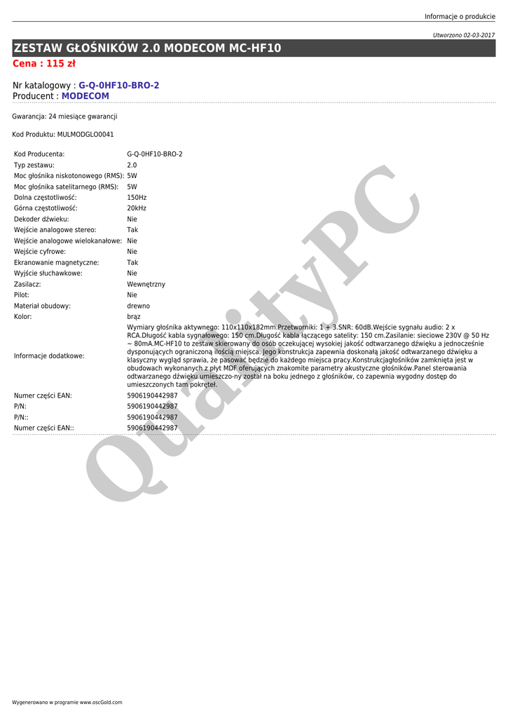 Informacje o produkcie Utworzono 02-03-2017 ZESTAW GŁOŚNIKÓW 2.0 MODECOM MC-HF10 Cena : 115 zł Nr katalogowy : G-Q-0HF10-BRO-2 Producent : MODECOM Gwarancja: 24 miesiące gwarancji Kod Produktu: MULMODGLO0041 Kod Producenta: G-Q-0HF10-BRO-2 Typ zestawu: 2.0 5W Dolna częstotliwość: 150Hz Górna częstotliwość: 20kHz Dekoder dźwieku: Nie Wejście analogowe stereo: Tak Wejście analogowe wielokanałowe: Nie Nie Ekranowanie magnetyczne: Tak Wyjście słuchawkowe: Nie Zasilacz: Wewnętrzny Pilot: Nie Materiał obudowy: drewno Kolor: brąz ua lit Wejście cyfrowe: yP Moc głośnika satelitarnego (RMS): C Moc głośnika niskotonowego (RMS): 5W Informacje dodatkowe: Wymiary głośnika aktywnego: 110x110x182mm.Przetworniki: 1 + 3.SNR: 60dB.Wejście sygnału audio: 2 x RCA.Długość kabla sygnałowego: 150 cm.Długość kabla łączącego satelity: 150 cm.Zasilanie: sieciowe 230V @ 50 Hz ~ 80mA.MC-HF10 to zestaw skierowany do osób oczekującej wysokiej jakość odtwarzanego dźwięku a jednocześnie dysponujących ograniczoną ilością miejsca. Jego konstrukcja zapewnia doskonałą jakość odtwarzanego dźwięku a klasyczny wygląd sprawia, że pasować będzie do każdego miejsca pracy.Konstrukcjagłośników zamknięta jest w obudowach wykonanych z płyt MDF oferujących znakomite parametry akustyczne głośników.Panel sterowania odtwarzanego dźwięku umieszczo-ny został na boku jednego z głośników, co zapewnia wygodny dostęp do umieszczonych tam pokręteł. Numer części EAN: 5906190442987 P/N: 5906190442987 P/N:: 5906190442987 5906190442987 Q Numer części EAN:: Wygenerowano w programie www.oscGold.com