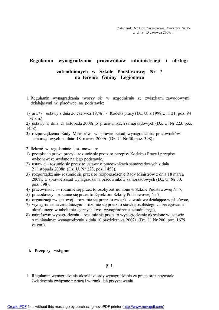 Załącznik Nr 1 do Zarządzenia Dyrektora Nr 15 z dnia 15 czerwca 2009r. Regulamin wynagradzania pracowników administracji i obsługi zatrudnionych w Szkole Podstawowej Nr 7 na terenie Gminy Legionowo 1. Regulamin wynagradzania tworzy się w uzgodnieniu ze związkami zawodowymi działającymi w placówce na podstawie: 1) art.77² ustawy z dnia 26 czerwca 1974r. - Kodeks pracy (Dz. U. z 1998r., nr 21, poz. 94 ze zm.), 2) ustawy z dnia 21 listopada 2008r. o pracownikach samorządowych (Dz. U. Nr 223, poz. 1458), 3) rozporządzenia Rady Ministrów w sprawie zasad wynagradzania pracowników samorządowych z dnia 18 marca 2009r. (Dz. U. Nr 50, poz. 398). 2. Ilekroć w regulaminie jest mowa o: 1) przepisach prawa pracy – rozumie się przez to przepisy Kodeksu Pracy i przepisy wykonawcze wydane na jego podstawie, 2) ustawie – rozumie się przez to ustawę o pracownikach samorządowych z dnia 21 listopada 2008r. (Dz. U. Nr 223, poz. 1458), 3) rozporządzeniu- rozumie się przez to rozporządzenie Rady Ministrów z dnia 18 marca 2009r. w sprawie zasad wynagradzania pracowników samorządowych (Dz. U. Nr 50, poz. 398), 4) pracownikach – rozumie się przez to osoby zatrudnione w Szkole Podstawowej Nr 7, 5) pracodawcy – rozumie się przez to Dyrektora Szkoły Podstawowej Nr 7 6) organizacji związkowej – rozumie się przez to związki zawodowe działające w placówce, 7) wynagrodzeniu zasadniczym – rozumie się przez to stawkę osobistego zaszeregowania określonego w tabeli miesięcznych kwot wynagrodzenia zasadniczego, 8) najniższym wynagrodzeniu – rozumie się przez to wynagrodzenie określone w ustawie o minimalnym wynagrodzeniu z dnia 10 października 2002r. (Dz. U. Nr 200, poz. 1679 ze zm.). I. Przepisy wstępne § 1 1. Regulamin wynagradzania określa zasady wynagradzania za pracę oraz pozostałe świadczenia związane z pracą i warunki ich przyznawania. Create PDF files without this message by purchasing novaPDF printer (http://www.novapdf.com) -2- § 2 1. Postanowienia regulaminu wynagradzania dotyczą wszystkich pracowników administracji i obsługi zatrudnionych w Szkole Podstawowej Nr 7. § 3 1. Każdy pracownik przed dopuszczeniem do pracy zostaje zapoznany z Regulaminem a jego oświadczenie w tej sprawie załącza się do akt osobowych. § 4 1. Przez pracodawcę należy rozumieć Dyrektora Szkoły Podstawowej Nr 7, a przez organ prowadzący Gminę Legionowo. II. Wynagrodzenie za pracę § 5 1) Ustala się: a) Tabelę miesięcznych kwot wynagrodzenia zasadniczego, stanowiącą załącznik nr 1 do Regulaminu. b) Tabelę wymagań kwalifikacyjnych, stanowiącą załącznik nr 2 do Regulaminu. c) Tabelę stawek dodatku funkcyjnego, stanowiącą załącznik nr 3 do Regulaminu. § 6 1. Pracownikom zatrudnionym na stanowiskach: 1) Główny księgowy 2) Kierownik gospodarczy przysługuje dodatek funkcyjny wg tabeli (załącznik nr 3 do Regulaminu) Wysokość dodatku funkcyjnego ustala dyrektor szkoły i jest ona uzależniona od efektów pracy. Create PDF files without this message by purchasing novaPDF printer (http://www.novapdf.com) -3- § 7 1. Pracownikom z tytułu zatrudnienia przysługuje: 1) wynagrodzenie zasadnicze, dodatek za wieloletnią pracę, nagroda jubileuszowa oraz jednorazowa odprawa pieniężna w związku z przejściem na emeryturę lub rentę z tytułu niezdolności do pracy - na podstawie art. 36 ust. 2 ustawy o pracownikach samorządowych (Dz. U. z 2008r., Nr 223, poz. 1458), 2) dodatek funkcyjny, dodatek specjalny, premia oraz nagroda za szczególne osiągnięcia w pracy zawodowej - na podstawie art. 36 ust. 4-6 ustawy o pracownikach samorządowych (Dz. U. z 2008r., Nr 223, poz. 1458) oraz regulaminu wynagradzania, 3) dodatkowe wynagrodzenie roczne - na podstawie ustawy o dodatkowym wynagrodzeniu rocznym dla pracowników jednostek sfery budżetowej (Dz. U. z 1997r., Nr 160, poz. 1080 ze zm.), 4) dodatkowe wynagrodzenie za pracę: w porze nocnej, w godzinach nadliczbowych, w niedziele i święta - na podstawie i zasadach określonych w art. 151 – 151 (12) ustawy z dnia 26 czerwca 1974r. Kodeks pracy (Dz. U. z 1998r., Nr 21, poz. 94 ze zm.) 5) odprawa pieniężna w związku z rozwiązaniem stosunku pracy - na podstawie i zasadach określonych w ustawie z dnia 13 marca 2003r. o szczególnych zasadach rozwiązywania z pracownikami stosunków pracy z przyczyn niedotyczących pracowników (Dz. U. z 2003r., Nr 90, poz. 844 ze zm.), 6) wynagrodzenie za czas niezdolności do pracy - na podstawie i zasadach określonych w art. 92 ustawy z dnia 26 czerwca 1974 r. Kodeks pracy (Dz. U. z 1998r., Nr 21, poz. 94 ze zm.), 7) świadczenia pieniężne z ubezpieczenia społecznego w razie choroby i macierzyństwa obejmujące: zasiłek chorobowy, świadczenie rehabilitacyjne, zasiłek wyrównawczy, zasiłek macierzyński, zasiłek opiekuńczy - na podstawie i zasadach określonych w ustawie z dnia 25 czerwca 1999r. o świadczeniach pieniężnych z ubezpieczenia społecznego w razie choroby i macierzyństwa (Dz. U. z 2005r., Nr 31, poz. 267 ze zm.), 8) wynagrodzenie za czas urlopu wypoczynkowego - na podstawie przepisów ustawy z dnia 26 czerwca 1974r. - Kodeks pracy (Dz. U. z 1998r., Nr 21, poz. 94 ze zm.). 2. Pracownikowi, który wskutek wypadku przy pracy lub choroby zawodowej doznał stałego lub długotrwałego uszczerbku na zdrowiu przysługuje jednorazowe odszkodowanie pieniężne na podstawie i zasadach określonych w ustawie z dnia 30 października 2002r. o ubezpieczeniu społecznym z tytułu wypadków przy pracy i chorób zawodowych (Dz. U. z 2002r., Nr 199, poz. 1673 ze zm.). Procent uszczerbku na zdrowiu w związku z wypadkami przy pracy ustala lekarz Orzecznik Zakładu Ubezpieczeń Społecznych. Kwoty jednorazowych odszkodowań z tytułu wypadków przy pracy i chorób zawodowych za każdy procent uszczerbku na zdrowiu ogłaszane są w Rozporządzeniu Ministra Pracy i Polityki Społecznej. 3. W razie śmierci pracownika w czasie trwania stosunku pracy lub w cza