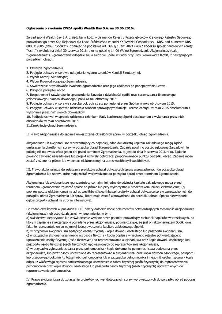 Ogłoszenie o zwołaniu ZWZA spółki Wealth Bay S.A. na 30.06.2016r. Zarząd spółki Wealth Bay S.A. z siedzibą w Łodzi wpisanej do Rejestru Przedsiębiorców Krajowego Rejestru Sądowego prowadzonego przez Sąd Rejonowy dla Łodzi-Śródmieścia w Łodzi XX Wydział Gospodarczy - KRS, pod numerem KRS 0000319885 (dalej: "Spółka"), działając na podstawie art. 399 § 1, art. 4021 i 4022 Kodeksu spółek handlowych (dalej: "k.s.h.") zwołuje na dzień 30 czerwca 2016 roku na godzinę 14:00 Walne Zgromadzenie Akcjonariuszy (dalej: "Zgromadzenie"). Zgromadzenie odbędzie się w siedzibie Spółki w Łodzi przy ulicy Sienkiewicza 82/84, z następującym porządkiem obrad: 1. Otwarcie Zgromadzenia. 2. Podjęcie uchwały w sprawie odtajnienia wyboru członków Komisji Skrutacyjnej. 3. Wybór Komisji Skrutacyjnej. 4. Wybór Przewodniczącego Zgromadzenia. 5. Stwierdzenie prawidłowości zwołania Zgromadzenia oraz jego zdolności do podejmowania uchwał. 6. Przyjęcie porządku obrad. 7. Rozpatrzenie i zatwierdzenie sprawozdania Zarządu z działalności spółki oraz sprawozdania finansowego jednostkowego i skonsolidowanego Spółki za rok obrotowy 2015. 8. Podjęcie uchwały w sprawie sposobu pokrycia straty poniesionej przez Spółkę w roku obrotowym 2015. 9. Podjęcie uchwały w sprawie udzielenia osobom sprawującym funkcje Prezesa Zarządu w roku 2015 absolutorium z wykonania przez nich swoich obowiązków. 10. Podjęcie uchwał w sprawie udzielenia członkom Rady Nadzorczej Spółki absolutorium z wykonania przez nich obowiązków w roku obrotowym 2015. 11.Zamknięcie obrad Zgromadzenia. II. Prawo akcjonariusza do żądania umieszczenia określonych spraw w porządku obrad Zgromadzenia. Akcjonariusz lub akcjonariusze reprezentujący co najmniej jedną dwudziestą kapitału zakładowego mogą żądać umieszczenia określonych spraw w porządku obrad Zgromadzenia. Żądanie powinno zostać zgłoszone Zarządowi nie później niż na dwadzieścia jeden dni przed terminem Zgromadzenia, to jest do dnia 9 czerwca 2016 roku. Żądanie powinno zawierać uzasadnienie lub projekt uchwały dotyczącej proponowanego punktu porządku obrad. Żądanie może zostać złożone na piśmie lub w postaci elektronicznej na adres [email protected]. III. Prawo akcjonariusza do zgłaszania projektów uchwał dotyczących spraw wprowadzonych do porządku obrad Zgromadzenia lub spraw, które mają zostać wprowadzone do porządku obrad przed terminem Zgromadzenia. Akcjonariusz lub akcjonariusze reprezentujący co najmniej jedną dwudziestą kapitału zakładowego mogą przed terminem Zgromadzenia zgłaszać spółce na piśmie lub przy wykorzystaniu środków komunikacji elektronicznej (tj. poprzez pocztę elektroniczną) na adres [email protected] projekty uchwał dotyczące spraw wprowadzonych do porządku obrad Zgromadzenia lub spraw, które mają zostać wprowadzone do porządku obrad. Spółka niezwłocznie ogłosi projekty uchwał na stronie internetowej. Do żądań określonych w punktach II i III należy dołączyć kopie dokumentów potwierdzających tożsamość akcjonariusza (akcjonariuszy) lub osób działających w jego imieniu, w tym: a) świadectwo depozytowe lub zaświadczenie wydane przez podmiot prowadzący rachunek papierów wartościowych, na którym zapisane są akcje Spółki posiadane przez akcjonariusza, potwierdzające, że jest on akcjonariuszem Spółki oraz fakt, że reprezentuje on co najmniej jedną dwudziestą kapitału zakładowego Spółki, b) w przypadku akcjonariusza będącego osobą fizyczną - kopia dowodu osobistego lub paszportu akcjonariusza, c) w przypadku akcjonariusza innego niż osoba fizyczna - kopia odpisu z właściwego rejestru potwierdzającego upoważnienie osoby fizycznej (osób fizycznych) do reprezentowania akcjonariusza oraz kopia dowodu osobistego lub paszportu osoby fizycznej (osób fizycznych) upoważnionych do reprezentowania akcjonariusza, d) w przypadku zgłoszenia żądania przez pełnomocnika - kopia dokumentu pełnomocnictwa podpisana przez akcjonariusza, lub przez osoby uprawnione do reprezentowania akcjonariusza, oraz kopia dowodu osobistego, paszportu lub urzędowego dokumentu tożsamości pełnomocnika lub w przypadku pełnomocnika innego niż osoba fizyczna - kopia odpisu z właściwego rejestru potwierdzającego upoważnienie osoby fizycznej (osób fizycznych) do reprezentowania pełnomocnika oraz kopia dowodu osobistego lub paszportu osoby fizycznej (osób fizycznych) upoważnionych do reprezentowania pełnomocnika. IV. Prawo akcjonariusza do zgłaszania projektów uchwał dotyczących spraw wprowadzonych do porządku obrad podczas Zgromadzenia. Każdy z akcjonariuszy może podczas Zgromadzenia zgłaszać projekty uchwał dotyczące spraw wprowadzonych do porządku obrad. Projekty te powinny być sporządzone na piśmie i zawierać oznaczenie akcjonariusza (imię i nazwisko/firma), treść projektu uchwały oraz zwięzłe uzasadnienie projektu uchwały. Akcjonariusz składa takie projekty uchwał na ręce Przewodniczącego Walnego Zgromadzenia do czasu zakończenia dyskusji nad danym punktem porządku obrad. V. Uczestnictwo w Zgromadzeniu i wykonywanie prawa głosu. Sposób uczestnictwa w Zgromadzeniu i wykonywania prawa głosu przez pełnomocnika. Akcjonariusz będący osobą fizyczną może uczestniczyć w Zgromadzeniu oraz wykonywać prawo głosu osobiście lub przez pełnomocnika. Akcjonariusz niebędący osobą fizyczną może uczestniczyć w Zgromadzeniu oraz wykonywać prawo głosu przez osobę uprawnioną do składania oświadczeń woli w jego imieniu lub przez pełnomocnika. Prawo do reprezentowania akcjonariusza niebędącego osobą fizyczną powinno wynikać z okazanego przy sporządzaniu listy obecności odpisu z właściwego rejestru dla akcjonariusza (składanego w oryginale lub kopii potwierdzonej za zgodność z oryginałem przez notariusza), ewentualnie ciągu pełnomocnictw oraz odpisu z właściwego rejestru, lub u