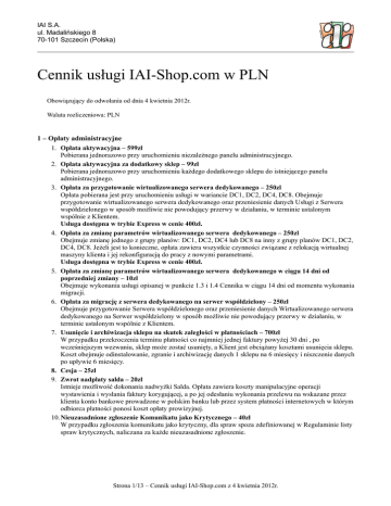 IAI S.A. ul. Madalińskiego 8 70-101 Szczecin (Polska) Cennik usługi IAI-Shop.com w PLN Obowiązujący do odwołania od dnia 4 kwietnia 2012r. Waluta rozliczeniowa: PLN 1 – Opłaty administracyjne 1. Opłata aktywacyjna – 599zł Pobierana jednorazowo przy uruchomieniu niezależnego panelu administracyjnego. 2. Opłata aktywacyjna za dodatkowy sklep – 99zł Pobierana jednorazowo przy uruchomieniu każdego dodatkowego sklepu do istniejącego panelu administracyjnego. 3. Opłata za przygotowanie wirtualizowanego serwera dedykowanego – 250zl Opłata pobierana jest przy uruchomieniu usługi w wariancie DC1, DC2, DC4, DC8. Obejmuje przygotowanie wirtualizowanego serwera dedykowanego oraz przeniesienie danych Usługi z Serwera współdzielonego w sposób możliwie nie powodujący przerwy w działaniu, w terminie ustalonym wspólnie z Klientem. Usługa dostępna w trybie Express w cenie 400zł. 4. Opłata za zmianę parametrów wirtualizowanego serwera dedykowanego – 250zl Obejmuje zmianę jednego z grupy planów: DC1, DC2, DC4 lub DC8 na inny z grupy planów DC1, DC2, DC4, DC8. Jeżeli jest to konieczne, opłata zawiera wszystkie czynności związane z relokacją wirtualnej maszyny klienta i jej rekonfiguracją do pracy z nowymi parametrami. Usługa dostępna w trybie Express w cenie 400zł. 5. Opłata za zmianę parametrów wirtualizowanego serwera dedykowanego w ciągu 14 dni od poprzedniej zmiany – 10zł Obejmuje wykonania usługi opisanej w punkcie 1.3 i 1.4 Cennika w ciągu 14 dni od momentu wykonania migracji. 6. Opłata za migrację z serwera dedykowanego na serwer współdzielony – 250zł Obejmuje przygotowanie Serwera współdzielonego oraz przeniesienie danych Wirtualizowanego serwera dedykowanego na Serwer współdzielony w sposób możliwie nie powodujący przerwy w działaniu, w terminie ustalonym wspólnie z Klientem. 7. Usunięcie i archiwizacja sklepu na skutek zaległości w płatnościach – 700zł W przypadku przekroczenia terminu płatności co najmniej jednej faktury powyżej 30 dni , po wcześniejszym wezwaniu, sklep może zostać usunięty, a Klient jest obciążany kosztami usunięcia sklepu. Koszt obejmuje odinstalowanie, zgranie i archiwizację danych 1 sklepu na 6 miesięcy i niszczenie danych po upływie 6 miesięcy. 8. Cesja – 25zł 9. Zwrot nadpłaty salda – 20zł Istnieje możliwość dokonania nadwyżki Salda. Opłata zawiera koszty manipulacyjne operacji wystawienia i wysłania faktury korygującej, a po jej odesłaniu wykonania przelewu na wskazane przez klienta konto bankowe prowadzone w polskim banku lub przez system płatności internetowych w którym odbiorca płatności ponosi koszt opłaty prowizyjnej. 10.Nieuzasadnione zgłoszenie Komunikatu jako Krytycznego – 40zł W przypadku zgłoszenia komunikatu jako krytyczny, dla spraw spoza zdefiniowanej w Regulaminie listy spraw krytycznych, naliczana za każde nieuzasadnione zgłoszenie. Strona 1/13 – Cennik usługi IAI-Shop.com z 4 kwietnia 2012r. IAI S.A. ul. Madalińskiego 8 70-101 Szczecin (Polska) 2 – Opłaty abonamentowe 1. Plan CLOUD – 29zł Opłata miesięczna, obejmuje: Transfer w cenie: do 30GB Ilość Wizyt w cenie: do 5000 Ilość Wywołań API w cenie: do 10000 Limit objętości danych: 10GB Limit ilości towarów w cenie: do 5000 Funkcjonalność: pełna funkcjonalność IAI-Shop.com z maksymalnymi limitami ilościowymi dla serwerów współdzielonych 2. Plan DEDICATED CLOUD 1 (DC1) – 336,50zł Opłata miesięczna, obejmuje brak dopłat za Transfer, ilość Wizyt, wywołań API lub ilość towarów. Ograniczeniem jest jedynie możliwa do osiągnięcia graniczna wydajność wirtualizowanego serwera dedykowanego. Funkcjonalność: pełna funkcjonalność IAI-Shop.com bez limitów ilościowych w modułach W ramach opłaty administracja i aktualizacja wirtualizowanego serwera dedykowanego. Wirtualizowany serwer dedykowany DC1 ma: 1 rdzeń procesora Intel Xeon przypisany na stałe, 3000MB RAM, 80GB przestrzeni dyskowej, łącze o prędkości nominalnej 1Gbps bez limitu transferu 3. Plan DEDICATED CLOUD 2 (DC2) – 536,50zł Opłata miesięczna, obejmuje ten sam zakres usług co w wariancie DEDICATED CLOUD 1, oraz Wirtualizowany serwer dedykowany o parametrach: 2 rdzenie procesora Intel Xeon przypisane na stałe, 6000MB RAM, 80GB przestrzeni dyskowej, łącze o prędkości nominalnej 1Gbps bez limitu transferu 4. Plan DEDICATED CLOUD 4 (DC4) – 749zł Opłata miesięczna, obejmuje ten sam zakres usług co w wariancie DEDICATED CLOUD 1, oraz Wirtualizowany serwer dedykowany o parametrach: 4 rdzenie procesora Intel Xeon przypisane na stałe, 12000MB RAM, 80GB przestrzeni dyskowej, łącze o prędkości nominalnej 1Gbps bez limitu transferu 5. Plan DEDICATED CLOUD 8 (DC8) – 1261,50zł Opłata miesięczna, obejmuje ten sam zakres usług co w wariancie DEDICATED CLOUD 1, oraz Wirtualizowany serwer dedykowany o parametrach: 8 rdzeni procesora Intel Xeon przypisane na stałe, 24000MB RAM, 80GB przestrzeni dyskowej, łącze o prędkości nominalnej 1Gbps bez limitu transferu 6. Plan DEDICATED CLOUD 8x2 (DC8x2) – 2524zł Opłata miesięczna, obejmuje ten sam zakres usług co w wariancie DEDICATED CLOUD 8 w oparciu o transmisję wykonywaną równolegle z 2 serwerów o parametrach takich jak w planie DC8. 3 – Dopłaty 1. Dopłata za każdy rozpoczęty 1GB ruchu ponad limit w ramach abonamentu CLOUD – 0,50zł 2. Dopłata za każde rozpoczęte 1000 wizyt ponad limit w ramach abonamentu CLOUD – 12,5zł 3. Dopłata za każde rozpoczęte 10000 wywołań API ponad limit w ramach abonamentu CLOUD - 10zł 4. Dopłata za każde 5000 dodatkowych towarów ponad limit w ramach abonamentu CLOUD – 50zł 5. Dopłata za dodatkowy sklep do panelu – 25zł Opłata nie zmienia Limitu ruchu. 4 – Usługi serwisowe 1. Roboczogodzina przy imporcie danych - 80zł/h Roboczogodzina przy pracy nad edycją danych Klienta lub tworzeniu programu do importu danych z zewnętrznej bazy danych, w tym i