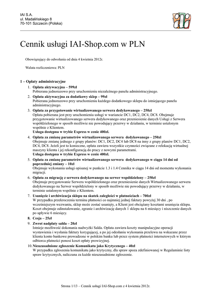 Cennik (archiwalny) w PLN obowiązujący od 2012 - IAI