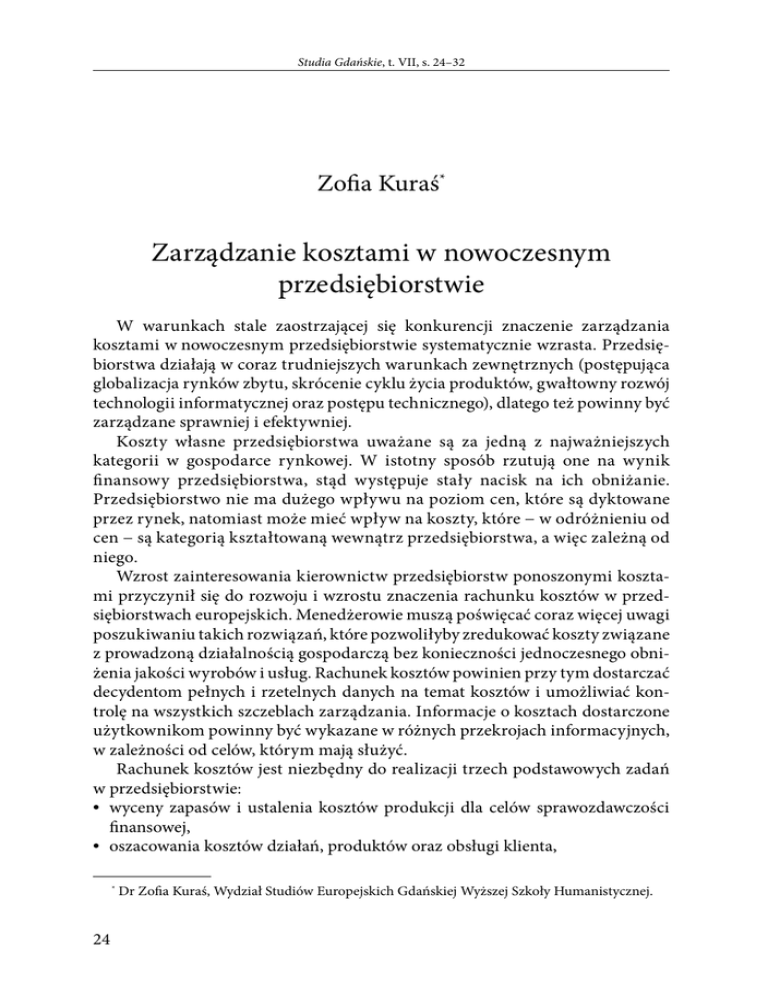 Studia Gdańskie, t. VII, s. 24–32 Zofia Kuraś* Zarządzanie kosztami w nowoczesnym przedsiębiorstwie W warunkach stale zaostrzającej się konkurencji znaczenie zarządzania kosztami w nowoczesnym przedsiębiorstwie systematycznie wzrasta. Przedsiębiorstwa działają w coraz trudniejszych warunkach zewnętrznych (postępująca globalizacja rynków zbytu, skrócenie cyklu życia produktów, gwałtowny rozwój technologii informatycznej oraz postępu technicznego), dlatego też powinny być zarządzane sprawniej i efektywniej. Koszty własne przedsiębiorstwa uważane są za jedną z najważniejszych kategorii w gospodarce rynkowej. W istotny sposób rzutują one na wynik finansowy przedsiębiorstwa, stąd występuje stały nacisk na ich obniżanie. Przedsiębiorstwo nie ma dużego wpływu na poziom cen, które są dyktowane przez rynek, natomiast może mieć wpływ na koszty, które − w odróżnieniu od cen − są kategorią kształtowaną wewnątrz przedsiębiorstwa, a więc zależną od niego. Wzrost zainteresowania kierownictw przedsiębiorstw ponoszonymi kosztami przyczynił się do rozwoju i wzrostu znaczenia rachunku kosztów w przedsiębiorstwach europejskich. Menedżerowie muszą poświęcać coraz więcej uwagi poszukiwaniu takich rozwiązań, które pozwoliłyby zredukować koszty związane z prowadzoną działalnością gospodarczą bez konieczności jednoczesnego obniżenia jakości wyrobów i usług. Rachunek kosztów powinien przy tym dostarczać decydentom pełnych i rzetelnych danych na temat kosztów i umożliwiać kontrolę na wszystkich szczeblach zarządzania. Informacje o kosztach dostarczone użytkownikom powinny być wykazane w różnych przekrojach informacyjnych, w zależności od celów, którym mają służyć. Rachunek kosztów jest niezbędny do realizacji trzech podstawowych zadań w przedsiębiorstwie: • wyceny zapasów i ustalenia kosztów produkcji dla celów sprawozdawczości finansowej, • oszacowania kosztów działań, produktów oraz obsługi klienta, * 24 Dr Zofia Kuraś, Wydział Studiów Europejskich Gdańskiej Wyższej Szkoły Humanistycznej. Zarządzanie kosztami w nowoczesnym przedsiębiorstwie • pozyskiwania przez kadrę kierowniczą informacji dotyczących efektywności procesów produkcji. Rachunek kosztów odgrywa w przedsiębiorstwie podwójną rolę. Z jednej strony gromadzi i porządkuje informacje konieczne do sporządzenia sprawozdań finansowych, z drugiej − dostarcza szczegółowych informacji niezbędnych w procesie zarządzania przedsiębiorstwem; zatem zadania rachunku kosztów można podzielić na zewnętrzne oraz wewnętrzne. Głównym zadaniem rachunku kosztów w odniesieniu do rachunkowości finansowej jest dostarczanie odpowiednich danych do sporządzenia obligatoryjnych sprawozdań finansowych. Wymagania te wynikają przede wszystkim z regulacji prawnych rachunkowości finansowej − sprawozdawczości finansowej, a także regulacji podatkowych, regulacji w zakresie zapewnienia informacji dla organów statystyki państwowej i innych. Rachunek kosztów prowadzony w przedsiębiorstwie na potrzeby sprawozdawczości zewnętrznej jest jednak mało przydatny dla celów zarządzania przedsiębiorstwem. Opiera się na kosztach faktycznie poniesionych w danym okresie, pozwalających na wycenę zapasów i ustalenie wyniku finansowego. System ten spełnia wprawdzie wymagania sprawozdawczości finansowej, ale w znacznym stopniu zniekształca dane na temat kosztów produktu. Podstawowym zadaniem rachunku kosztów w odniesieniu do rachunkowości zarządczej jest dostarczenie odpowiednich informacji ekonomicznych niezbędnych w zarządzaniu przedsiębiorstwem. Rachunek kosztów powinien generować informacje, które umożliwiają menedżerom realizację takich zadań, jak : • podejmowanie decyzji cenowych, • kontrola i ocena działalności przedsiębiorstwa, • zarządzanie rentownością, • podejmowanie decyzji ekonomicznych. Ważnym zadaniem rachunku kosztów jest umożliwienie menedżerom podejmowania racjonalnych decyzji ekonomicznych. W tym zakresie informacje o kosztach mogą opisywać różne sytuacje decyzyjne w przedsiębiorstwach, na przykład: • ustalanie wielkości produkcji, • wybór struktury asortymentowej produkcji, • wybór źródeł zaopatrzenia, • wybór sposobu produkcji, • wybór miedzy zakupem a produkcją, • wybór wariantu projektu inwestycyjnego, • lokalizacja działalności gospodarczej. R. S. Kaplan, R. Cooper., Zarządzanie kosztami i efektywnością, przeł. I. Podsiadło, B. Święcicka, Dom Wydawniczy ABC; Oficyna Ekonomiczna, Kraków 2000, s. 18. Rachunek kosztów i rachunkowość zarządcza, praca zbiorowa pod red. G. K. Świderskiej, Stowarzyszenie Księgowych w Polsce, Warszawa 2004, s. 13. E. Nowak, R. Piechota, M. Wierzbiński, Rachunek kosztów w zarządzaniu przedsiębiorstwem, PWE, Warszawa 2004, s. 15−18. 25 Zofia Kuraś Rachunek kosztów Sprawozdawczy rachunek kosztów (rachunkowość finansowa) Rachunek kosztów dla zarządzania (rachunkowość zarządcza) Koszty produktów dla wyceny zapasów Informacje o kosztach dla podejmowania decyzji krótkoterminowych i strategicznych Koszty dla ustalenia wyniku działalności Informacje o kosztach dla planowania Informacje o kosztach dla kontroli Rysunek 1. Zakres rachunku kosztów Źródło: Rachunek kosztów i rachunkowość zarządcza, praca zbiorowa pod red. G. K. Świderskiej, Stowarzyszenie Księgowych w Polsce, Warszawa 2004, s. 13. Punktem wyjścia podejmowania decyzji strategicznych i operacyjnych w przedsiębiorstwie jest dostęp do dokładnych i dostarczanych we właściwym czasie informacji na temat kosztów prowadzonej działalności. Niestety, wiele firm zarządzanych jest na podstawie informacji, których główne źródła to rachunek zysków i strat oraz bilans. Tradycyjne rachunki kosztów, do których można zaliczyć rachunek kosztów pełnych i rachunek kosztów zmiennych, sprawdzają się jedynie p