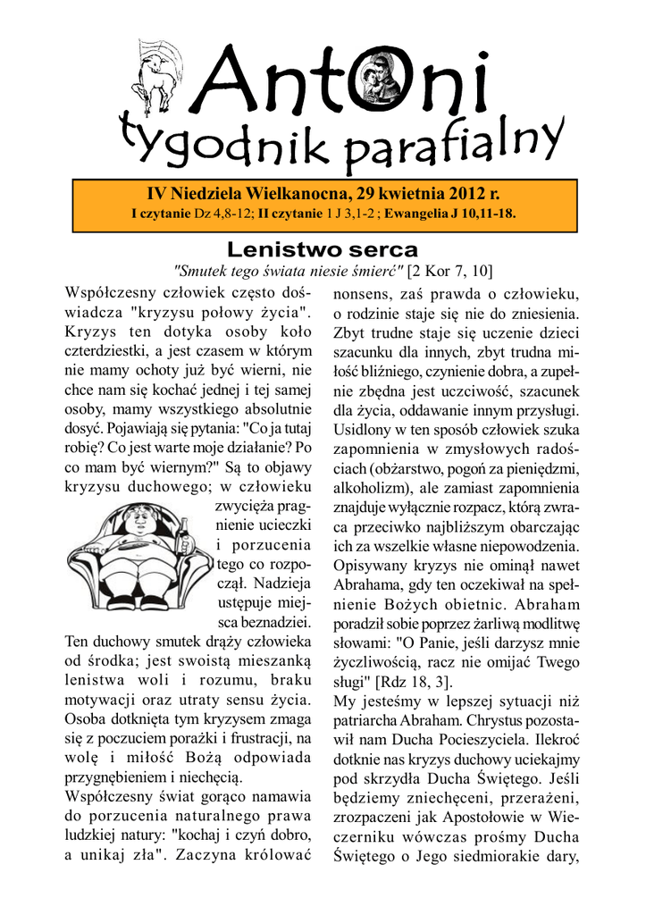AntOni IV Niedziela Wielkanocna, 29 kwietnia 2012 r. I czytanie Dz 4,8-12; II czytanie 1 J 3,1-2 ; Ewangelia J 10,11-18. Lenistwo serca "Smutek tego świata niesie śmierć" [2 Kor 7, 10] Współczesny człowiek często doś- nonsens, zaś prawda o człowieku, wiadcza "kryzysu połowy życia". o rodzinie staje się nie do zniesienia. Kryzys ten dotyka osoby koło Zbyt trudne staje się uczenie dzieci czterdziestki, a jest czasem w którym szacunku dla innych, zbyt trudna minie mamy ochoty już być wierni, nie łość bliźniego, czynienie dobra, a zupełchce nam się kochać jednej i tej samej nie zbędna jest uczciwość, szacunek osoby, mamy wszystkiego absolutnie dla życia, oddawanie innym przysługi. dosyć. Pojawiają się pytania: "Co ja tutaj Usidlony w ten sposób człowiek szuka robię? Co jest warte moje działanie? Po zapomnienia w zmysłowych radośco mam być wiernym?" Są to objawy ciach (obżarstwo, pogoń za pieniędzmi, kryzysu duchowego; w człowieku alkoholizm), ale zamiast zapomnienia zwycięża prag- znajduje wyłącznie rozpacz, którą zwranienie ucieczki ca przeciwko najbliższym obarczając i porzucenia ich za wszelkie własne niepowodzenia. tego co rozpo- Opisywany kryzys nie ominął nawet czął. Nadzieja Abrahama, gdy ten oczekiwał na spełustępuje miej- nienie Bożych obietnic. Abraham sca beznadziei. poradził sobie poprzez żarliwą modlitwę Ten duchowy smutek drąży człowieka słowami: "O Panie, jeśli darzysz mnie od środka; jest swoistą mieszanką życzliwością, racz nie omijać Twego lenistwa woli i rozumu, braku sługi" [Rdz 18, 3]. motywacji oraz utraty sensu życia. My jesteśmy w lepszej sytuacji niż Osoba dotknięta tym kryzysem zmaga patriarcha Abraham. Chrystus pozostasię z poczuciem porażki i frustracji, na wił nam Ducha Pocieszyciela. Ilekroć wolę i miłość Bożą odpowiada dotknie nas kryzys duchowy uciekajmy przygnębieniem i niechęcią. pod skrzydła Ducha Świętego. Jeśli Współczesny świat gorąco namawia będziemy zniechęceni, przerażeni, do porzucenia naturalnego prawa zrozpaczeni jak Apostołowie w Wieludzkiej natury: "kochaj i czyń dobro, czerniku wówczas prośmy Ducha a unikaj zła". Zaczyna królować Świętego o Jego siedmiorakie dary, a w szczególności o dar wiedzy i dar mądrości. Dar wiedzy (umiejętności) wspiera i chroni naszą wierność Bogu. W momentach życiowych kryzysów pozwala nam spojrzeć na wszystko z prostotą i optymizmem. Dar mądrości nadaje sens naszemu życiu, pozwala poznać i pokochać to co umiłował Bóg, czyniąc nas prawdziwie wolnymi. Nie łudźmy się, że damy radę przezwy- ciężyć ów kryzys opierając się tylko na własnych siłach. Szatan odbierze nam nadzieję, potem miłość, dając w zamian lśniące namiastki tego świata, które będą zaledwie nędzną przykrywką olbrzymiej rozpaczy, a ta prowadzić będzie nieuchronnie do śmierci wiecznej, o czym pisał i przestrzegał święty Paweł w liście do Koryntian. Janusz Szwoch. Tekst inspirowany książką Ludovica Lecuru "7 darów Ducha Swiętego" Obrzędy Komunii świętej Liturgia przygotowuje nas do przyjęcia Modlitwy Pańskiej. Wyraża on błaganie Komunii świętej poprzez Modlitwę o uwolnienie całej wspólnoty wiernych Pańską. Porządkuje ona przede wszys- spod mocy zła: „Wybaw nas Panie od tkim naszą relację z Bogiem, do którego zła wszelkiego i obdarz nasze czasy ośmielamy się mówić „Ojcze”. Kolej- pokojem. Wspomóż nas w swoim nym etapem przygotowania jest prośba miłosierdziu, abyśmy zawsze wolni od o chleb powszedni na każdy grzechu i bezpieczni od dzień. Bardzo wcześnie zaczę- EUCHARYSTIA wszelkiego zamętu, pełni to utożsamiać ten chleb nadziei oczekiwali przyjścia z Komunią świętą, o której naszego Zbawiciela, Jezusa Chrystus mówi w Ewangelii Chrystusa”. Świętego Jana: „Jam jest chleb To wołanie o pokój („obdarz życia, który zstąpił z nieba. nasze czasy pokojem”) Jeśli kto spożywa ten chleb, przygotowuje do przyjęcia będzie żył na wieki”. łaski, którą daje Chrystus: Kontynuując Ojcze nasz prosimy: „Pokój wam zostawiam, pokój mój „I odpuść nam nasze winy, jako i my wam daję”. Słowa te zostały wypoodpuszczamy naszym winowajcom”. wiedziane w szczególnym kontekście: Jest to przypomnienie, że mając Boga „Wieczorem, owego pierwszego dnia za Ojca jesteśmy braćmi i siostrami tygodnia, tam gdzie przebywali uczniow Chrystusie. wie, gdy drzwi były zamknięte z obawy Zazwyczaj kończymy Ojcze nasz przed Żydami, przyszedł Jezus, stanął mówiąc: Amen. We Mszy świętej pośrodku (Łukasz dodaje: „zatrwożozakończeniem jest aklamacja zgroma- nym i wylęknionym zdało się, że widzą dzonego ludu: „Bo Twoje jest Królestwo ducha”) i rzekł do nich: Pokój wam”. i potęga i chwała na wieki”. Jest ona Czytając Janowy opis można niemalże odpowiedzią na embolizm, będący odczuć namacalność tego „pokoju”. Oto rozwinięciem ostatniej prośby Chrystus wchodzi w konkretny ludzki dramat (przestraszonych i zawstydzonych apostołów) i wskrzesza ich nadzieję, a więc niejako daje nowe życie. Nie polega ono na tzw. świętym spokoju. Czytając dalej Pismo Święte można zauważyć, że apostołowie, poczynając od Zesłania Ducha Świętego w dniu Pięćdziesiątnicy, nie zaznają już spokoju. „Pokój”, którym zostali obdarzeni, opiera się na zmartwychwstaniu Chrystusa. Uczniowie, widząc Go, mogą włożyć palce w Jego rany, radośnie powtarzając: „O śmierci, gdzie jest twój oścień, gdzie twoje zwycięstwo”? Chrystusowe zwycięstwo nad śmiercią jest najgłębszym źródłem prawdziwego pokoju serca, który trwa pomimo róż- nych życiowych zawirowań. Świadkiem tego jest święty Paweł, który „znosząc wiele cierpień dla Ewangelii” mówi o zwycięstwie: „Któż nas może odłączyć od miłości Chrystusowej? Utrapienie, ucisk czy prześladowanie, głód czy nagość