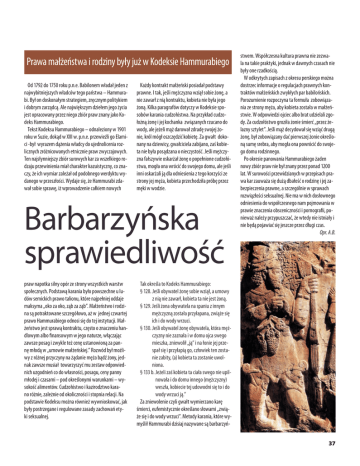 Prawa małżeństwa i rodziny były już w Kodeksie Hammurabiego Od 1792 do 1750 roku p.n.e. Babilonem władał jeden z najwybitniejszych władców tego państwa – Hammurabi. Był on doskonałym strategiem, zręcznym politykiem i dobrym zarządcą. Ale największym dziełem jego życia jest opracowany przez niego zbiór praw znany jako Kodeks Hammurabiego. Tekst Kodeksu Hammurabiego – odnaleziony w 1901 roku w Suzie, dokąd w XIII w. p.n.e. przewieźli go Elamici -był wyrazem dążenia władcy do ujednolicenia rozlicznych zróżnicowanych etnicznie praw zwyczajowych. Ten najsłynniejszy zbiór surowych kar za wszelkiego rodzaju przewinienia miał charakter kazuistyczny, co znaczy, że ich wymiar zależał od podobnego werdyktu wydanego w przeszłości. Wydaje się, że Hammurabi zdawał sobie sprawę, iż wprowadzenie całkiem nowych Każdy kontrakt małżeński posiadał podstawy prawne. I tak, jeśli mężczyzna wziął sobie żonę, a nie zawarł z nią kontraktu, kobieta nie była jego żoną. Kilka paragrafów dotyczy w Kodeksie sposobów karania cudzołóstwa. Na przykład cudzołożną żonę i jej kochanka związanych rzucano do wody, ale jeżeli mąż darował zdradę swojej żonie, król mógł oszczędzić kobietę. Za gwałt dokonany na dziewicy, gwałciciela zabijano, zaś kobieta nie była posądzana o nieczystość. Jeśli mężczyzna fałszywie oskarżał żonę o popełnione cudzołóstwa, mogła ona wrócić do swojego domu, ale jeśli inni oskarżali ją dla odniesienia z tego korzyści ze strony jej męża, kobieta przechodziła próbę przez męki w wodzie. Barbarzyńska sprawiedliwość praw napotka silny opór ze strony wszystkich warstw społecznych. Podstawą karania było powszechne u ludów semickich prawo talionu, które najpełniej oddaje maksyma „oko za oko, ząb za ząb”. Małżeństwo i rodzina są potraktowane szczegółowo, aż w jednej czwartej prawo Hammurabiego odnosi się do tej instytucji. Małżeństwo jest sprawą kontraktu, często o znaczeniu handlowym albo finansowym w jego naturze, włączając zawsze posag i zwykle też cenę ustanowioną za pannę młodą w „umowie małżeńskiej.” Rozwód był możliwy z różnej przyczyny na żądanie męża bądź żony, jednak zawsze musiał towarzyszyć mu zestaw odpowiednich uzgodnień co do własności, posagu, ceny panny młodej i czasami – pod określonymi warunkami – wysokość alimentów. Cudzołóstwo i kazirodztwo karano różnie, zależnie od okoliczności i stopnia relacji. Na podstawie Kodeksu można również wywnioskować, jak były postrzegane i regulowane zasady zachowań etyki seksualnej. stwem. Współczesna kultura prawna nie zezwala na takie praktyki, jednak w dawnych czasach nie były one rzadkością. W odkrytych zapisach z okresu perskiego można dostrzec informacje o regulacjach prawnych kontraktów małżeńskich zwykłych par babilońskich. Porozumienie rozpoczyna ta formuła zobowiązania ze strony męża, aby kobieta została w małżeństwie. W odpowiedzi ojciec albo brat udzielali zgody. Za cudzołóstwo groziła żonie śmierć „przez żelazny sztylet”. Jeśli mąż decydował się wziąć drugą żonę, był zobowiązany dać pierwszej żonie określoną sumę srebra, aby mogła ona powrócić do swojego domu rodzinnego. Po okresie panowania Hammurabiego żaden nowy zbiór praw nie był znany przez ponad 1200 lat. W surowości przewidzianych w przepisach prawa kar zauważa się dużą dbałość o rodzinę i jej zabezpieczenia prawne, a szczególnie w sprawach rozwiązłości seksualnej. Nie ma w nich dosłownego odniesienia do współczesnego nam pojmowania w prawie znaczenia obsceniczności i pornografii, ponieważ należy przypuszczać, że wtedy nie istniały i nie będą pojawiać się jeszcze przez długi czas. Opr. A.B. Tak określa to Kodeks Hammurabiego: § 128. Jeśli obywatel żonę sobie wziął, a umowy z nią nie zawarł, kobieta ta nie jest żoną. § 129. Jeśli żona obywatela na spaniu z innym mężczyzną została przyłapana, zwiąże się ich i do wody wrzuci. § 130. Jeśli obywatel żonę obywatela, która mężczyzny nie zaznała i w domu ojca swego mieszka, zniewolił „ją” i na łonie jej przespał się i przyłapią go, człowiek ten zostanie zabity, (a) kobieta ta zostanie uwolniona. § 133 b. Jeżeli zaś kobieta ta ciała swego nie upilnowała i do domu innego (mężczyzny) weszła, kobiecie tej udowodni się to i do wody wrzuci ją.” Za zniewolenie czyli gwałt wymierzano karę śmierci, eufemistycznie określano słowami „zwiąże się i do wody wrzuci”. Metody karania, które wymyślił Hammurabi dzisiaj nazywane są barbarzyń37