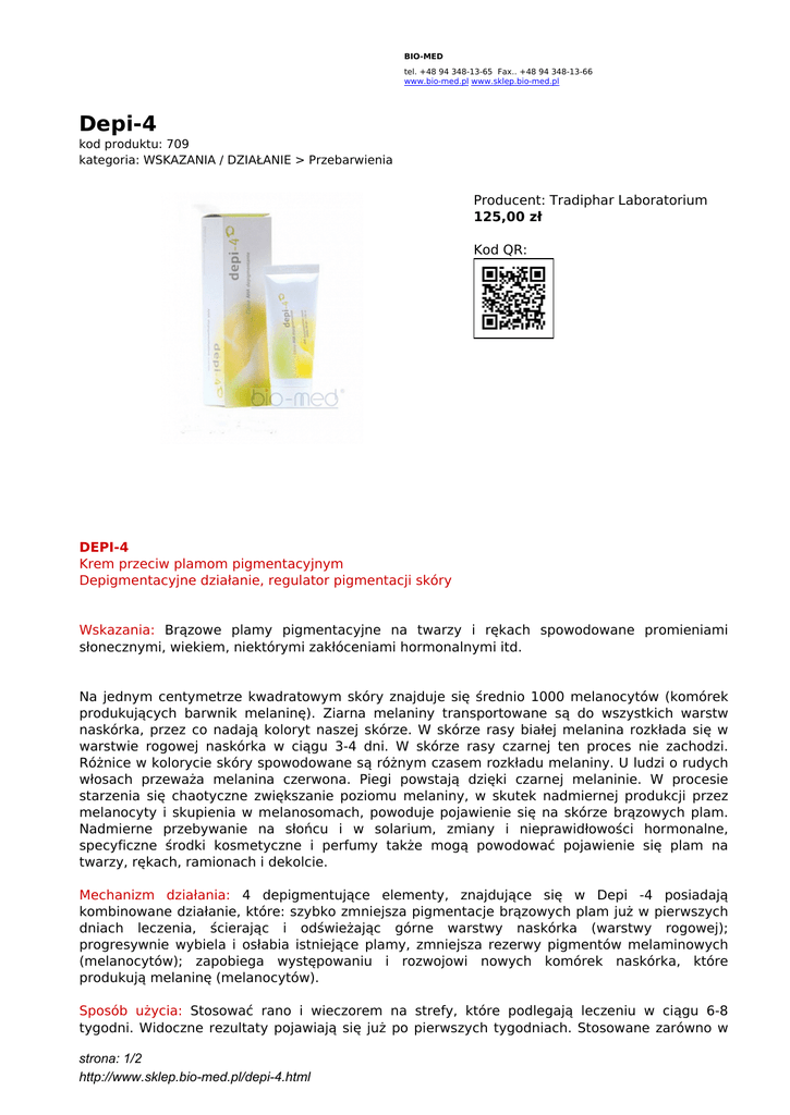 BIO-MED tel. +48 94 348-13-65 Fax.. +48 94 348-13-66 www.bio-med.pl www.sklep.bio-med.pl Depi-4 kod produktu: 709 kategoria: WSKAZANIA / DZIAŁANIE > Przebarwienia Producent: Tradiphar Laboratorium 125,00 zł Kod QR: DEPI-4 Krem przeciw plamom pigmentacyjnym Depigmentacyjne działanie, regulator pigmentacji skóry Wskazania: Brązowe plamy pigmentacyjne na twarzy i rękach spowodowane promieniami słonecznymi, wiekiem, niektórymi zakłóceniami hormonalnymi itd. Na jednym centymetrze kwadratowym skóry znajduje się średnio 1000 melanocytów (komórek produkujących barwnik melaninę). Ziarna melaniny transportowane są do wszystkich warstw naskórka, przez co nadają koloryt naszej skórze. W skórze rasy białej melanina rozkłada się w warstwie rogowej naskórka w ciągu 3-4 dni. W skórze rasy czarnej ten proces nie zachodzi. Różnice w kolorycie skóry spowodowane są różnym czasem rozkładu melaniny. U ludzi o rudych włosach przeważa melanina czerwona. Piegi powstają dzięki czarnej melaninie. W procesie starzenia się chaotyczne zwiększanie poziomu melaniny, w skutek nadmiernej produkcji przez melanocyty i skupienia w melanosomach, powoduje pojawienie się na skórze brązowych plam. Nadmierne przebywanie na słońcu i w solarium, zmiany i nieprawidłowości hormonalne, specyficzne środki kosmetyczne i perfumy także mogą powodować pojawienie się plam na twarzy, rękach, ramionach i dekolcie. Mechanizm działania: 4 depigmentujące elementy, znajdujące się w Depi -4 posiadają kombinowane działanie, które: szybko zmniejsza pigmentacje brązowych plam już w pierwszych dniach leczenia, ścierając i odświeżając górne warstwy naskórka (warstwy rogowej); progresywnie wybiela i osłabia istniejące plamy, zmniejsza rezerwy pigmentów melaminowych (melanocytów); zapobiega występowaniu i rozwojowi nowych komórek naskórka, które produkują melaninę (melanocytów). Sposób użycia: Stosować rano i wieczorem na strefy, które podlegają leczeniu w ciągu 6-8 tygodni. Widoczne rezultaty pojawiają się już po pierwszych tygodniach. Stosowane zarówno w strona: 1/2 http://www.sklep.bio-med.pl/depi-4.html procesie przygotowania do peelingu, jak i samodzielnie. Równoczesne stosowanie EXFOLDERM wacików albo EXFOLDERM kremu przyspiesza efekt.. Nie ma przeciwwskazań do stosowania tego preparatu, efektów ubocznych nie zanotowano. Skład: Zawiera 4 czynniki depigmentujące: Ekstrakt z rezedy żółtawej - 5% Ekstrakt z jeżyn -1% Kwas glikolowy - 7% Flawonoidy z owoców cytrusowych DFMM 1745 (cytroflowonuad) - 2%. strona: 2/2 http://www.sklep.bio-med.pl/depi-4.html