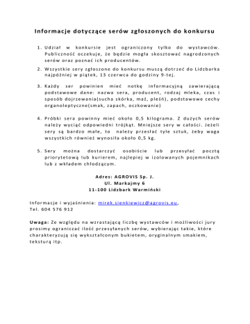 Info rmac je dotycząc e seró w zgłoszo nyc h do ko nkursu 1. Udział w konkursie jest ograniczony tylko do wystawców. Publiczność oczekuje, że będzie mogła skosztować nagrodzonych serów oraz poznać ich producentów. 2. Wszystkie sery zgłoszone do konkursu muszą dotr zeć do Lidzbarka najpóźniej w piątek, 13 czerwca do godziny 9-tej. 3. Każdy ser powinien mieć notkę informacyjną zawierającą podstawowe dane: nazwa sera, producent, rodzaj mleka, czas i sposób dojrzewania(sucha skórka, maź, pleśń) , podstawowe cechy organoleptyczne(smak, zapach, oczkowanie) 4. Próbki sera powinny mieć około 0,5 kilograma. Z dużych serów należy wyciąć odpowiedni trójkąt. Mniejsze sery w całości. Jeżeli sery są bardzo małe, to należy przesłać tyle sztuk, żeby waga wszystkich również wynosiła około 0,5 kg. 5. Sery można dostarczyć osobiście lub przesyłać pocztą priorytetową lub kurierem, najlepiej w izolowanych pojemnikach lub z wkładem chłodzącym. Adres: AGROVIS Sp. J. Ul. Markajmy 6 11-100 Lidzbark Warmiński Informacje i wyjaśnienia: [email protected] , Tel. 604 576 912 Uwaga: Ze względu na wzrastającą liczbę wystawców i możliwości jury prosimy ograniczać ilość przesyłanych serów, wybierając takie, które charakteryzują się wykształconym bukietem, oryginalnym smakiem, teksturą itp.