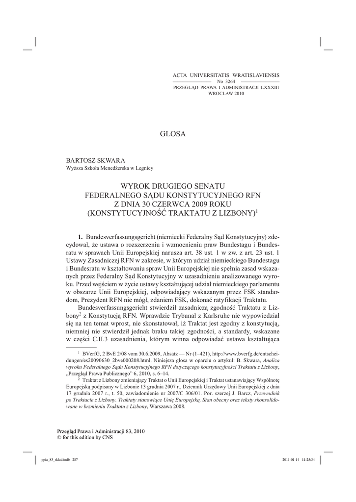 ACTA UNIVERSITATIS WRATISLAVIENSIS ———————— No 3264 ———————— PRZEGLĄD PRAWA I ADMINISTRACJI LXXXIII WROCŁAW 2010 GLOSA BARTOSZ SKWARA Wyższa Szkoła Menedżerska w Legnicy WYROK DRUGIEGO SENATU FEDERALNEGO SĄDU KONSTYTUCYJNEGO RFN Z DNIA 30 CZERWCA 2009 ROKU (KONSTYTUCYJNOŚĆ TRAKTATU Z LIZBONY)1 1. Bundesverfassungsgericht (niemiecki Federalny Sąd Konstytucyjny) zdecydował, że ustawa o rozszerzeniu i wzmocnieniu praw Bundestagu i Bundesratu w sprawach Unii Europejskiej narusza art. 38 ust. 1 w zw. z art. 23 ust. 1 Ustawy Zasadniczej RFN w zakresie, w którym udział niemieckiego Bundestagu i Bundesratu w kształtowaniu spraw Unii Europejskiej nie spełnia zasad wskazanych przez Federalny Sąd Konstytucyjny w uzasadnieniu analizowanego wyroku. Przed wejściem w życie ustawy kształtującej udział niemieckiego parlamentu w obszarze Unii Europejskiej, odpowiadający wskazanym przez FSK standardom, Prezydent RFN nie mógł, zdaniem FSK, dokonać ratyfikacji Traktatu. Bundesverfassungsgericht stwierdził zasadniczą zgodność Traktatu z Lizbony2 z Konstytucją RFN. Wprawdzie Trybunał z Karlsruhe nie wypowiedział się na ten temat wprost, nie skonstatował, iż Traktat jest zgodny z konstytucją, niemniej nie stwierdził jednak braku takiej zgodności, a standardy, wskazane w części C.II.3 uzasadnienia, którym winna odpowiadać ustawa kształtująca 1 BVerfG, 2 BvE 2/08 vom 30.6.2009, Absatz — Nr (1–421), http://www.bverfg.de/entscheidungen/es20090630_2bve000208.html. Niniejsza glosa w oparciu o artykuł: B. Skwara, Analiza wyroku Federalnego Sądu Konstytucyjnego RFN dotyczącego konstytucyjności Traktatu z Lizbony, „Przegląd Prawa Publicznego” 6, 2010, s. 6–14. 2 Traktat z Lizbony zmieniający Traktat o Unii Europejskiej i Traktat ustanawiający Wspólnotę Europejską podpisany w Lizbonie 13 grudnia 2007 r., Dziennik Urzędowy Unii Europejskiej z dnia 17 grudnia 2007 r., t. 50, zawiadomienie nr 2007/C 306/01. Por. szerzej J. Barcz, Przewodnik po Traktacie z Lizbony. Traktaty stanowiące Unię Europejską. Stan obecny oraz teksty skonsolidowane w brzmieniu Traktatu z Lizbony, Warszawa 2008. Przegląd Prawa i Administracji 83, 2010 © for this edition by CNS ppia_83_sklad.indb 287 2011-01-14 11:25:34 288 GLOSA udział niemieckiego parlamentu w obszarze integracji europejskiej, są — w myśl argumentacji Federalnego Sądu Konstytucyjnego — niezbędnym warunkiem jednoczesnego funkcjonowania obecnej Ustawy Zasadniczej i Traktatu z Lizbony3. Rozstrzygnięcie stwierdzające konstytucyjność Traktatu z Lizbony było wyrokiem Federalnego Sądu Konstytucyjnego RFN komentowanym natychmiast po jego ogłoszeniu4. Sprzeciw niemieckiego Sądu Konstytucyjnego przekreśliłby kolejną próbę dokonania reformy europejskiej struktury integracyjnej5, zwłaszcza iż Prezydent RFN postanowił zaczekać z ratyfikacją Traktatu do momentu rozstrzygnięcia sprawy jego konstytucyjności. Pozytywne dla Traktatu lizbońskiego rozstrzygnięcie Trybunału z Karlsruhe stało się przykładem dla innych europejskich sądów konstytucyjnych6, dotychczas na bieżąco śledzących orzecznictwo Bundesverfassungsgericht, zwłaszcza często przytaczających w uzasadnieniach swych orzeczeń jego wyroki dotyczące relacji prawa wspólnotowego względem wewnętrznego porządku prawnego państwa członkowskiego7. 3 listopada 2009 r. konstytucyjność Traktatu z Lizbony stwierdził czeski Trybunał Konstytucyjny. Niemal dokładnie rok później, 10 listopada 2010 r., konstytucyjność Traktatu z Lizbony stwierdził także polski Trybunał Konstytucyjny. W chwili gdy powstaje niniejsza glosa, nie znamy wprawdzie pełnego brzmienia uzasadnienia do przedmiotowego wyroku (sygn. K 32/09), niemniej z komunikatu prasowego zamieszczonego na stronie internetowej polskiego TK można odczytać intencje zbieżne z prezentowaną poniżej linią orzeczniczą Federalnego Sądu Konstytucyjnego RFN. Wyprzedzając nieco analizę samego wyroku Federalnego 3 Por. B. Skwara, Analiza..., s. 6, 7. Zob. na przykład K. Działocha, B. Skwara, Współczesne dylematy prawotwórstwa egzekutywy w RFN, „Przegląd Sejmowy” 95, 2009, nr 6, s. 99. Por. także B. Skwara, Analiza..., s. 6–14; H. Scholler, Traktat z Lizbony i wyrok Federalnego Sądu Konstytucyjnego RFN, [w:] „Ius est ars boni et aequi”. Księga jubileuszowa z okazji 5-lecia Wydziału Prawa Wyższej Szkoły Menedżerskiej w Legnicy, red. N. Szczęch, Legnica 2010, s. 571 n.; J. Barcz, Wyrok Federalnego Trybunału Konstytucyjnego z dnia 30 czerwca 2009 r. w sprawie ratyfikacji Traktatu z Lizbony, „Przegląd Sejmowy” nr 6(95)/2009, s. 255–261. 5 „Traktat z Lizbony jest drugą, po tzw. wschodnim rozszerzeniu Wspólnot Europejskich, próbą dokonania zasadniczej reformy ustrojowej europejskiej struktury integracyjnej, zmierzającą w pierwszej kolejności do nadania Unii Europejskiej podmiotowości prawnomiędzynarodowej i osobowości prawnej, jak również do zastąpienia jednolitą Unią Europejską dotychczasowych rozczłonkowanych struktur integracyjnych”. Por. szerzej B. Skwara, Analiza..., s. 10–11. 6 Dnia 3 listopada konstytucyjność Traktatu z Lizbony stwierdził czeski Trybunał Konstytucyjny, w następstwie czego podpis pod Traktatem — jako ostatni przywódca państwa członkowskiego Unii Europejskiej — złożył prezydent Václav Klaus — por. Traktat zgodny z konstytucją, http://www.rp.pl/artykul/386822.html. Por. szerzej H. Scholler, Traktat z Lizbony..., s. 571, 572. 7 Por. wyroki FSK: z 29 maja 1974 r., „Solange I” (BVerfGE 37, 271 ff.) oraz z 22 października 1986 r., „Solange II” (2 BvR 197/83) i przykładowo odwołanie do treści tych orzeczeń w uzasadnieniu wyroku polskiego Trybunału Konstytucyjnego w sprawie Europejskiego Nakazu Aresztowania (wyrok z dnia 27 kwietnia 2005 r., sygn. P 1/05). Na temat etapów ewolucji niemieckiego orzecznictwa konstytucyjnego poświęconego integracji
