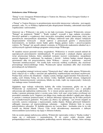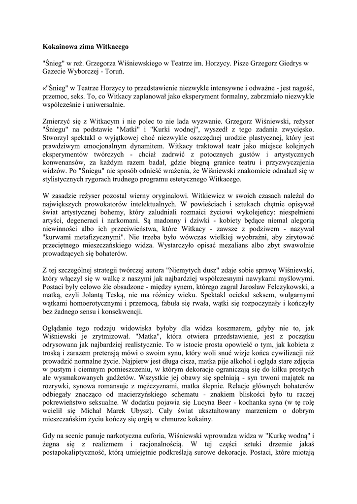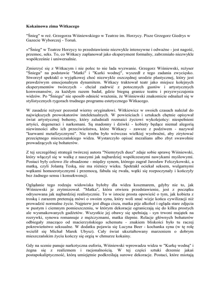 Kokainowa zima Witkacego "Śnieg" w reż. Grzegorza Wiśniewskiego w Teatrze im. Horzycy. Pisze Grzegorz Giedrys w Gazecie Wyborczej - Toruń. «"Śnieg" w Teatrze Horzycy to przedstawienie niezwykle intensywne i odważne - jest nagość, przemoc, seks. To, co Witkacy zaplanował jako eksperyment formalny, zabrzmiało niezwykle współcześnie i uniwersalnie. Zmierzyć się z Witkacym i nie polec to nie lada wyzwanie. Grzegorz Wiśniewski, reżyser "Śniegu" na podstawie "Matki" i "Kurki wodnej", wyszedł z tego zadania zwycięsko. Stworzył spektakl o wyjątkowej choć niezwykle oszczędnej urodzie plastycznej, który jest prawdziwym emocjonalnym dynamitem. Witkacy traktował teatr jako miejsce kolejnych eksperymentów twórczych - chciał zadrwić z potocznych gustów i artystycznych konwenansów, za każdym razem badał, gdzie biegną granice teatru i przyzwyczajenia widzów. Po "Śniegu" nie sposób odnieść wrażenia, że Wiśniewski znakomicie odnalazł się w stylistycznych rygorach trudnego programu estetycznego Witkacego. W zasadzie reżyser pozostał wierny oryginałowi. Witkiewicz w swoich czasach należał do największych prowokatorów intelektualnych. W powieściach i sztukach chętnie opisywał świat artystycznej bohemy, który zaludniali rozmaici życiowi wykolejeńcy: niespełnieni artyści, degeneraci i narkomani. Są madonny i dziwki - kobiety będące niemal alegorią niewinności albo ich przeciwieństwa, które Witkacy - zawsze z podziwem - nazywał "kurwami metafizycznymi". Nie trzeba było wówczas wielkiej wyobraźni, aby zirytować przeciętnego mieszczańskiego widza. Wystarczyło opisać mezalians albo zbyt swawolnie prowadzących się bohaterów. Z tej szczególnej strategii twórczej autora "Niemytych dusz" zdaje sobie sprawę Wiśniewski, który włączył się w walkę z naszymi jak najbardziej współczesnymi nawykami myślowymi. Postaci były celowo źle obsadzone - między synem, którego zagrał Jarosław Felczykowski, a matką, czyli Jolantą Teską, nie ma różnicy wieku. Spektakl ociekał seksem, wulgarnymi wątkami homoerotycznymi i przemocą, fabuła się rwała, wątki się rozpoczynały i kończyły bez żadnego sensu i konsekwencji. Oglądanie tego rodzaju widowiska byłoby dla widza koszmarem, gdyby nie to, jak Wiśniewski je zrytmizował. "Matka", która otwiera przedstawienie, jest z początku odrysowana jak najbardziej realistycznie. To w istocie prosta opowieść o tym, jak kobieta z troską i zarazem pretensją mówi o swoim synu, który woli snuć wizje końca cywilizacji niż prowadzić normalne życie. Najpierw jest długa cisza, matka pije alkohol i ogląda stare zdjęcia w pustym i ciemnym pomieszczeniu, w którym dekoracje ograniczają się do kilku prostych ale wysmakowanych gadżetów. Wszystkie jej obawy się spełniają - syn trwoni majątek na rozrywki, synowa romansuje z mężczyznami, matka ślepnie. Relacje głównych bohaterów odbiegały znacząco od macierzyńskiego schematu - znakiem bliskości było tu raczej pokrewieństwo seksualne. W dodatku pojawia się Lucyna Beer - kochanka syna (w tę rolę wcielił się Michał Marek Ubysz). Cały świat ukształtowany marzeniem o dobrym mieszczańskim życiu kończy się orgią w chmurze kokainy. Gdy na scenie panuje narkotyczna euforia, Wiśniewski wprowadza widza w "Kurkę wodną" i żegna się z realizmem i racjonalnością. W tej części sztuki drzemie jakaś postapokaliptyczność, którą umiejętnie podkreślają surowe dekoracje. Postaci, które miotają się bezładnie po scenie, wyglądają jak jedyni ocaleni z nieznanej katastrofy i ich jedyną rozrywką jest coś w rodzaju gry towarzyskiej. W tym fikcyjnym porządku każdy przybiera taką maską, jaką sobie zażyczy - może stać się dzieckiem lub rozwiązłą kobietą, może umrzeć, a następnie w cudowny sposób powrócić między żywych. Ten świat musi ponownie się rozpaść, bo jego zasadą jest dążenie do ostatecznej katastrofy. Choć od początku wiadomo, że Kurka Wodna umrze, że taki będzie jej los, zakończenie spektaklu zaskakuje. "Śniegu" nie da się w pełni zrozumieć bez przywołania Czystej Formy - koncepcji estetycznej Witkacego, która polega na nasyceniu dzieł środkami mającymi wywołać w widzu dreszcz metafizyczny. I nieważna jest akcja, fabuła, zawartość ideowa; ważny jest ten efekt. W przedstawieniu Horzycy to, co Witkacy dostrzegał w teatrze jedynie w sferze potencjalności, staje przed naszymi oczami. Dlatego publiczność, wybierając się na to widowisko, powinna porzucić przyzwyczajenie do historii, które daje się streścić w kilku zdaniach. "Śnieg" jest złym i paranoicznym tripem, zbyt intensywnym i zbyt szybkim, aby ktokolwiek mógł za nim nadążyć.» "Kokainowa zima Witkacego" Grzegorz Giedrys Gazeta Wyborcza Toruń nr 31 08-02-2011