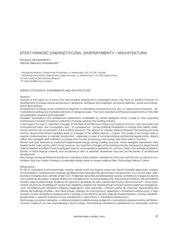 Efektywność energetyczna, eksperymenty i architektura Krystyna Januszkiewicz* Henryk Katowicz-Kowalewski** * Wydział Architektury, Politechnika Poznańska, ul. Nieszawska 13C, 61-021 Poznań ** Wydział Budownictwa, Politechnika Częstochowska, ul. Akademicka 3, 42-200 Częstochowa *E-mail: [email protected] **E-mail: [email protected] ENERGY EFFICIENCY, EXPERIMENTS AND ARCHITECTURE Abstract Authors of this paper try to prove that technological development of energetic sector may have no positive influence on development of energy-saving architecture if designers: architects and engineers will ignore aesthetic, social and philosophical assumptions. Development of energy active architecture depends on theoretical achievements but also on experimental practices - demonstrative buildings are inevitable elements of design process. The most important architectural experiments on this field are presented, analyzed and evaluated. Energetic explorations and architectural experiments undertaken by recent designers bring a range of new, surprising architectural concepts focused on reduction of energy used by the building industry. It also opens the way to important changes on the field of architecture: brings new systems of forms, new structures and compositional rules, new iconography and – in consequence – forces potential inhabitants to change their habits, preferences and the way of operation of the building structure. The attempt to change relations between the building structure and it’s natural environment inevitably leads to changes of the relation Nature – Culture. The image of the house, fixed in popular consciousness, is radically transformed – especially in case of uncompromising architectural experiments: objects called zero-energetic (self-sufficient) or energy-plus houses (producing more energy than they need to function). Recent and past attempts to implement experimental energy-saving building structure, where energetic parameters were treated as the main priority, didn’t bring, however, any important changes of the building industry, because the experimental objects (treated as patterns and prototypes) were an unacceptable proposition for common taste of an average inhabitant. Excess of technological creativity and simultaneous lack of aesthetic awareness may also be the barrier of architectural development. New energy-saving architecture should be a manifesto of the creative coexistence of the new with the old, as well as a confirmation that only holistic thinking in sustainable design leads to proper relations Man-Technology-Nature-Culture. Streszczenie W XXI w. imperatyw zrównoważonego rozwoju stawia nowe wymagania wobec już niemal wszelkiej aktywności ludzkiej. Od architektury i budownictwa oczekuje się efektywności ekologicznej, sprawności i skuteczności, a co za tym idzie, efektywności energetycznej i obniżki emisji CO2. Podejmuje się próbę przedstawienia rozwoju architektury energooszczędnej oraz rozpatruje się wpływ urządzeń aktywnych energetycznie na stronę estetyczną i kulturową architektury. Dla architektów bowiem pojęcie efektywnego działania nie ogranicza się jednak do sfery założeń techniczno-ekonomicznych i oceny parametrów skutecznie określających sprawność działania urządzeń lub niezawodność funkcjonowania systemów energetycznych. Architektura jest obszarem działania angażującym wiele dyscyplin, z których żadna nie może być zignorowana bez szkody dla finalnego rezultatu. Jest także sztuką i dlatego nie może porzucić zagadnień o charakterze estetycznym. Z tego powodu na polu architektury eksperymenty z energią w nieunikniony sposób stają się eksperymentami z formą, kształtem, przestrzenią, a wartości liczbowe muszą współistnieć z wartościami o charakterze estetycznym. Zachowując powyższe założenia, w artykule poddano analizie szereg podjętych w przeszłości eksperymentów architektonicznych mających na celu racjonalizację zużycia energii, minimalizację szkodliwych oddziaływań na środowisko natural- ARCHITECTURAE et ARTIBUS - 4/2013 21 K. JANUSZKIEWICZ, H. KATOWICZ-KOWALEWSKI ne, sprawdzenie skuteczności funkcjonowania nowych systemów pozyskiwania energii ze źródeł odnawialnych, a także zbadanie reakcji ludzi (mieszkańców i użytkowników) na nowe sposoby kształtowania architektury i środowiska człowieka. Przedstawione przykłady dowodzą także, że tylko myślenie holistyczne w projektowaniu zrównoważonym prowadzi do właściwych relacji Człowiek-Technologia-Natura-Kultura. Keywords: architecture; energy; efficiency; experiment Słowa kluczowe: architektura; efektywność; energia; eksperyment WPROWADZENIE W XXI w. imperatyw zrównoważonego rozwoju stawia nowe wymagania wobec już niemal wszelkiej aktywności ludzkiej. Od architektury i budownictwa oczekuje się efektywności ekologicznej, sprawności i skuteczności, a co za tym idzie, efektywności energetycznej i obniżki emisji CO2. Z badań nad globalnym zużyciem surowców i wytwarzanej energii wynika, że niemal połowę pochłania sektor budownictwa. To stawia architekturę na pierwszej linii zmagań o zmniejszenie ich zużycia i ochronę środowiska naturalnego Ziemi. Sektor budownictwa stał się zatem wielkim polem doświadczalnym, co dla architektury oznacza także poszukiwanie nowych systemów form, nowych struktur i metod projektowania. Architekci mogą zatem realnie wpływać na ekologiczną jakość środowiska życia człowieka. Wiele krajów wprowadziło już nowe wymogi dotyczące efektywności budowli i rozwiązań urbanistycznych, kładąc nacisk na ekologię, czyli jedność człowieka ze środowiskiem. Aby to osiągać, architektura sięgnęła po metody naukowe właściwe dla innych dziedzin. Dokonuje się zatem wymiana idei i metod z takimi dyscyplinami, jak matematyka, fizyka, biologia i chemia. Powstają nowe rozwiązania techniczne i technologiczne, które służą pozyskiwaniu en