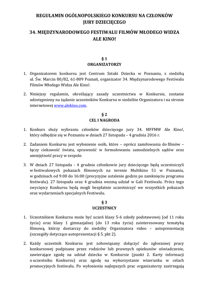 REGULAMIN OGÓLNOPOLSKIEGO KONKURSU NA CZŁONKÓW JURY DZIECIĘCEGO 34. MIĘDZYNARODOWEGO FESTIWALU FILMÓW MŁODEGO WIDZA ALE KINO! §1 ORGANIZATORZY 1. Organizatorem konkursu jest Centrum Sztuki Dziecka w Poznaniu, z siedzibą ul. Św. Marcin 80/82, 61-809 Poznań, organizator 34. Międzynarodowego Festiwalu Filmów Młodego Widza Ale Kino!. 2. Niniejszy regulamin, określający zasady uczestnictwa w Konkursie, zostanie udostępniony na żądanie uczestników Konkursu w siedzibie Organizatora i na stronie internetowej www.alekino.com. §2 CEL I NAGRODA 1. Konkurs służy wybraniu członków dziecięcego jury 34. MFFMW Ale Kino!, który odbędzie się w Poznaniu w dniach 27 listopada – 4 grudnia 2016 r. 2. Zadaniem Konkursu jest wyłonienie osób, które – oprócz zamiłowania do filmów – łączy ciekawość świata, sprawność w formułowaniu samodzielnych sądów oraz umiejętność pracy w zespole. 3. W dniach 27 listopada - 4 grudnia członkowie jury dziecięcego będą uczestniczyli w festiwalowych pokazach filmowych na terenie Multikino 51 w Poznaniu, w godzinach od 9:00 do 16:00 (precyzyjne ustalenie godzin po zamknięciu programu festiwalu). 27 listopada oraz 4 grudnia wezmą udział w Gali Festiwalu. Prócz tego zwycięzcy Konkursu będą mogli bezpłatnie uczestniczyć we wszystkich pokazach oraz wydarzeniach specjalnych Festiwalu. §3 UCZESTNICY 1. Uczestnikiem Konkursu może być uczeń klasy 5-6 szkoły podstawowej (od 11 roku życia) oraz klasy 1 gimnazjalnej (do 13 roku życia) zainteresowany tematyką filmową, którzy dostarczy do siedziby Organizatora video – autoprezentację (szczegóły dotyczące autoprezentacji § 5. pkt 2). 2. Każdy uczestnik Konkursu jest zobowiązany dołączyć do zgłoszonej pracy konkursowej podpisane przez rodziców lub prawnych opiekunów oświadczenie, zawierające zgodę na udział dziecka w Konkursie (punkt 2. Karty informacji o uczestniku Konkursu) oraz zgodę na wykorzystanie wizerunku w celach promocyjnych festiwalu. Po wyłonieniu najlepszych prac organizatorzy zastrzegają sobie prawo rozmowy z rodzicami lub prawnymi opiekunami uczestników w celu dokładnego omówienia zasad pracy dziecięcego jury festiwalu. §4 PRAWA AUTORSKIE I WIZERUNEK UCZESTNIKÓW 1. Uczestnik Konkursu wyraża zgodę na korzystanie przez Organizatora z autoprezentacji stworzonych przez Uczestnika w związku z festiwalem. Zgoda taka jest równoznaczna z udzieleniem Organizatorowi nieodpłatnej, niewyłącznej licencji na użycie prezentacji w celach informacyjnych i promocyjnych związanych z działalnością Centrum Sztuki Dziecka w Poznaniu na czas nieoznaczony, ze szczególnym uwzględnieniem zwielokrotniania utworów, zapisu na dowolnym nośniku oraz dokonywania opracowań utworu (wykonywanie praw zależnych). Zgody takiej udziela rodzic lub opiekun prawny małoletniego. 2. Akceptacja Regulaminu jest równoznaczna z udzieleniem nieodpłatnego zezwolenia na nagrywanie, fotografowanie, filmowanie lub dokonywanie innego rodzaju zapisu wizerunku Uczestnika. §5 ZASADY UCZESTNICTWA I PRZEBIEG KONKURSU 1. Udział w konkursie mogą zgłosić dzieci lub w nich imieniu nauczyciele, rodzice lub prawni opiekunowie. 2. Zadanie konkursowe polega na stworzeniu przez ucznia samodzielnej, indywidualnej (praca nie może być zgłoszona przez kilku uczestników) i oryginalnej prezentacji w postaci nagrania video w formie pliku bądź formacie DVD lub Bluray. a) Elementy prezentacji: temat prezentacji: „Czy wyjście do kina wymaga przygotowania?”, czas trwania – max. 1 minuta (prezentacje, które przekroczą 1minutę będą odrzucane z przyczyn formalnych) przedstawienie sylwetki kandydata (kandydat musi być widoczny podczas nagrania), wypowiedź kandydata uzasadniająca czy wyjście do kina wymaga przygotowania b) Kryteria oceny prezentacji: samodzielność, oryginalność, spójność wypowiedzi, pomysłowość, otwartość, umiejętność argumentowania i przekonywania do swojego stanowiska, estetyka i atrakcyjność prezentacji. c) Wymagania techniczne i organizacyjne: I. prezentacja powinna być przygotowana w formie pliku bądź formacie DVD lub Bluray (max 500 MB). II. zgłaszający musi dysponować prawem do wykorzystanych w filmie utworów muzycznych; III. zgłoszony film nie może zawierać treści obraźliwych i wulgarnych, naruszać dóbr osobistych i praw autorskich osób trzecich; IV. w przypadku zgłoszenia filmu z naruszeniem powyższych punktów II. i III. zgłaszający zobowiązuje się do pokrycia roszczeń osób trzecich wobec Organizatora; V. każdy zgłaszający może zgłosić tylko jedną autoprezentację; VI. w konkursie mogą uczestniczyć wyłącznie osoby, które nigdy wcześniej nie były członkami Jury Dziecięcego MFFMW Ale Kino! 3. Do prezentacji należy dołączyć poprawnie wypełnioną Kartę informacji (dostępna na stronie www.alekino.com) o uczestniku Konkursu (brak Karty spowoduje odrzucenie zgłoszenia z przyczyn formalnych). 4. Nagraną prezentację oraz Kartę informacji należy dostarczyć na adres e-mail [email protected], w tytule wiadomości wpisując „Jury dziecięce – konkurs” lub wysłać poprzez serwis internetowy umożliwiający przesyłanie plików (w przypadku przesyłania pracy pocztą elektroniczną, konieczne jest dołączenie scanu Karty informacji wraz z podpisaną przez rodziców lub prawnych opiekunów zgodą na udział dziecka w konkursie), lub pocztą na adres: Centrum Sztuki Dziecka w Poznaniu 34. MFFMW „ALE KINO!” ul. Św. Marcin 80/82, pok.302 61-809 Poznań „Jury dziecięce – konkurs” 5. Prezentacje zostaną wykorzystane na potrzeby przeprowadzenia konkursu oraz mogą być rozpowszechniane w celach promocyjnych 34. MFFMW Ale Kino! 6. Termin dostarczenia prac: od 15 lipca do 2 października 2016 r. (z wyjątkiem uczestników Festiwalu Wędrujące Ale Kino!, którzy mogą nadsyłać swoje prace w terminie od 1 października do 25 października 2016r.) 7. Członków Komisji Konk
