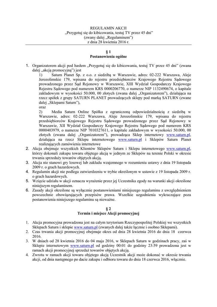 REGULAMIN AKCJI „Przygotuj się do kibicowania, testuj TV przez 45 dni” (zwany dalej „Regulaminem”) z dnia 28 kwietnia 2016 r. §1 Postanowienia ogólne 1. Organizatorem akcji pod hasłem „Przygotuj się do kibicowania, testuj TV przez 45 dni” (zwana dalej „akcją promocyjną”) jest 1) Saturn Planet Sp. z o.o. z siedzibą w Warszawie, adres: 02-222 Warszawa, Aleje Jerozolimskie 179, wpisana do rejestru przedsiębiorców Krajowego Rejestru Sądowego prowadzonego przez Sąd Rejonowy w Warszawie, XIII Wydział Gospodarczy Krajowego Rejestru Sądowego pod numerem KRS 0000206770, o numerze NIP 1132490674, o kapitale zakładowym w wysokości 50.000, 00 złotych (zwana dalej „Organizatorem”), działająca na rzecz spółek z grupy SATURN PLANET prowadzących sklepy pod marką SATURN (zwane dalej „Sklepami Saturn”), oraz 2) Media Saturn Online Spółka z ograniczoną odpowiedzialnością z siedzibą w Warszawie, adres: 02-222 Warszawa, Aleje Jerozolimskie 179, wpisana do rejestru przedsiębiorców Krajowego Rejestru Sądowego prowadzonego przez Sąd Rejonowy w Warszawie, XII Wydział Gospodarczy Krajowego Rejestru Sądowego pod numerem KRS 0000403979, o numerze NIP 7010327611, o kapitale zakładowym w wysokości 50.000, 00 złotych (zwana dalej „Organizatorem”), prowadząca Sklep internetowy www.saturn.pl, działająca na rzecz Sklepu internetowego www.saturn.pl i Sklepów Saturn Planet realizujących zamówienia internetowe 2. Akcja obejmuje wszystkich Klientów Sklepów Saturn i Sklepu internetowego www.saturn.pl, którzy dokonali zakupu towaru objętego akcją w jednym ze Sklepów na terenie Polski w okresie trwania sprzedaży towarów objętych akcją. 3. Akcja nie stanowi gry losowej lub zakładu wzajemnego w rozumieniu ustawy z dnia 19 listopada 2009 r. o grach hazardowych. 4. Regulamin akcji nie podlega zatwierdzeniu w trybie określonym w ustawie z 19 listopada 2009 r. o grach hazardowych. 5. Wzięcie udziału w akcji oznacza wyrażenie przez jej Uczestnika zgody na warunki akcji określone niniejszym regulaminem. 6. Zasady akcji określone są wyłącznie postanowieniami niniejszego regulaminu z uwzględnieniem powszechnie obowiązujących przepisów prawa. Wszelkie uzgodnienia wykraczające poza postanowienia niniejszego regulaminu są nieważne. §2 Termin i miejsce Akcji promocyjnej 1. Akcja promocyjna prowadzona jest na całym terytorium Rzeczypospolitej Polskiej we wszystkich Sklepach Saturn i sklepie www.saturn.pl (zwanych dalej także łącznie i osobno Sklepami). 2. Czas trwania akcji promocyjnej obejmuje okres od dnia 28 kwietnia 2016 do dnia 18 czerwca 2016. 3. W dniach od 28 kwietnia 2016 do 04 maja 2016, w Sklepach Saturn w godzinach pracy, zaś w Sklepie internetowym www.saturn.pl od godziny 00:01 do godziny 23:59 prowadzona jest w ramach akcji promocyjnej sprzedaż towarów objętych akcją. 4. Zwrotu w ramach akcji towaru objętego akcją Uczestnik akcji może dokonać w okresie trwania akcji, od dnia następnego po dacie zakupu i odbioru towaru do dnia 18 czerwca 2016, włącznie. §3 Uczestnicy Akcji promocyjnej 1. Uczestnikami akcji mogą być Klienci Sklepów, którzy dokonują zakupu towaru objętego akcją promocyjną, jako Konsument w rozumieniu art. 221 Kodeksu cywilnego – osoba fizyczna dokonująca czynności prawnej niezwiązanej bezpośrednio z jej działalnością gospodarczą lub zawodową, zdolni do samodzielnego dokonywania czynności zakupu towaru. 2. Niepełnoletnie osoby fizyczne mogą być Uczestnikami akcji, jeżeli zgodnie z przepisami Kodeksu cywilnego, czynności prawne dokonane z ich udziałem mogą być uznane za ważne. §4 Zasady Akcji promocyjnej 1. Warunkiem uczestnictwa w akcji jest dokonanie przez Klienta zakupu telewizora w Sklepie w okresie trwania akcji. 2. Akcja dotyczy wyłącznie odbiorników telewizyjnych, wszystkich marek i modeli, pozostających w asortymencie danego Sklepu w okresie uregulowanym w § 2 ust. 3 niniejszego Regulaminu z wyłączeniem zakupów w systemie ratalnym. 3. W Sklepie Internetowym o możliwości wzięcia udziału w promocji decyduje data złożenia zamówienia. 4. Przedmiotem akcji jest możliwość zwrotu telewizora zakupionego w Sklepie w okresie trwania akcji. 5. Jeden Klient-uczestnik akcji może wziąć udział w akcji i korzystać z uprawnień wynikających z niniejszego regulaminu jednokrotnie – jeden zakup jednej sztuki towaru objętego akcją na podstawie jednego dowodu sprzedaży, pod warunkiem spełnienia warunków przewidzianych w regulaminie. Sklep może umieszczać na dowodzie sprzedaży towaru kupionego w ramach akcji adnotację - „Przygotuj się do kibicowania, testuj TV przez 45 dni”. 6. Zwrotu w ramach akcji towaru objętego akcją Uczestnik akcji może dokonać w okresie trwania akcji, od dnia następnego po dacie zakupu i odbioru towaru do dnia 18 czerwca 2016, włącznie. 7. Zwroty opisane w ust. 5 przyjmowane są, w przypadku zakupu w Sklepie stacjonarnym Saturn, w Sklepie, w którym uczestnik akcji promocyjnej dokonał zakupu (w godzinach pracy Sklepu Saturn). 8. Zwroty opisane w ust. 5 przyjmowane są, w przypadku zakupu za pośrednictwem Sklepu Internetowego www.saturn.pl, w Sklepie Saturn najbliższym ze względu na miejsce zamieszkania/siedziby uczestnika akcji promocyjnej (w godzinach pracy Sklepu Saturn). 9. Zwrot w ramach akcji towaru objętego akcją nie jest możliwy po upływie w dniu 18 czerwca 2016 godzin pracy Sklepu Saturn opisanego w ust. 6 i 7 powyżej jako punktu zwrotu towaru zaś w wypadku zakupu towaru objętego akcją w sklepie internetowym www.saturn.pl, nadania przesyłki ze zwrotem towaru objętego akcją po upływie godziny 23.59 dnia 18 czerwca 2016 r. 10. Warunki przyjęcia w ramach akcji zwrotu towaru: a) przedstawienie oryginalnego, czytelnego dowodu zakupu towaru objętego akcją, b) towar bez ostemplowanej karty gwarancyjnej c) towar sprawny wraz z kompletem wydanych łącznie z towarem przy zakupie akcesoriów (w szczeg