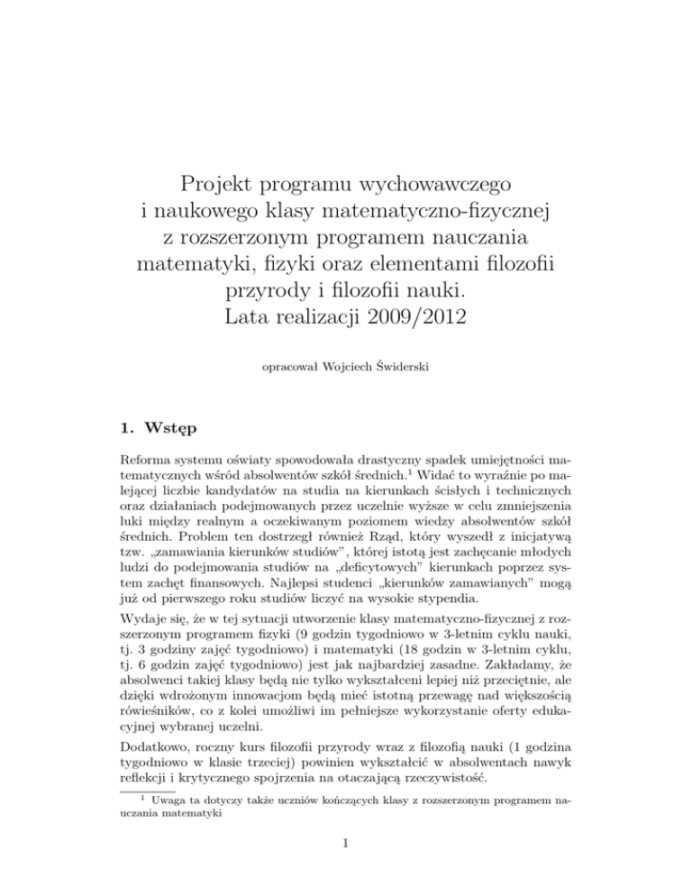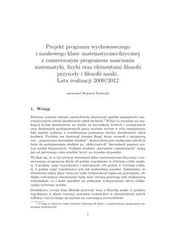 Projekt programu wychowawczego i naukowego klasy matematyczno-fizycznej z rozszerzonym programem nauczania matematyki, fizyki oraz elementami filozofii przyrody i filozofii nauki. Lata realizacji 2009/2012 opracował Wojciech Świderski 1. Wstęp Reforma systemu oświaty spowodowała drastyczny spadek umiejętności matematycznych wśród absolwentów szkół średnich.1 Widać to wyraźnie po malejącej liczbie kandydatów na studia na kierunkach ścisłych i technicznych oraz działaniach podejmowanych przez uczelnie wyższe w celu zmniejszenia luki między realnym a oczekiwanym poziomem wiedzy absolwentów szkół średnich. Problem ten dostrzegł również Rząd, który wyszedł z inicjatywą tzw. „zamawiania kierunków studiów”, której istotą jest zachęcanie młodych ludzi do podejmowania studiów na „deficytowych” kierunkach poprzez system zachęt finansowych. Najlepsi studenci „kierunków zamawianych” mogą już od pierwszego roku studiów liczyć na wysokie stypendia. Wydaje się, że w tej sytuacji utworzenie klasy matematyczno-fizycznej z rozszerzonym programem fizyki (9 godzin tygodniowo w 3-letnim cyklu nauki, tj. 3 godziny zajęć tygodniowo) i matematyki (18 godzin w 3-letnim cyklu, tj. 6 godzin zajęć tygodniowo) jest jak najbardziej zasadne. Zakładamy, że absolwenci takiej klasy będą nie tylko wykształceni lepiej niż przeciętnie, ale dzięki wdrożonym innowacjom będą mieć istotną przewagę nad większością rówieśników, co z kolei umożliwi im pełniejsze wykorzystanie oferty edukacyjnej wybranej uczelni. Dodatkowo, roczny kurs filozofii przyrody wraz z filozofią nauki (1 godzina tygodniowo w klasie trzeciej) powinien wykształcić w absolwentach nawyk reflekcji i krytycznego spojrzenia na otaczającą rzeczywistość. 1 Uwaga ta dotyczy także uczniów kończących klasy z rozszerzonym programem nauczania matematyki 1 2. Sylwetka kandydata Zakładamy, że do klasy trafią uczniowie uzdolnieni matematycznie i zainteresowani jednym z dwóch wiodących przedmiotów. Wysoce pożądany jest bardzo dobry wynik z części matematyczno-przyrodniczej testu gimnazjalnego, jeszcze bardziej sukcesy w rozmaitych konkursach matematycznych2 . Jest to niezbędne, by właściwie wykorzystać szanse jakie daje realizacja programu klasy. Potrzebne będą również pracowitość i samozaparcie – jak zawsze, gdy chce się odnieść sukces. 3. Innowacja pedagogiczna W klasie chcemy wprowadzić dwie innowacje pedagogiczne. Pierwsza to elementarny kurs rachunku różniczkowego i całkowego funkcji jednej zmiennej rzeczywistej, oparty na wybranych rozdziałach klasycznego opracowania Włodzimierza Krysickiego i Lecha Włodarskiego pt. „Analiza matematyczna w zadaniach”. Na rynku dostępnych jest wiele wydań tej książki, uczniowie nie będą mieli zatem problemu z zaopatrzeniem się w nią. Na innowację chcemy przeznaczyć 3 godziny w trzyletnim cyklu nauczania. Przyjmując 35 tygodni w roku szkolnym, dawałoby to 105 godzin. W tym czasie można zrealizować solidny kurs uniwersytecki! Celem innowacji jest solidne przygotowanie absolwentów do podjęcia studiów na tych kierunków, na których istotną rolę odgrywa matematyka. Innowacja druga to roczny kurs historii filozofii przyrody z elementami filozofii nauki, oparty na kompendium autorstwa Michała Hellera pt. „Filozofia przyrody”3 . Celem tej innowacji jest ukazanie zmian w pojmowaniu przyrody i nauki na przestrzeni dziejów oraz zachęta do krytycznego spojrzenia na ten proces. 4. Przedmioty nauczania – program rozszerzony Program rozszerzony z matematyki realizowany będzie w oparciu o podręcznik do matematyki Oficyny Edukacyjnej Pazdro. Program ten jest od lat z powodzeniem realizowany w naszym liceum przez mgr Wiolettę Graczyk. Chcemy pójść tym śladem. Na realizację programu autorzy przewidują 12 godzin w trzyletnim cyklu nauczania, jednak praktyka pokazuje, że solidne opanowanie materiału przez uczniów wymaga 15 godzin. Dysponując 18 godzinami w cyklu trzyletnim mamy pewność realizacji programu oraz wspomnianej innowacji w wymiarze 3 godzin tygodniowo. 2 W szczególności dotyczy to „Kangura matematycznego” i organizowanej przez UMK w Toruniu „Ligi Zadaniowej” oraz konkursów wojewódzkich z matematyki, informatyki, fizyki i astronomii organizowanych przez Kuratorium Oświaty w Bydgoszczy. 3 Michał Heller, Filozofia przyrody, Wydawnictwo Znak, Kraków 2007, ISBN 978-83-240-0480-5 2 5. Przedmioty nauczania – program podstawowy Pozostałe przedmioty realizowane będą w zakresie podstawowym według podręczników wybranych przez nauczycieli. Planujemy język angielski jako wiodący i język niemiecki jako drugi język obcy. 6. Podstawowe cele edukacyjne klasy Po ukończeniu nauki absolwent powinien dobrze opanować wiedzę w zakresie przewidzianym odpowiednimi programami nauczania. W przypadku fizyki chodzi oczywiście o program rozszerzony, w przypadku matematyki również. Część innowacyjna podlegać będzie osobnym ewaluacjom -– chcemy, by absolwent dysponował umiejętnościami i wiedzą praktyczną umożliwiającymi na swobodne badanie funkcji zmiennej rzeczywistej, obliczanie całek oznaczonych i nieoznaczonych typowych funkcji (w zakresie objętym książką Krysickiego i Włodarskiego). W zakresie filozofii przyrody i nauki absolwent powinien orientować się w historii obu dyscyplin oraz powinien znać ich podstawowe koncepcje. Oczywistym celem nauki w liceum jest zdanie matury i przygotowanie do obranego kierunku studiów wyższych. Zakładamy, że zdecydowana większość będzie zdawała egzamin maturalny na poziomie rozszerzonym z przedmiotów wiodących i podstawowym z pozostałych przedmiotów. 7. Cel wychowawczy klasy – sylwetka absolwenta Cel wychowawczy związany jest ściśle z celem edukacyjnym -– wychowujemy również poprzez sposób przekazywania wiedzy. Chcemy przede wszystkim, by absolwent liceum nabrał przekonania, że wiedza i 