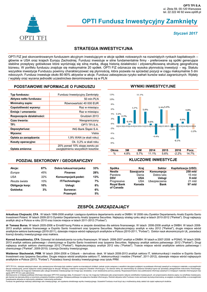 Zamieszczone w niniejszej publikacji informacje dotyczące OPTI FIZ (zwanego dalej „Funduszem”) nie są i nie mogą być traktowane jako proponowanie nabycia certyfikatów inwestycyjnych, ani proponowanie złożenia zapisu na certyfikaty inwestycyjne,