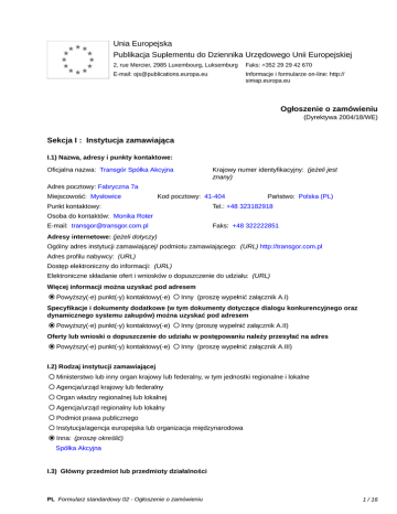 Unia Europejska Publikacja Suplementu do Dziennika Urzędowego Unii Europejskiej 2, rue Mercier, 2985 Luxembourg, Luksemburg Faks: +352 29 29 42 670 E-mail: [email protected] Informacje i formularze on-line: http:// simap.europa.eu Ogłoszenie o zamówieniu (Dyrektywa 2004/18/WE) Sekcja I : Instytucja zamawiająca I.1) Nazwa, adresy i punkty kontaktowe: Krajowy numer identyfikacyjny: (jeżeli jest znany) _____ Oficjalna nazwa: Transgór Spółka Akcyjna Adres pocztowy: Fabryczna 7a Miejscowość: Mysłowice Kod pocztowy: 41-404 Punkt kontaktowy: _____ Państwo: Polska (PL) Tel.: +48 323182918 Osoba do kontaktów: Monika Roter E-mail: [email protected] Faks: +48 322222851 Adresy internetowe: (jeżeli dotyczy) Ogólny adres instytucji zamawiającej/ podmiotu zamawiającego: (URL) http://transgor.com.pl Adres profilu nabywcy: (URL) _____ Dostęp elektroniczny do informacji: (URL) _____ Elektroniczne składanie ofert i wniosków o dopuszczenie do udziału: (URL) _____ Więcej informacji można uzyskać pod adresem Powyższy(-e) punkt(-y) kontaktowy(-e) Inny (proszę wypełnić załącznik A.I) Specyfikacje i dokumenty dodatkowe (w tym dokumenty dotyczące dialogu konkurencyjnego oraz dynamicznego systemu zakupów) można uzyskać pod adresem Powyższy(-e) punkt(-y) kontaktowy(-e) Inny (proszę wypełnić załącznik A.II) Oferty lub wnioski o dopuszczenie do udziału w postępowaniu należy przesyłać na adres Powyższy(-e) punkt(-y) kontaktowy(-e) Inny (proszę wypełnić załącznik A.III) I.2) Rodzaj instytucji zamawiającej Ministerstwo lub inny organ krajowy lub federalny, w tym jednostki regionalne i lokalne Agencja/urząd krajowy lub federalny Organ władzy regionalnej lub lokalnej Agencja/urząd regionalny lub lokalny Podmiot prawa publicznego Instytucja/agencja europejska lub organizacja międzynarodowa Inna: (proszę określić) Spółka Akcyjna I.3) Główny przedmiot lub przedmioty działalności PL Formularz standardowy 02 - Ogłoszenie o zamówieniu 1 / 16 Ogólne usługi publiczne Obrona Porządek i bezpieczeństwo publiczne Środowisko Sprawy gospodarcze i finansowe Zdrowie Budownictwo i obiekty komunalne Ochrona socjalna Rekreacja, kultura i religia Edukacja Inny: (proszę określić) transport I.4) Udzielenie zamówienia w imieniu innych instytucji zamawiających Instytucja zamawiająca dokonuje zakupu w imieniu innych instytucji zamawiających: tak nie więcej informacji o tych instytucjach zamawiających można podać w załączniku A PL Formularz standardowy 02 - Ogłoszenie o zamówieniu 2 / 16 Sekcja II : Przedmiot zamówienia II.1) Opis : II.1.1) Nazwa nadana zamówieniu przez instytucję zamawiającą : Dostawa autobusów II.1.2) Rodzaj zamówienia oraz lokalizacja robót budowlanych, miejsce realizacji dostawy lub świadczenia usług : Wybrać wyłącznie jedną kategorię – roboty budowlane, dostawy lub usługi – która najbardziej odpowiada konkretnemu przedmiotowi zamówienia lub zakupu Roboty budowlane Wykonanie Zaprojektowanie i wykonanie Wykonanie, za pomocą dowolnych środków, obiektu budowlanego odpowiadającego wymogom określonym przez instytucję zamawiającą Dostawy Kupno Dzierżawa Najem Leasing Połączenie powyższych form Usługi Kategoria usług: nr: _____ Zob. kategorie usług w załączniku C1 Główne miejsce lub lokalizacja robót budowlanych, miejsce realizacji dostawy lub świadczenia usług : Mysłowice Kod NUTS: PL22A II.1.3) Informacje na temat zamówienia publicznego, umowy ramowej lub dynamicznego systemu zakupów (DSZ): Ogłoszenie dotyczy zamówienia publicznego Ogłoszenie dotyczy zawarcia umowy ramowej Ogłoszenie dotyczy utworzenia dynamicznego systemu zakupów (DSZ) II.1.4) Informacje na temat umowy ramowej : (jeżeli dotyczy) Umowa ramowa z kilkoma wykonawcami Umowa ramowa z jednym wykonawcą Liczba : _____ albo (jeżeli dotyczy) liczba maksymalna : _____ uczestników planowanej umowy ramowej Czas trwania umowy ramowej Okres w latach : _____ albo w miesiącach : _____ Uzasadnienie dla umowy ramowej, której czas trwania przekracza okres czterech lat : _____ Szacunkowa całkowita wartość zakupów w całym okresie obowiązywania umowy ramowej (jeżeli dotyczy, proszę podać wyłącznie dane liczbowe) Szacunkowa wartość bez VAT : _____ Waluta : albo Zakres: między : _____ : i : _____ : Waluta : Częstotliwość oraz wartość zamówień, które zostaną udzielone : (jeżeli jest znana) _____ PL Formularz standardowy 02 - Ogłoszenie o zamówieniu 3 / 16 II.1.5) Krótki opis zamówienia lub zakupu : Dostawa dwóch fabrycznie nowych autobusów spełniających wymagania dostępne na stronie internetowej Zamawiającego. Podstawowe warunki techniczne: - autobusy o długości całkowitej do 12 m - szerokość: od 2,40 m do 2,55 m, - wysokość: max 3,2 m z klimatyzacją - autobusy niskopodłogowe i wyposażone w pochylnię (rampę najazdową) lub podnośnik na wózki dla osób niepełnosprawnych spełniającą wymagania Załącznika 8 Regulaminu nr 107 (przyjęty decyzją Rady 2006/874/ WE) Europejskiej Komisji Gospodarczej Organizacji Narodów Zjednoczonych (EKG/ONZ), spełniające wymagania określone w przepisach ustawy z dnia 20 czerwca 1997 r. – Prawo o ruchu drogowym (Dz. U. z 2012 r. poz. 1137, z późn. Zm.) i przepisach wykonawczych do niej dla autobusów miejskiej regularnej komunikacji publicznej, w tym wymagania określone w Rozporządzeniu Ministra Infrastruktury z dnia 31 grudnia 2002 r. w sprawie warunków technicznych pojazdów oraz zakresu ich niezbędnego wyposażenia (Dz. U. z 2015 r. poz. 305) II.1.6) Wspólny Słownik Zamówień (CPV) : Główny przedmiot Słownik główny 34121000 Słownik uzupełniający (jeżeli dotyczy) II.1.7) Informacje na temat Porozumienia w sprawie zamówień rządowych (GPA) : Zamówienie jest objęte Porozumieniem w sprawie zamówień rządowych (GPA) : tak nie II.1.8) Części: (w celu podania szczegółów o częściach zamówienia należy wykorzystać załącznik B tyle raz