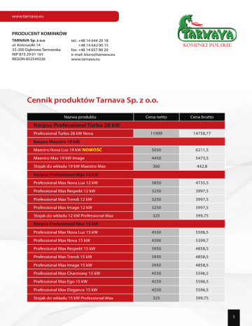 www.tarnava.eu PRODUCENT KOMINKÓW TARNAVA Sp. z o.o ul. Kościuszki 14 33-200 Dąbrowa Tarnowska NIP 873 29 01 161 REGON 852549226 tel.: +48 14 644 20 18 +48 14 642 00 15 fax: +48 14 657 80 20 e-mail: [email protected] www.tarnava.eu Cennik produktów Tarnava Sp. z o.o. Nazwa produktu Cena netto Cena brutto 11999 14758,77 Maestro Nova Lux 19 kW Nowość 5050 6211,5 Maestro Max 19 kW Image 4450 5473,5 Stojak do wkładu 19 kW Maestro Max 360 442,8 Professional Max Nova Lux 12 kW 3850 4735,5 Professional Max Respekt 12 kW 3250 3997,5 Professional Max Trendi 12 kW 3250 3997,5 Professional Max Image 12 kW 3250 3997,5 Stojak do wkładu 12 kW Professional Max 325 399,75 Professional Max Nova Lux 15 kW 4550 5596,5 Professional Max Nova 15 kW 4390 5399,7 Professional Max Respekt 15 kW 3950 4858,5 Professional Max Trendi 15 kW 3950 4858,5 Professional Max Image 15 kW 3950 4858,5 Professional Max Charmony 15 kW 4550 5596,5 Professional Max Ego 15 kW 4550 5596,5 Professional Max Elegance 15 kW 4550 5596,5 Stojak do wkładu 15 kW Professional Max 325 399,75 Korpus Professional Turbo 28 kW Professional Turbo 28 kW Nova Korpus Maestro 19 kW Korpus Professional Max 12 kW Korpus Professional Max 15 kW 1 www.tarnava.eu Nazwa produktu Cena netto Cena brutto Professional Max Nova Lux 18 kW 5150 6334,5 Professional Max Nova 18 kW 4990 6137,7 Professional Max Respekt 18 kW 4550 5596,5 Professional Max Trendi 18 kW 4550 5596,5 Professional Max Image 18 kW 4550 5596,5 Professional Max Charmony 18 kW 5150 6334,5 Professional Max Ego 18 kW 5150 6334,5 Professional Max Elegance 18 kW 5150 6334,5 Stojak do wkładu 18 kW Professional Max 325 399,75 Professional Comfort 18 kW 4250 5227,5 Professional Verto 18 kW 4250 5227,5 Professional Retro 18 kW 4250 5227,5 Professional Porta 18 kW 4250 5227,5 Professional Retro brąz 18 kW 5850 7195,5 Professional Premium 18 kW 4360 5362,8 Professional Exclusive 18 kW 4850 5965,5 Professional Varius 18 kW 4850 5965,5 Professional Retro II 18 kW 4360 5362,8 Professional Prestige 18 kW 4850 5965,5 Professional Prestige II 18 kW 4650 5719,5 Professional Cover 18 kW 4850 5965,5 Professional Cover II 18 kW 4650 5719,5 Stojak do wkładu 18 kW Professional 325 399,75 Korpus Professional Max 18 kW Korpus Professional 18 kW 2 www.tarnava.eu Nazwa produktu Cena netto Cena brutto Professional Max Respekt 21 kW 5250 6457,5 Professional Max Trendi 21 kW 5250 6457,5 Professional Max Image 21 kW 5250 6457,5 Professional Max Charmony 21 kW 5950 7318,5 Professional Max Ego 21 kW 5950 7318,5 Professional Max Elegance 21 kW 5950 7318,5 Stojak do wkładu 21 kW Professional Max 360 442,8 Professional Comfort 21 kW 5050 6211,5 Professional Verto 21 kW 5050 6211,5 Professional Retro 21 kW 5050 6211,5 Professional Retro brąz 21 kW 6750 8302,5 Professional Premium 21 kW 5150 6334,5 Professional Prestige 21 kW 5750 7072,5 Professional Prestige II 21 kW 5450 6703,5 Professional Exclusive II 21 kW 6150 7564,5 Stojak do wkładu 21 kW Professional 360 442,8 Universal Comfort 12 kW 3050 3751,5 Universal Exclusive 12 kW 3650 4489,5 Stojak do wkładu 12 kW Universal 325 399,75 Universal Comfort 14 kW 3450 4243,5 Universal Verto 14 kW 3450 4243,5 Universal Retro 14 kW 3450 4243,5 Universal Porta 14 kW 3450 4243,5 Universal Retro brąz 14 kW 5660 6961,8 Universal Premium 14 kW 3550 4366,5 Universal Exclusive 14 kW 4250 5227,5 Universal Varius 14 kW 4250 5227,5 Universal Retro II 14 kW 3550 4366,5 Korpus Professional Max 21 kW Korpus Professional 21 kW Korpus Universal 12 kW Korpus Universal 14 kW 3 www.tarnava.eu Nazwa produktu Cena netto Cena brutto Universal Prestige 14 kW 4250 5227,5 Universal Prestige II 14 kW 4050 4981,5 Universal Cover 14 kW 4250 5227,5 Universal Cover II 14 kW 4050 4981,5 Stojak do wkładu 14 kW Universal 325 399,75 Classic Comfort 16 kW 4250 5227,5 Classic Verto 16 kW 4250 5227,5 Classic Retro 16 kW 4250 5227,5 Classic Porta 16 kW 4250 5227,5 Classic Retro brąz 16 kW 5850 7195,5 Classic Premium 16 kW 4360 5362,8 Classic Exclusive 16 kW 4850 5965,5 Classic Varius 16 kW 4850 5965,5 Classic Retro II 16 kW 4360 5362,8 Classic Prestige 16 kW 4850 5965,5 Classic Prestige II 16 kW 4650 5719,5 Classic Cover 16 kW 4850 5965,5 Classic Cover II 16 kW 4650 5719,5 Stojak do wkładu 16 kW Classic 325 399,75 Korpus Classic 16 kW Korpus Classic Max 17 kW Nowość Classic Max Respekt 17 kW 4350 5350,5 Classic Max Trendi 17 kW 4350 5350,5 Classic Max Image 17 kW 4350 5350,5 Classic Max Charmony 17 kW 4950 6088,5 Classic Max Ego 17 kW 4950 6088,5 Classic Max Elegance 17 kW 4950 6088,5 Stojak do wkładu 16 kW Classic Max 325 399,75 *Do powyższych cen należy doliczyć podatek VAT w wysokości 23% 4 www.tarnava.eu Nazwa produktu Cena netto Cena brutto 4450 5473,5 AquaTar Comfort 20 kW 4650 5719,5 AquaTar Verto 20 kW 4650 5719,5 AquaTar Retro 20 kW 4650 5719,5 AquaTar Porta 20 kW 4650 5719,5 AquaTar Premium 20 kW 4750 5842,5 Aquatar Image 24 kW 5150 6334,5 AquaTar Comfort 24 kW 4850 5965,5 AquaTar Verto 24 kW 4850 5965,5 AquaTar Retro 24 kW 4850 5965,5 AquaTar Premium 24 kW 4950 6088,5 Aquatar Nova Lux 26 kW NOWOŚĆ 5750 7072,5 Aquatar Image 26 kW 5450 6703,5 6050 7441,5 Rura żeliwna RADIATOR fi 160 mm ( Moc 2,5 kW ) 325 399,75 Kolano żeliwne fi 160/67’ ( Moc 1,5 kW ) 225 276,75 Kratka żeliwna 50 61,5 Noga ławki - żeliwna 100 123 Noga stołu - żeliwna 120 147,6 Grill ogrodowy z pokrywą 690 848,7 Kociołek na nogach 15 L 590 725,7 Kociołek 12 L 430 528,9 Wkłady z płaszczem wodnym Korpus Aquatar 16 kW AquaTar Comfort 16 kW Korpus Aquatar 20 kW Korpus Aquatar 24 kW Korpus Aquatar 26 kW Korpus Aquatar 28 kW Aquatar Image 28 kW Pozostała produkcja 5 www.tarnava.eu Nazwa produktu Cena netto Cena brutto Kociołek 9 L 370 455,1 Kociołek 6 L 290 356,7 Gęsiarka 390 479,7 Kaczkarka 390 479,7 Zestaw sterujący SP120 700 861 6