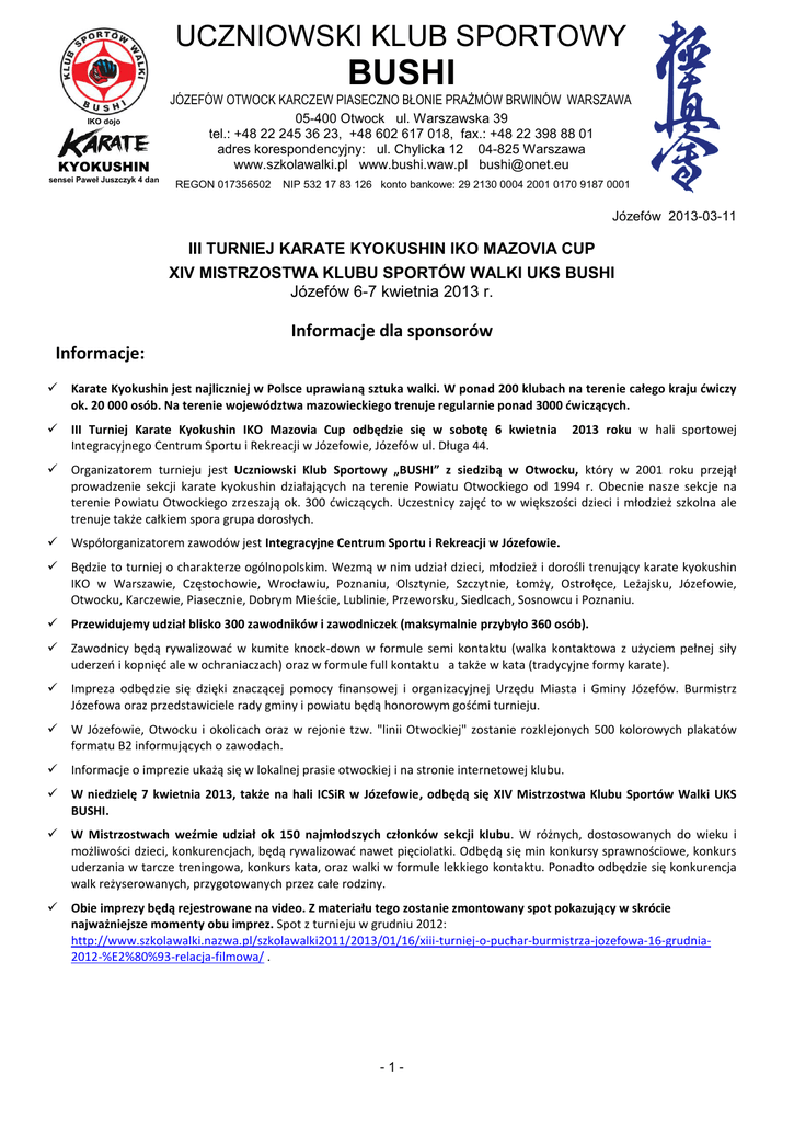 UCZNIOWSKI KLUB SPORTOWY BUSHI IKO dojo KYOKUSHIN sensei Paweł Juszczyk 4 dan JÓZEFÓW OTWOCK KARCZEW PIASECZNO BŁONIE PRAŻMÓW BRWINÓW WARSZAWA 05-400 Otwock ul. Warszawska 39 tel.: +48 22 245 36 23, +48 602 617 018, fax.: +48 22 398 88 01 adres korespondencyjny: ul. Chylicka 12 04-825 Warszawa www.szkolawalki.pl www.bushi.waw.pl [email protected] REGON 017356502 NIP 532 17 83 126 konto bankowe: 29 2130 0004 2001 0170 9187 0001 Józefów 2013-03-11 III TURNIEJ KARATE KYOKUSHIN IKO MAZOVIA CUP XIV MISTRZOSTWA KLUBU SPORTÓW WALKI UKS BUSHI Józefów 6-7 kwietnia 2013 r. Informacje dla sponsorów Informacje: Karate Kyokushin jest najliczniej w Polsce uprawianą sztuka walki. W ponad 200 klubach na terenie całego kraju ćwiczy ok. 20 000 osób. Na terenie województwa mazowieckiego trenuje regularnie ponad 3000 ćwiczących. III Turniej Karate Kyokushin IKO Mazovia Cup odbędzie się w sobotę 6 kwietnia Integracyjnego Centrum Sportu i Rekreacji w Józefowie, Józefów ul. Długa 44. Organizatorem turnieju jest Uczniowski Klub Sportowy „BUSHI” z siedzibą w Otwocku, który w 2001 roku przejął prowadzenie sekcji karate kyokushin działających na terenie Powiatu Otwockiego od 1994 r. Obecnie nasze sekcje na terenie Powiatu Otwockiego zrzeszają ok. 300 ćwiczących. Uczestnicy zajęć to w większości dzieci i młodzież szkolna ale trenuje także całkiem spora grupa dorosłych. Współorganizatorem zawodów jest Integracyjne Centrum Sportu i Rekreacji w Józefowie. Będzie to turniej o charakterze ogólnopolskim. Wezmą w nim udział dzieci, młodzież i dorośli trenujący karate kyokushin IKO w Warszawie, Częstochowie, Wrocławiu, Poznaniu, Olsztynie, Szczytnie, Łomży, Ostrołęce, Leżajsku, Józefowie, Otwocku, Karczewie, Piasecznie, Dobrym Mieście, Lublinie, Przeworsku, Siedlcach, Sosnowcu i Poznaniu. Przewidujemy udział blisko 300 zawodników i zawodniczek (maksymalnie przybyło 360 osób). Zawodnicy będą rywalizować w kumite knock-down w formule semi kontaktu (walka kontaktowa z użyciem pełnej siły uderzeń i kopnięć ale w ochraniaczach) oraz w formule full kontaktu a także w kata (tradycyjne formy karate). Impreza odbędzie się dzięki znaczącej pomocy finansowej i organizacyjnej Urzędu Miasta i Gminy Józefów. Burmistrz Józefowa oraz przedstawiciele rady gminy i powiatu będą honorowym gośćmi turnieju. W Józefowie, Otwocku i okolicach oraz w rejonie tzw. "linii Otwockiej" zostanie rozklejonych 500 kolorowych plakatów formatu B2 informujących o zawodach. Informacje o imprezie ukażą się w lokalnej prasie otwockiej i na stronie internetowej klubu. W niedzielę 7 kwietnia 2013, także na hali ICSiR w Józefowie, odbędą się XIV Mistrzostwa Klubu Sportów Walki UKS BUSHI. W Mistrzostwach weźmie udział ok 150 najmłodszych członków sekcji klubu. W różnych, dostosowanych do wieku i możliwości dzieci, konkurencjach, będą rywalizować nawet pięciolatki. Odbędą się min konkursy sprawnościowe, konkurs uderzania w tarcze treningowa, konkurs kata, oraz walki w formule lekkiego kontaktu. Ponadto odbędzie się konkurencja walk reżyserowanych, przygotowanych przez całe rodziny. Obie imprezy będą rejestrowane na video. Z materiału tego zostanie zmontowany spot pokazujący w skrócie najważniejsze momenty obu imprez. Spot z turnieju w grudniu 2012: http://www.szkolawalki.nazwa.pl/szkolawalki2011/2013/01/16/xiii-turniej-o-puchar-burmistrza-jozefowa-16-grudnia2012-%E2%80%93-relacja-filmowa/ . -1- 2013 roku w hali sportowej OFERTA PROMOCYJNA III TURNIEJ KARATE KYOKUSHIN IKO MAZOVIA CUP i XIV MISTRZOSTWA UKS BUSHI Józefów 6-7 kwietnia 2013 r. Sponsorzy : Sponsor Główny - opłata 4000 zł. Sponsor – opłaty od 200 zł. Przywileje dla Sponsora Głównego : 1 Tytuł "Sponsor Główny III Turnieju Karate Kyokushin IKO Mazovia Cup i XIV Mistrzostw UKS Bushi" oraz prawo do używania tego tytułu przez rok, poczynając od dnia zawarcia umowy sponsorskiej. 2 Promocja Firmy poprzez podanie do publicznej wiadomości informacji o sponsorowaniu Turnieju w postaci : 3. - w informacjach dla prasy i portali internetowych (Tygodnik Regionalny, Linia Otwocka, portale internetowe związane z powiatem otwockim, portale związane z karate kyokushin: www.pfkk.pl, www.onekyokushin.pl, www.szkolawalki.pl) - umieszczenia kolorowego logo Firmy o uzgodnionych wymiarach na plakatach formatu B2 zapowiadających turniej. Będą one rozwieszone na obszarze Otwocka i okolic oraz tzw. "linii otwockiej" na tablicach ogłoszeniowych, w szkołach i innych dozwolonych miejscach (500 szt.). 500 plakatów zostanie rozdanych lub sprzedanych jako pamiątka z zawodów. - umieszczenie logo firmy na specjalnych zaproszeniach dla gości honorowych (zarząd powiatu Otwock, Burmistrz Józefowa i inni.) Reklama Firmy podczas trwania Turnieju : - odczytanie nazwy Firmy jako Sponsora Głównego oraz przedstawienie informacji o Firmie podczas oficjalnego otwarcia turnieju przez prowadzącego ceremonię otwarcia - emitowanie przez megafony nagłaśniające spotu reklamowego Firmy (jeśli taki zostanie dostarczony) przed oficjalnym rozpoczęciem oraz w czasie przerw technicznych - umieszczenie tablic reklamowych lub bannerów firmy w eksponowanym miejscu hali sportowej - wystawienie stoiska promocyjnego Firmy w miejscu łatwo dostępnym dla widzów i zawodników - rozłożenie materiałów reklamowych Firmy (foldery, ulotki itp.) na widowni i w innych eksponowanych miejscach hali - umieszczenie logo firmy na dyplomach dla zwycięzców i uczestników turnieju 4. Reklama firmy w relacjach z turnieju: - umieszczenie logo firmy lub innych informacji o niej w filmowej relacji z imprezy, który zostanie umieszczony na portalu YouTube i będzie promowany na stronie klubu www.szkolawalki.pl oraz na stornie Polskiej Federacji Karate Kyokushin www.pfkk.pl i portalu www.onekyokushin.pl . Przywileje dla pozostałych Sponsorów: podobnie jak dla Sponsora Głównego, ale w skali proporcjonalnej d