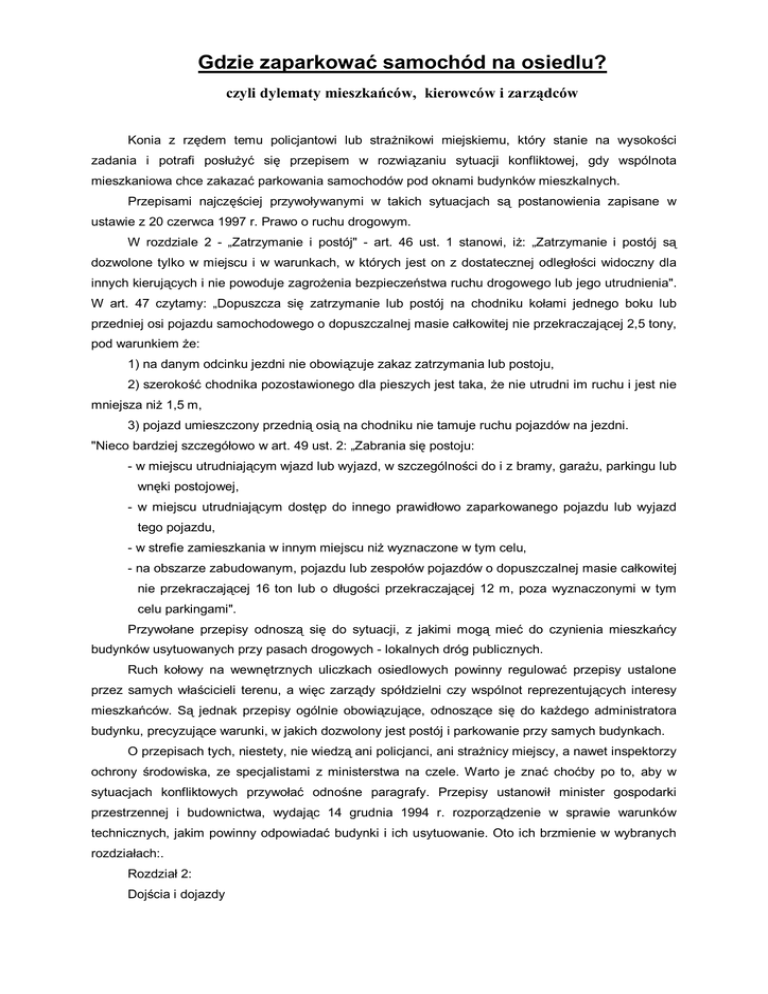 Gdzie zaparkować samochód na osiedlu? czyli dylematy mieszkańców, kierowców i zarządców Konia z rzędem temu policjantowi lub strażnikowi miejskiemu, który stanie na wysokości zadania i potrafi posłużyć się przepisem w rozwiązaniu sytuacji konfliktowej, gdy wspólnota mieszkaniowa chce zakazać parkowania samochodów pod oknami budynków mieszkalnych. Przepisami najczęściej przywoływanymi w takich sytuacjach są postanowienia zapisane w ustawie z 20 czerwca 1997 r. Prawo o ruchu drogowym. W rozdziale 2 - „Zatrzymanie i postój" - art. 46 ust. 1 stanowi, iż: „Zatrzymanie i postój są dozwolone tylko w miejscu i w warunkach, w których jest on z dostatecznej odległości widoczny dla innych kierujących i nie powoduje zagrożenia bezpieczeństwa ruchu drogowego lub jego utrudnienia". W art. 47 czytamy: „Dopuszcza się zatrzymanie lub postój na chodniku kołami jednego boku lub przedniej osi pojazdu samochodowego o dopuszczalnej masie całkowitej nie przekraczającej 2,5 tony, pod warunkiem że: 1) na danym odcinku jezdni nie obowiązuje zakaz zatrzymania lub postoju, 2) szerokość chodnika pozostawionego dla pieszych jest taka, że nie utrudni im ruchu i jest nie mniejsza niż 1,5 m, 3) pojazd umieszczony przednią osią na chodniku nie tamuje ruchu pojazdów na jezdni. "Nieco bardziej szczegółowo w art. 49 ust. 2: „Zabrania się postoju: - w miejscu utrudniającym wjazd lub wyjazd, w szczególności do i z bramy, garażu, parkingu lub wnęki postojowej, - w miejscu utrudniającym dostęp do innego prawidłowo zaparkowanego pojazdu lub wyjazd tego pojazdu, - w strefie zamieszkania w innym miejscu niż wyznaczone w tym celu, - na obszarze zabudowanym, pojazdu lub zespołów pojazdów o dopuszczalnej masie całkowitej nie przekraczającej 16 ton lub o długości przekraczającej 12 m, poza wyznaczonymi w tym celu parkingami". Przywołane przepisy odnoszą się do sytuacji, z jakimi mogą mieć do czynienia mieszkańcy budynków usytuowanych przy pasach drogowych - lokalnych dróg publicznych. Ruch kołowy na wewnętrznych uliczkach osiedlowych powinny regulować przepisy ustalone przez samych właścicieli terenu, a więc zarządy spółdzielni czy wspólnot reprezentujących interesy mieszkańców. Są jednak przepisy ogólnie obowiązujące, odnoszące się do każdego administratora budynku, precyzujące warunki, w jakich dozwolony jest postój i parkowanie przy samych budynkach. O przepisach tych, niestety, nie wiedzą ani policjanci, ani strażnicy miejscy, a nawet inspektorzy ochrony środowiska, ze specjalistami z ministerstwa na czele. Warto je znać choćby po to, aby w sytuacjach konfliktowych przywołać odnośne paragrafy. Przepisy ustanowił minister gospodarki przestrzennej i budownictwa, wydając 14 grudnia 1994 r. rozporządzenie w sprawie warunków technicznych, jakim powinny odpowiadać budynki i ich usytuowanie. Oto ich brzmienie w wybranych rozdziałach:. Rozdział 2: Dojścia i dojazdy § 14. 1. Do działki budowlanej oraz do budynku i urządzeń z nim związanych należy zapewnić dojście i dojazd od drogi publicznej, odpowiednie do przeznaczenia i sposobu jego użytkowania oraz wymagań ochrony przeciwpożarowej, określonych w przepisach szczególnych. Szerokość jezdni nie może być mniejsza niż 3 m. 2. W zespole budynków jednorodzinnych dopuszcza się zastosowanie dojścia i dojazdu do działek budowlanych w postaci ciągu pieszo-jezdnego, pod warunkiem że ma on szerokość nie mniejszą niż 5 m. 3. W zespole niskich budynków wielorodzinnych dojście do każdej klatki schodowej powinno być przystosowane do awaryjnego ruchu pojazdów uprzywilejowanych o masie całkowitej do 2,5 tony. 4. Do budynku i urządzeń z nim związanych, wymagających dojazdów, funkcję tę mogą spełniać dojścia, pod warunkiem że ich szerokość nie będzie mniejsza niż 4,5 m. § 15. 1. Szerokość, promienie łuków dojazdów oraz wytrzymałość nawierzchni należy dostosować do wymiarów gabarytowych, ciężaru całkowitego i warunków ruchu pojazdów, których dojazd do działki budowlanej i budynku jest konieczny. 2. Dojścia służące równocześnie do ruchu pojazdów gospodarczych i uprzywilejowanych o masie do 2,5 tony powinny mieć nawierzchnię o nośności co najmniej dostosowanej do masy tych pojazdów. § 16. Do wejść do budynku mieszkalnego wielorodzinnego, zamieszkania zbiorowego i użyteczności publicznej powinny być doprowadzone utwardzone dojścia o szerokości minimalnej 1,5 m, przy czym co najmniej jedno dojście powinno zapewniać osobom niepełnosprawnym dostęp do całego budynku lub tych jego części, z których osoby te mogą korzystać. § 17. 1. Nachylenie podłużne dojść (chodników) nie powinno przekraczać 5 proc., a poprzeczne - 2 proc. Dopuszcza się zastosowanie większego nachylenia podłużnego, jeżeli będzie ono odpowiadało wymaganiom dotyczącym pochylni zewnętrznych, określonym w § 70. 2. Wysokość ogólnodostępnych przejść i prześwitów do ruchu pieszego nie może być mniejsza niż 2,2 m, jeżeli przepisy dotyczące ochrony przeciwpożarowej nie stanowią inaczej. Rozdział 3: Miejsca postojowe dla samochodów § 18. 1. W zagospodarowaniu działki budowlanej należy zapewnić, stosownie do jej przeznaczenia i sposobu zabudowy, odpowiednią liczbę miejsc postojowych dla samochodów użytkowników stałych i przebywających okresowo, w tym również miejsc postojowych dla samochodów, z których korzystają osoby niepełnosprawne. 2. Liczbę i sposób urządzenia miejsc postojowych lub budowy garaży należy dostosować do ustalonych przez właściwy organ warunków zabudowy i zagospodarowania terenu, z uwzględnieniem potrzebnej liczby miejsc, z których korzystają osoby niepełnosprawne, przy zachowaniu warunków technicznych określonych w rozporządzeniu. § 19. 1. Odległość wydzielonego, odkrytego zgrupowania miejsc postojowych lub otwartego garażu wielopoziomowego dla samocho