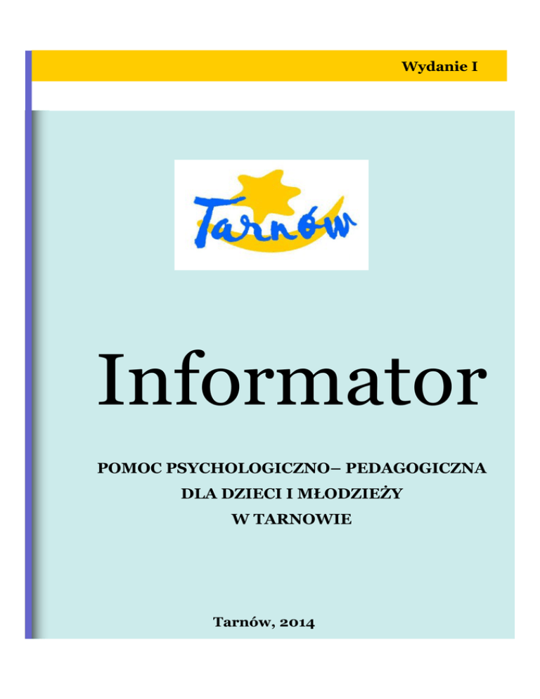 Wydanie I Informator POMOC PSYCHOLOGICZNO– PEDAGOGICZNA DLA DZIECI I MŁODZIEŻY W TARNOWIE Tarnów, 2014 WYDZIAŁ EDUKACJI Redakcja: Inga Prusak – Specjalistyczna Poradnia Profilaktyczno-Terapeutyczna 2 LIST INTENCYJNY Szanowni Państwo, W odpowiedzi na potrzeby rodziców i wychowawców przekazujemy Państwu informator, będący swego rodzaju kompendium informacji w zakresie pomocy psychologiczno-pedagogicznej dzieciom i młodzieży. Jest on wynikiem współpracy wielu instytucji miejskich w ramach działań systemowych w zakresie wychowania i profilaktyki w Tarnowie. Głównym jego zadaniem jest ułatwienie współdziałania pomiędzy rodzicami, nauczycielami i osobami, które zajmują się wychowaniem a różnego rodzaju instytucjami na terenie Tarnowa. Wskazuje kierunek, ścieżkę działania czy postępowania. Obejmuje informacje o miejscach, gdzie można uzyskać pomoc psychologiczną, prawną oraz wsparcie rozwoju psychospołecznego dzieci i młodzieży w tym niepełnosprawnej i z niepowodzeniami. Ma ułatwić szybkie znalezienie form pomocy w zakresie edukacji, pomocy społecznej, szeroko pojętego bezpieczeństwa i działalności organizacji pozarządowych dla dobra dziecka i rodziny. Zapraszam i zachęcam do częstego zeń korzystania! Zastępca Prezydenta Miasta Tarnowa Krystyna Latała 3 OD REDAKCJI Miejski informator, który oddajemy w Państwa ręce stanowi jednolity pod względem treści katalog podmiotów w Tarnowie i zakresu ich aktywności. Zawiera podstawowe dane na temat instytucji, organizacji i innych podmiotów, które wspierają rozwój i działają na rzecz dzieci i młodzieży. W przypadku wybranych szkół i przedszkoli informator zbiera dane o pomocowym charakterze prowadzonych przez nie działań, a nie całościowej funkcji tych placówek. Należy podkreślić, że każda szkoła czy przedszkole świadczą dziś pomoc psychologiczno-pedagogiczną na rzecz młodych ludzi na wszystkich poziomach edukacyjnych. Aby ułatwić korzystanie z informatora, na początku zamieściliśmy słownik pojęć. Sylwetki poszczególnych placówek obejmują dane teleadresowe, godziny, w których można uzyskać informacje, formy pomocy świadczonej na rzecz dzieci i młodzieży, ponadto kategorie adresatów tych form w rozróżnieniu na szczególne potrzeby oraz wiek dzieci, a także informacje dodatkowe, oddające specyfikę instytucji. Informator zawiera również indeks form pomocy i jej adresatów, co ma pomóc w szybkim odnajdywaniu potrzebnych Państwu informacji. Wszystkie dane zawarte w informatorze są aktualne na czerwiec 2014 r. Planujemy jego monitorowanie i okresową aktualizację w kolejnych wydaniach. Będziemy wdzięczni za informacje zwrotną na temat jego przydatności. Wszelkie pytania i wątpliwości a także aktualizacje proszę kierować na adres mailowy [email protected] lub pod numerem telefonu 14 622 27 96. Inga Prusak socjolog Specjalistyczna Poradnia Profilaktyczno-Terapeutyczna 4 SPIS TREŚCI: LIST INTENCYJNY 3 OD REDAKCJI 4 SPIS TREŚCI 5 SŁOWNIK POJĘĆ 9 EDUKACJA 11 Poradnie Poradnia Psychologiczno– Pedagogiczna w Tarnowie 12 Specjalistyczna Poradnia Profilaktyczno– Terapeutyczna w Tarnowie 13 Powiatowa Poradnia Psychologiczno– Pedagogiczna w Tarnowie 14 >ARKA< Poradnia Specjalistyczna i Telefon Zaufania 15 Publiczne szkoły i placówki Przedszkole Publiczne nr 1 z Oddziałami Integracyjnymi w Tarnowie 16 Przedszkole Publiczne nr 14 z Oddziałem Integracyjnym 17 Przedszkole Publiczne nr 18 z Oddziałami Integracyjnymi 18 16 5 Przedszkole Publiczne Nr 35 z Oddziałem Integracyjnym 19 Szkoła Podstawowa nr 3 im. Marii Konopnickiej z Oddziałami Integracyjnymi w Tarnowie 20 Szkoła Podstawowa nr 9 im. Orląt Lwowskich z Oddziałami Integracyjnymi w 21 Szkoła Podstawowa Integracyjna nr 11 w Tarnowie 22 Zespół Szkół Ogólnokształcących nr 5 (Gimnazjum nr 1) 23 Zespół Szkół Ogólnokształcących nr 6 z Oddziałami Integracyjnymi w Tarnowie (Gimnazjum nr 7 i Liceum nr XX) 24 Zespół Szkół Specjalnych dla Niesłyszących i Słabo Słyszących 25 Specjalny Ośrodek Szkolno– Wychowawczy 26 Zespół Specjalnych Szkół Przyszpitalnych 27 Pałac Młodzieży w Tarnowie 28 Bursa Międzyszkolna 29 Niepubliczne szkoły i placówki Niepubliczne Przedszkole Specjalne Polskiego Stowarzyszenia na Rzecz Osób z Upośledzeniem Umysłowym w Tarnowie 30 Zespół Niepublicznych Szkół Specjalnych 31 Niepubliczne Gimnazjum w Tarnowie– Mościcach 32 Warsztat Terapii Zajęciowej im. Jana Pawła II 33 Inne Centrum Edukacji i Pracy Młodzieży Ochotniczych Hufców Pracy w Tarnowie 6 34 Centrum Kształcenia i Wychowania Ochotniczych Hufców Pracy w Tarnowie 35 POMOC SPOŁECZNA Miejski Ośrodek Pomocy Społecznej 37 Tarnowski Ośrodek Interwencji Kryzysowej i wsparcia Ofiar Pomocy 38 Placówki opiekuńczo-wychowawcze Placówka Opiekuńczo-Wychowawcza „Pogotowie Opiekuńcze” w Tarnowie 39 Placówka Opiekuńczo– Wychowawcza im. Janusza Korczaka w Tarnowie 40 Placówka Opiekuńczo– Wychowawcza „Słoneczny dom” w Tarnowie 41 Placówka Opiekuńczo– Wychowawcza „Przyjazny dom” w Tarnowie 42 ZDROWIE Poradnia Zdrowia Psychicznego w Zespole Poradni Specjalistycznych 44 Niepubliczny Zakład Opieki Zdrowotnej– Punkt Wczesnej Interwencji 45 BEZPIECZEŃSTWO Straż Miejska w Tarnowie 47 Prokuratora Okręgowa w Tarnowie 47 Komenda Miejska Policji w Tarnowie 48 I Zespół Kuratorskiej Służby Sądowej ds. Wykonywania orzeczeń w sprawach rodzinnych i nieletnich 48 ORGANIZACJE POZARZĄDOWE „Caritas” Diecezji Tarnowskiej 7 50 8 Fundacja im. Hetmana Tarnowskiego w Tarnowie 51 Fundacja Rozwoju Edukacji, Pracy, Integracji 52 Katolickie Centrum Edukacji Młodzieży „KANA” 53 Ośrodek Adopcyjny Towarzystwa Przyjaciół Dzieci Oddział w Tarnowie 54 Stowarzyszenie ICH LEPSZE JUTRO 55 Stowarzyszenie Inicjatyw Prospołecznych „ Otwarta Przyszłość” 56 Stowarzyszenie Psychologii, Edukacji i Rozwoju Osobistego „Kropla Słońca” 57 Stowarz