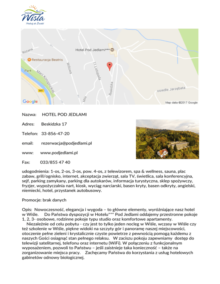 Nazwa: HOTEL POD JEDLAMI Adres: Beskidzka 17 Telefon: 33-856-47-20 email: [email protected] www: www.podjedlami.pl Fax: 033/855 47 40 udogodnienia: 1-os, 2-os, 3-os, pow. 4-os, z telewizorem, spa & wellness, sauna, plac zabaw, grill/ognisko, internet, akceptacja zwierząt, sala TV, świetlica, sala konferencyjna, sejf, parking zamykany, parking dla autokarów, informacja turystyczna, sklep spożywczy, fryzjer, wypożyczalnia nart, kiosk, wyciąg narciarski, basen kryty, basen odkryty, angielski, niemiecki, hotel, przystanek autobusowy. Promocje: brak danych Opis: Nowoczesność, elegancja i wygoda – to główne elementy, wyróżniające nasz hotel w Wiśle. Do Państwa dyspozycji w Hotelu*** Pod Jedlami oddajemy przestronne pokoje 1, 2, 3- osobowe, rodzinne pokoje typu studio oraz komfortowe apartamenty. Niezależnie od celu pobytu - czy jest to tylko jeden nocleg w Wiśle, wczasy w Wiśle czy też szkolenie w Wiśle, piękne widoki na szczyty gór i panoramę naszej miejscowości, otoczenie pełne zieleni i krystalicznie czyste powietrze z pewnością pomogą każdemu z naszych Gości osiagnąć stan pełnego relaksu. W zaciszu pokoju zapewniamy dostęp do telewizji satelitarnej, telefonu oraz internetu (WiFi). W połączeniu z funkcjonalnym wyposażeniem, pozwoli to Państwu – jeśli zaistnieje taka konieczność – także na zorganizowanie miejsca pracy. Zachęcamy Państwa do korzystania z usług hotelowych gabinetów odnowy biologicznej. Wiedząc, że w nawale codziennych spraw i obowiązków, często trudno jest znaleźć chwilę "dla siebie", chcemy dać Państwu możliwość pełnego relaksu połączonego z poprawą samopoczucia i urody. W Hotelu*** Pod Jedlami zapewniamy opiekę profesjonalnych masażystów, fizjoterapeutów oraz kosmetyczki. Bogata oferta zabiegów, dostosowanych do potrzeb każdego z naszych Gości sprawia, że każdy z Państwa może zaplanować i zrealizować indywidualny program gwarantujący poprawę samopoczucia, wyglądu i stanu zdrowia. Na tych z Państwa, dla których odnowa biologiczna jest jednym z elementów udanego wypoczynku, czekają w Hotelu*** Pod Jedlami: gabinet masażu, fizjoterapii i hydroterapii gabinet kosmetyczny sauna sucha i sauna infrared. Dzieci mają możliwość spędzenia czasu w kolorowym i pełnym atrakcji hotelowym kąciku zabaw lub na ogrodowym placu zabaw. Hotel przyjmuje Gości ze zwierzętami domowymi.