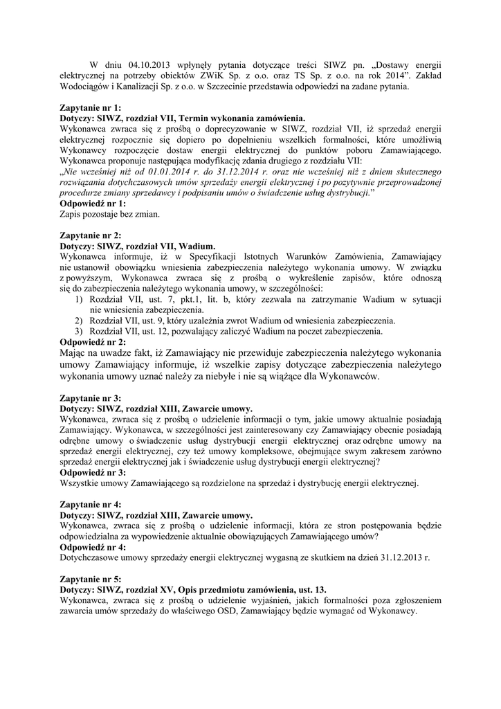 W dniu 04.10.2013 wpłynęły pytania dotyczące treści SIWZ pn. „Dostawy energii elektrycznej na potrzeby obiektów ZWiK Sp. z o.o. oraz TS Sp. z o.o. na rok 2014”. Zakład Wodociągów i Kanalizacji Sp. z o.o. w Szczecinie przedstawia odpowiedzi na zadane pytania. Zapytanie nr 1: Dotyczy: SIWZ, rozdział VII, Termin wykonania zamówienia. Wykonawca zwraca się z prośbą o doprecyzowanie w SIWZ, rozdział VII, iŜ sprzedaŜ energii elektrycznej rozpocznie się dopiero po dopełnieniu wszelkich formalności, które umoŜliwią Wykonawcy rozpoczęcie dostaw energii elektrycznej do punktów poboru Zamawiającego. Wykonawca proponuje następująca modyfikację zdania drugiego z rozdziału VII: „Nie wcześniej niŜ od 01.01.2014 r. do 31.12.2014 r. oraz nie wcześniej niŜ z dniem skutecznego rozwiązania dotychczasowych umów sprzedaŜy energii elektrycznej i po pozytywnie przeprowadzonej procedurze zmiany sprzedawcy i podpisaniu umów o świadczenie usług dystrybucji.” Odpowiedź nr 1: Zapis pozostaje bez zmian. Zapytanie nr 2: Dotyczy: SIWZ, rozdział VII, Wadium. Wykonawca informuje, iŜ w Specyfikacji Istotnych Warunków Zamówienia, Zamawiający nie ustanowił obowiązku wniesienia zabezpieczenia naleŜytego wykonania umowy. W związku z powyŜszym, Wykonawca zwraca się z prośbą o wykreślenie zapisów, które odnoszą się do zabezpieczenia naleŜytego wykonania umowy, w szczególności: 1) Rozdział VII, ust. 7, pkt.1, lit. b, który zezwala na zatrzymanie Wadium w sytuacji nie wniesienia zabezpieczenia. 2) Rozdział VII, ust. 9, który uzaleŜnia zwrot Wadium od wniesienia zabezpieczenia. 3) Rozdział VII, ust. 12, pozwalający zaliczyć Wadium na poczet zabezpieczenia. Odpowiedź nr 2: Mając na uwadze fakt, iŜ Zamawiający nie przewiduje zabezpieczenia naleŜytego wykonania umowy Zamawiający informuje, iŜ wszelkie zapisy dotyczące zabezpieczenia naleŜytego wykonania umowy uznać naleŜy za niebyłe i nie są wiąŜące dla Wykonawców. Zapytanie nr 3: Dotyczy: SIWZ, rozdział XIII, Zawarcie umowy. Wykonawca, zwraca się z prośbą o udzielenie informacji o tym, jakie umowy aktualnie posiadają Zamawiający. Wykonawca, w szczególności jest zainteresowany czy Zamawiający obecnie posiadają odrębne umowy o świadczenie usług dystrybucji energii elektrycznej oraz odrębne umowy na sprzedaŜ energii elektrycznej, czy teŜ umowy kompleksowe, obejmujące swym zakresem zarówno sprzedaŜ energii elektrycznej jak i świadczenie usług dystrybucji energii elektrycznej? Odpowiedź nr 3: Wszystkie umowy Zamawiającego są rozdzielone na sprzedaŜ i dystrybucję energii elektrycznej. Zapytanie nr 4: Dotyczy: SIWZ, rozdział XIII, Zawarcie umowy. Wykonawca, zwraca się z prośbą o udzielenie informacji, która ze stron postępowania będzie odpowiedzialna za wypowiedzenie aktualnie obowiązujących Zamawiającego umów? Odpowiedź nr 4: Dotychczasowe umowy sprzedaŜy energii elektrycznej wygasną ze skutkiem na dzień 31.12.2013 r. Zapytanie nr 5: Dotyczy: SIWZ, rozdział XV, Opis przedmiotu zamówienia, ust. 13. Wykonawca, zwraca się z prośbą o udzielenie wyjaśnień, jakich formalności poza zgłoszeniem zawarcia umów sprzedaŜy do właściwego OSD, Zamawiający będzie wymagać od Wykonawcy. Odpowiedź nr 5: Zamawiający będzie wymagać od Wykonawcy przeprowadzenia procedury zmiany sprzedawcy oraz zawierania i wypowiadania w imieniu Zamawiającego umów o świadczenie usług dystrybucji energii elektrycznej. Zapytanie nr 6: Dotyczy: Formularz Nr 1, Oferta warunków realizacji zamówienia, pkt. 1.1 oraz 1.2. Wykonawca zwraca się z zapytaniem, czy w cenie jednostkowej netto podawanej w formularzu ofertowym ma być wliczony podatek akcyzowy? Odpowiedź nr 6: Zgodnie z zapisami SIWZ do cen jednostkowych dla ZWiK Sp. z o.o. nie naleŜy wliczać podatku akcyzowego (pkt. 1.1), do cen jednostkowych dla TS Sp. z o.o. naleŜy wliczać podatek akcyzowy (pkt. 1.2), cena przedmiotu zamówienia (wartość sumaryczna kontraktów) jest obliczana przy pomocy cen zawierających podatek akcyzowy i cen bez tego podatku. Zapytanie nr 7: Dotyczy: załącznik nr 2 oraz 3 do SIWZ, Wykaz punktów poboru energii elektrycznej. Wykonawca, prosi o udzielenie informacji o terminach wypowiedzenia aktualnie obowiązujących umów dla kaŜdego punktu poboru energii elektrycznej, poprzez podanie numeru umowy oraz terminu jej wypowiedzenia. Odpowiedź nr 7: Dotychczasowe umowy sprzedaŜy energii elektrycznej wygasną ze skutkiem na dzień 31.12.2013 r. Zapytanie nr 8: Dotyczy: załącznik nr 2 oraz 3 do SIWZ, Wykaz punktów poboru energii elektrycznej. Wykonawca zwraca się z zapytaniem, dla których spośród wymienionych obiektów, Zamawiający będą przeprowadzać procedurę zmiany sprzedawcy po raz pierwszy? Odpowiedź nr 8: Procedura pierwszej zmiany sprzedawcy będzie przeprowadzana dla następujących obiektów ZWiK Sp. z o.o. (złącznik nr 2): - ul. Górna - sięgacz, dz. nr 14/1, Szczecin, przepompownia ścieków - ul. Wojskiego, dz. nr 22/6, Szczecin, przepompownia ścieków - ul. Wołczkowska, dz. nr 74/19, Pilchowo, przepompownia ścieków - ul. Kalinowa, dz. nr 50/4, Szczecin, przepompownia ścieków - ul. Golisza 10, Szczecin, budynek warsztatowo-biurowy Dla Ŝadnego z obiektów naleŜących do TS Sp. z o.o. (załącznik nr 3) nie będzie to pierwsza procedura wyboru dostawcy. Zapytanie nr 9: Dotyczy: załącznik nr 2 oraz 3 do SIWZ, Wykaz punktów poboru energii elektrycznej. Wykonawca zwraca się z prośbą udzielenie informacji czy dane dotyczące punktów poboru energii elektrycznej (grupa taryfowa, moc umowna), są zgodne z danymi, które posiada OSD czy przedstawiają wartości wnioskowane? Odpowiedź nr 9: Dla ZWiK Sp. z o.o. wskazane w załącznikach do SIWZ grupy taryfowe punktów poboru są zgodne z danymi OSD i przedstawiają wartości wnioskowane. Moce zamówione wskazane w załącznikach do SIWZ były zgodne z danymi OSD na dzień publikacji SIWZ. Ze względu na moŜ