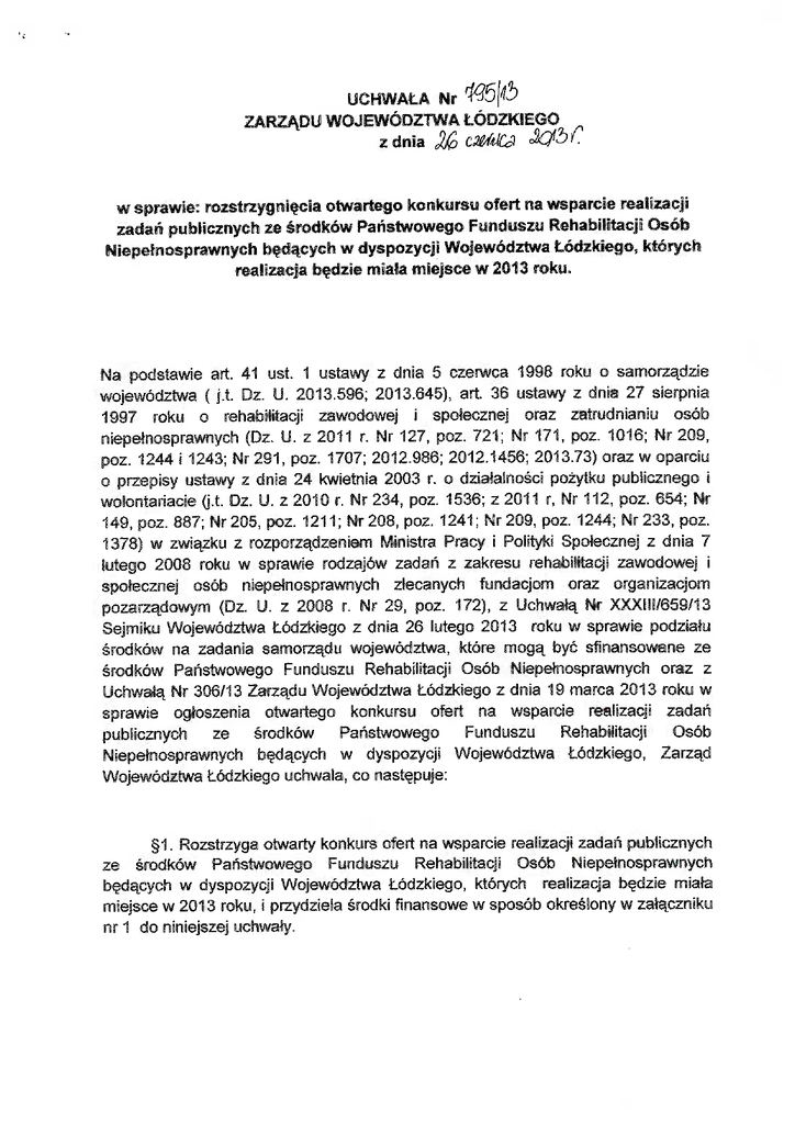 ucHWALAN.櫛IAb ZARZADUWoJEWeDZTWALeDZKiEGo zdni。%cm㈱幼3位 wsprawie:roZStrZygnieciaotwartegokonkursuofe直れawsparciereaIizacJI zadahpubiicznychzeSrodkewPahstwowegoFunduszuRehabi睡Cji°seb NiepelnosprawnychbedacychwdyspozyciiWqjewedztwaLedzkiego・kt6rych realizacjabedziemiaJamleJsceW2013roku葛 Napodstawieah.41ust・1ustawyzdnia5czerwca1998rOkuosamorZ的Zie wojew6dztwa(j・t・Dz・∪・2013・596;2013645),art・36ustawzdnia27sierpnia 1997 roku o rehab柵aql ZaW°dowqi spoiecznq oraz zatrudnianiu oseb niepelnosprawnych(Dz“∪・Z2011r・Nr127,pOZ・721;Nr171,POZ・1016;Nr209, poz.1244i1243;Nr291,pOZ・1707;2012“986;2012・1456;2013・73)orazwoparciu °PrZePisyustawyzdnia24kwietnia2003r・odzia胤noScipoZytkupublicznegoi wolontariacieO.t.Dz.U.Z2010「.Nr234,pOZ.1536;Z2011「,Nr112,POZ“654;Nr 149−PoZ・887;Nr205,PoZ・1211;Nr208,P。Z・1241;Nr209・poZ・1244;Nr233・P。Z“ 1378〉wzwiazkuzrozporzadzeniem MinistraPracyiP°IitykiSpoJeczn句Zdnia7 皿ego2008rokuwsprawie rOdzajdwzadah zzakresu rehabilitaqIZaWOd°Wqi spolecznq osdb niepeJnosprawnych zlecanych fundaciom oraz organizaqom p°ZarZadowym(Dz.U.Z2008rlNr29,PoZ“172),Z UchwataNrXXX冊659/13 SejmikuWqjewddztwatddzkiegozdnia26iuteg°2013 rokuwsprawiepodziah Srodkdw na zadania samorzadu wqjewbdztwa,ktdre mogabye sfinans°Wane Ze Srodk6w Pahstwowego Funduszu RehabiIitacji Osbb Niepelnosprawnych oraz z UchwalaNr306/13ZarzaduWqjewbdztwat−6dzkiegozdnia19marca2013rokuw sprawie ogめSZenia otwartego konkursu ote而 na wsparcie reaiizaq− Zadah publicznych ze Srodkdw Pahstwowego Funduszu Rehab晒aq一 〇seb Niepelnosprawnych bedacych w dyspozycji Wpjew6dztwa Lbdzkiego,Zarzad WqiewbdztwaLedzkjegouchwaia,COnaStePuJe: §1,Rozstrzygaotwahyk°nkurS°fehnawsparCierealizaqizadahpublicznych ze srodk6w Pahstwowego Funduszu Rehabiiitacii Os6b NiepeJnosprawnych bedacychwdyspozy画WqjewedztwaLbdzkiego,ktbrych reaiizacjabedziemiaぬ m画S∞W2013roku,iprzydzieIaSrodkimansowewsposdbokreSlonywzalaczniku ml doniniejszejuchwa小 §2.WykonanieuchwaypowierzaDyrektorowiRegiomlnegoCentrumPo哩ki SpoJecznejwLOdzi・ §3.UchwaぬWChodziwZyciezdniempOdjeciaipocllegaogloszeniupoprzez umieszczenie w BiuLe函南infomaqi Publicznej Urzedu Marszan(OWSkiegoi Regionainego Centum P0時栂Spolecznej w LOdzi,na StrOna南日向emetowyCh Urzedu MalBZam調Yek同o w L議長i MMWibdzkie・Pi oraz…W・nqO・ldzkie・pii Regionalnego Centum PoMykiSpobcznejw七°dziwrCPSIodzploraztablicy ogloszehwsiedzibieZarzaduWdew6dztwaLbdzkieg°iRegionainego Centrum PolnykiSpobcznejwLodzL 1.Wit°ldStepieh−MarszaJekWqewddztwa 2.ArturBagiehski−WicemarSZaiek 3.Dor°taRyl−WicemarszaIek 4.MarcinBugajski−CztonekZarzadu 5.DariuszKlimczak−CzJonek ∞ 〇 卓、 Z  ̄t °ウ 幸 ヨ ∞ \くつ Cへ く> 11⊃ ∞ トTl \o L′l t力 1n Z 2 トJ Uj UJ Z i 告■ 木1 鶴 つ “七 ○ て⊃ ⊂ 5− ぎ∽ 〇l 0 ト⊃ くつ (JJ 卜⊃ 申 ○ ト⊃ C〕 ∞ 19 る“ − ブコ O ∞ トロ 目 〇 本“ 01 8m C⊃ e 19 0 N芸 0 ≦ ai e■ ト] (D 喜 トロ 〇 三∴∴朽葉 雪∴∴∴罠お‘ ∽、0 −∴「∴ 望.8∃ お「謹 ∴二: ⊂: 亡∴∴∴十g警 ミ冨 網 三:三二∴ 二三三∴ (= :∠ 翰 N<鯵○ c〉 1 0 串“ ai くつ” 彊∵珪 整読 華鶴 一重 00 曲 = 墓. e N くつ と. ∴.∴「 ぎN、聖.要吉OQ〕 _」 史刃 忌N、墨豊」∴ }l∴∴∴∴Pt蛍 Ji 鶴 こし  ̄t e (D 二え 揮 示∴ 薫 iJ= ヰ くわEi〇、e す iでブ 不一 そ ̄i h∴∴∴∴く ○ =「 19 0 ÷÷ 8毒 手ヨ 〇 日 e ∽ 「つ il 輪 キ ヨ (、<  ̄“六’ =「 志董 三.「…蔓 二三三∴ io g フ:I Z 鶴 ト] ≦ (つ ヨ“ ミ “t e 零。_ 票∴N 緋を. そや、 Zm CD 三三一 重点 争… トト 喜 一● ○ 〇・でDQ.. 補 講 ∽2: =一二一 中一+ 雪:ぎ ㊤≦ 88) 畢“ ・尋 ○す 鶴 ○ 鶴 N ae ロー 鶴 き る● 詫 言= ̄ ・−」 トJ o の “⊂) −1 ヽ< くつ 喜一 ・−J 六°‘ 毛 〇 六“ 1 mm CIl くつ くつ ・−」 しJ C> ⊂> ’くつ 誓’ UJ くつ くつ 六 ̄ 冨” Ie 鶴 ○ ○、 てブ ¢ e C⊃ e e 不一” 謹 春“∞ ●+_ トヨ 〇、−・ ≦S くつ“ aa 享「“で ト● e e e C⇒ e e くつ 蔓墨 ー 卜● (ノl l“■ e C⇒ e e ol Cノ1 鯵○ ⊂⊃ e くつ 誰 草食一票 )瀧 皇冨 zdつia心か怠つ.ぎーご. Oii二手 ;⊃ a〕 NO ∽くわ 至●8 0〉一〇 :≡ ⋮撞註琵彊g道心 ∴: 8、言 Lis︹apedヨiOawこま著書Zarz首Wejew含z尋aL合z幕geprzyzna−d・︹a・﹂eWra雪achpieヨSze㈹〇・尋ar︹egek冒k王室。幕ユ 一」 トミ d臆ae電与Iza宰pez学2営OWyae雷1冒yC言Od冨ie︷ぎwy巨ieさi昌y争waユ・ごS︷awyZd貢ia違kwie言iaga⋮dZ蚤a−害登pe萱k岳 \、〇 − b曾鳶yChwdyspe串富Wejew告z言aF窒z幕的。︶zzakresEdz蚤a暮書登コalZe・zeSきつiepe−書SptaWヨy争wrekEgmu・ C⊃ トJ pu景czヨegeiew08昌tarHac−e︶EaWSp嘗ie暮色iza・−izadahp圭i窒y・JzeぎdまwPaまき。Weg。F昌dESZEReぎa董︷雪害OsきNi。p争。Sp“aWぎy。ぎ し) ∞ 一〇 、J の の (ノヽ し八 も 1回 ブコ ○ o J UJ \○ の 「つ 〉巾 不プ O Z 書ゝ ー[ゝ ∞ ト⊃ 1〇 〇回 ブコ ○ くつ N しJ C) 三三 王子∴モ ミ 一〇 豆ぎ ,1−−−●ii−● 彊彊 トJ C〕 ーJ = UJ 00 「 …詳・六 Z C> ⊂丁重 [の ご ÷:言 三言 震享子 「∵∵ C卜 Z トJ Z 二 言 三・∴∴∴烹i)∴N 惑:Z聖 寓¢∴星 「∴:「: 〔二 〇、 :” ̄ CL 鯵 卜9 鞘. J “口 − ≦ 喜 〇 本” く= UJ 「⊃ ミ ○ Z (の くつ 三軍∴玉嚢 ∽1−・菖 く⊃ (一) (D PO ト⊃ Z トつ UJ ゥ望 Ln 「 ⊂⊃ 〇一〇 〉“n ブラ ○ Z ト⊃ . ∴ C⊃ 事ゝ ト”口  ̄「 デブ ○ Z し′l 幸 aa 〇 一t Oq 鯵 ヨ トミ 鶴 と. ・「(Jl_一 (D∴iJJ= ≦くつCr …詫ぎ 託持 合圭.….ぎ i象∴量.N 彊 轟彊 タブ :「十三 亘\−∴ミ 〇 〇 一 さ し)∴∴∴∴不一 SD ÷∴「i