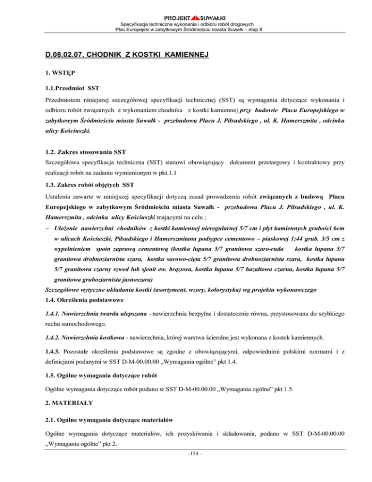 PROJEKT SUWAŁKI Specyfikacja techniczna wykonania i odbioru robót drogowych Plac Europejski w zabytkowym Śródmieściu miasta Suwałk – etap II D.08.02.07. CHODNIK Z KOSTKI KAMIENNEJ 1. WSTĘP 1.1.Przedmiot SST Przedmiotem niniejszej szczegółowej specyfikacji technicznej (SST) są wymagania dotyczące wykonania i odbioru robót związanych z wykonaniem chodnika z kostki kamiennej przy budowie Placu Europejskiego w zabytkowym Śródmieściu miasta Suwałk - przebudowa Placu J. Piłsudskiego , ul. K. Hamerszmita , odcinka ulicy Kościuszki. 1.2. Zakres stosowania SST Szczegółowa specyfikacja techniczna (SST) stanowi obowiązujący dokument przetargowy i kontraktowy przy realizacji robót na zadaniu wymienionym w pkt.1.1 1.3. Zakres robót objętych SST Ustalenia zawarte w niniejszej specyfikacji dotyczą zasad prowadzenia robót związanych z budową Placu Europejskiego w zabytkowym Śródmieściu miasta Suwałk - przebudowa Placu J. Piłsudskiego , ul. K. Hamerszmita , odcinka ulicy Kościuszki mającymi na celu ; − UłoŜenie nawierzchni chodników z kostki kamiennej nieregularnej 5/7 cm i płyt kamiennych grubości 6cm w ulicach Kościuszki, Piłsudskiego i Hamerszmitana podsypce cementowo – piaskowej 1;44 grub. 3/5 cm z wypełnieniem spoin zaprawą cementową (kostka łupana 5/7 granitowa szaro-ruda kostka łupana 5/7 granitowa drobnoziarnista szara, kostka surowo-cięta 5/7 granitowa drobnoziarnista szara, kostka łupana 5/7 granitowa czarny szwed lub sjenit ew. brązowa, kostka łupana 5/7 bazaltowa czarna, kostka łupana 5/7 granitowa gruboziarnista jasnoszara) Szczegółowe wytyczne układania kostki (asortyment, wzory, kolorystyka) wg projektu wykonawczego 1.4. Określenia podstawowe 1.4.1. Nawierzchnia twarda ulepszona - nawierzchnia bezpylna i dostatecznie równa, przystosowana do szybkiego ruchu samochodowego. 1.4.2. Nawierzchnia kostkowa - nawierzchnia, której warstwa ścieralna jest wykonana z kostek kamiennych. 1.4.3. Pozostałe określenia podstawowe są zgodne z obowiązującymi, odpowiednimi polskimi normami i z definicjami podanymi w SST D-M-00.00.00 „Wymagania ogólne” pkt 1.4. 1.5. Ogólne wymagania dotyczące robót Ogólne wymagania dotyczące robót podano w SST D-M-00.00.00 „Wymagania ogólne” pkt 1.5. 2. MATERIAŁY 2.1. Ogólne wymagania dotyczące materiałów Ogólne wymagania dotyczące materiałów, ich pozyskiwania i składowania, podano w SST D-M-00.00.00 „Wymagania ogólne” pkt 2. -154 - PROJEKT SUWAŁKI Specyfikacja techniczna wykonania i odbioru robót drogowych Plac Europejski w zabytkowym Śródmieściu miasta Suwałk – etap II 2.2. Kamienna kostka drogowa 2.2.1. Klasyfikacja Kamienna kostka drogowa wg PN-B-11100 jest stosowana do budowy nawierzchni z kostki kamiennej wg PN-S06100 NaleŜy zastosować kostkę: • Na chodnikach wzdłuŜ zabudowy ułoŜone będą modularne płyty (60 x 100 x 6 cm) z szarego granitu strzegomskiego w wykonaniu antypoślizgowym (płomieniowane lub groszkowane) obwiedzione kostką łupaną 5/7 cm w kolorze ciemnoszarym (np. granitowa Czarny Szwed lub sjenitowa, ew. bazaltowa). • W pasie pomiędzy deptakiem z płyt a elewacjami budynków kostka surowo-cięta 5/7 cm granitowa drobnoziarnista w kolorze szarym (bezpośrednio przy elewacjach przewidziano wykonanie pasa „buforowego” szer. ~ 30 − 50 cm z kostki łupanej 5/7 cm drobnoziarnistej, szarej). Dodatkowo w/w kostka surowo-cięta układana będzie w rejonie przejść dla pieszych. • W pasie pomiędzy deptakiem z płyt a drogami kołowymi kostka łupana 5/7 cm granitowa drobnoziarnista w kolorze szarym, we fragmentach uzupełniana kostką ciemnoszarą (granitowa Czarny Szwed lub sjenitowa, ew. bazaltowa). • Nawierzchnia chodników od strony parku z kostki łupanej 5/7 cm granitowej w kolorze szaro-rudym (identycznej, jak w alejach parkowych). • Dodatkowo, w obrębie całej posadzki, w miejscach szczególnych (linie podkreślające wzór posadzki, linie organizacji ruchu) przewidziano ułoŜenie kostki bazaltowej czarnej oraz 5/7 cm na chodnikach. . Do wykonania chodnika moŜna stosować kostkę kamienną nieregularną według PN-B-11100 [8]. W zaleŜności od jakości surowca skalnego uŜytego do wyrobu kostki, rozróŜnia się dwie klasy kostki: klasę I, klasę II. W zaleŜności od dokładności wykonania rozróŜnia się trzy gatunki kostki: - gatunek 1, - gatunek 2, - gatunek 3. W zaleŜności od wymiaru zasadniczego (wysokość kostki), rozróŜnia się następujące wielkości kostki nieregularnej - 5, 6, 8 i 10 (cm 2.3. Kostka kamienna - wymagania techniczne 2.3.1. Kształt i wymiary Kostka nieregularna powinna mieć kształt zbliŜony do prostopadłościanu. Kształt kostki nieregularnej przedstawia rysunek 1. -155 - PROJEKT SUWAŁKI Specyfikacja techniczna wykonania i odbioru robót drogowych Plac Europejski w zabytkowym Śródmieściu miasta Suwałk – etap II Rysunek 1. Kształt kostki nieregularnej Wymagania dotyczące wymiarów kostki nieregularnej przedstawia tablica 1. Tablica 1. Wymiary kostki nieregularnej oraz dopuszczalne odchyłki Wielkość (cm) Wyszczególnienie Wymiar a Stosunek pola powierzchni dolnej (stopki) do górnej (czoła) nie mniejszy niŜ Nierówności powierzchni górnej (czoła), nie większe niŜ Dopuszczalne odchyłki dla gatunku (cm) 1 2 3 ± 1,0 ± 1,0 ± 1,0 5 5 6 6 8 8 10 10 - - - - 0,7 0,6 0,5 - - - - ± 0,4 ± 0,6 ± 0,8 - - - - 0,6 0,6 0,8 - - - - ±6 ±8 ± 10 - - - - ±6 ±8 ± 10 Wypukłość powierzchni bocznej nie większa niŜ Odchyłki od kąta prostego krawędzi powierzchni górnej (czoła), w stopniach, nie większe niŜ Odchylenie od równoległości płaszczyzny powierzchni dolnej w stosunku do górnej, w stopniach, nie większe niŜ Dopuszcza się uszkodzenie jednego naroŜa powierzchni górnej kostki o głębokości nie większej niŜ 0,6 cm. Kostka moŜe mieć uszkodzenia krawędzi powierzchni czołowej o długości nie większej niŜ pół wymiaru wysokości (a), natomiast 