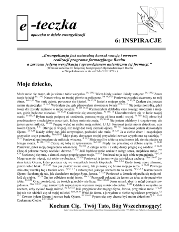 e -teczka apteczka w dziele ewangelizacji 6: INSPIRACJE „Ewangelizacja jest naturalną konsekwencją i owocem realizacji programu formacyjnego Ruchu a zarazem jedyną weryfikacją i sprawdzianem autentyzmu tej formacji." (Wnioski końcowe III Krajowej Kongregacji Odpowiedzialnych Ruchu w Niepokalanowie w dn. od 3 do 5 III 1978 r ) Moje dziecko, Może mnie nie znasz, ale ja wiem o tobie wszystko. Ps. 139,1 Wiem kiedy siadasz i kiedy wstajesz. Ps. 139,2 Znam twoje ścieżki. Ps. 139,3 Nawet włosy na twojej głowie są policzone. Mt 10,29-31 Ponieważ zostałeś stworzony na mój obraz. Rdz 1,27 We mnie żyjesz, poruszasz się i jesteś. Dz 17,28 Jesteś z mojego rodu. Dz 17,28 Znałem cię, jeszcze zanim się począłeś. Jr 1,4-5 Wybrałem cię, gdy planowałem stworzenie świata. Ef 1,11-12 Nie jesteś pomyłką, gdyż twoje dni zostały zapisane w mojej księdze. Ps 139 15-16 Wyznaczyłem dokładny czas twojego urodzenia i miejsce, gdzie będziesz mieszkał. Dz 17,26 Cudownie cię stworzyłem. Ps 139, 14 Ukształtowałem cię w łonie twojej matki. Ps 139,13 Byłem twoją podporą od urodzenia, pomocą twoją od łona matki twojej. Ps 71,6 Mój obraz był przedstawiony niewłaściwie przez tych, którzy mnie nie znają. J 8, 41-44 Nie jestem oddalony i rozgniewany, ale jestem pełen miłości, 1J 4,16 Pragnę wylać na ciebie moją miłość. 1J 3,1 Ponieważ jesteś moim dzieckiem, a ja twoim Ojcem. J 3,1 Oferuję ci więcej, niż mógł dać twój ziemski ojciec. Mt 7,11 Ponieważ jestem doskonałym Ojcem. Mt 5,48 Każdy dobry dar, jaki otrzymujesz, pochodzi ode mnie. Jk 1,17 Ja o ciebie dbam i zaspokajam wszystkie twoje potrzeby. Mt 6,31-33 Moje plany dotyczące twojej przyszłości zawsze wypełnione są nadzieją. Jr 29,11 Ponieważ umiłowałem cię miłością wieczną. Jr 31,3 Moje myśli o tobie są niezliczone jak ziemia piasku na brzegu morza. Ps 139, 17-18 Cieszę się tobą ze śpiewaniem. Sof 3,17 Nigdy nie przestanę ci dobrze czynić. Jr 32,40 Ponieważ jesteś moją drogocenna własnością. Wj 19,5 Z całego serca i z całej duszy pragnę cię osadzić. Jr 32,41 Chcę ci pokazać rzeczy wielkie i dziwne. Jr 33,3 Jeśli będziesz mnie szukać z całego serca, znajdziesz mnie. Pwt 4,29 Rozkoszuj się mną, a dam ci, czego pragnie serce twoje. Ps 37,4 Ponieważ to ja daję tobie te pragnienia. Flp 2,13 Mogę uczynić więcej, niż sobie wyobrażasz. Ef 3,20 Ponieważ ja jestem twoją największą zachętą. 2Tes 2,16-17 Jestem także Ojcem, który pociesza cię we wszystkich twoich kłopotach. 2Kor 1,3-4 Kiedy twoje serce złamane, jestem tobie bliski. Ps 34,18 Tak jak pasterz niesie owcę, tak ja noszę cię blisko mojego serca. Iz 40,11 Pewnego dnia otrę wszelką łzę z twoich oczu. Ap 21 3-4 I zabiorę ból, jakiego doznałeś tu na ziemi. Ap 21,3-4 Jestem twoim Ojcem i kocham cię tak, jak ukochałem mojego Syna, Jezusa. J 17,26 Ponieważ w Jezusie objawiła się moja miłość do ciebie. J 17,26 On jest odbiciem mojej istoty. Hbr 1,3 Przyszedł pokazać, że jestem za tobą, a nie przeciwko tobie. Rz 8,31 Oraz powiedzieć, że twoich grzechów nie liczę. 2Kor 5,18-19 Jezus umarł, abyś ty mógł dostąpić pojednania. 2Kor 5,18-19 Jego śmierć była najwyższym wyrazem mojej miłości do ciebie. J 4,10 Oddałem wszystko co kocham, żeby zyskać twoją miłość. Rz 8,31-32 Jeśli przyjmiesz dar mojego Syna, Jezusa, przyjmiesz mnie. 1J 2,23 Już nic nie oddzieli cię od mojej miłości. Rz 8,38-39 Wróć do domu, a ja wydam w niebie największe przyjęcie. Łk 15,7 Zawsze byłem Ojcem i zawsze będę Ojcem. Ef 3,14-15 Pytam cię: czy chcesz być moim dzieckiem? J 1, 12-13 Czekam na Ciebie. Łk 15,11-32 Kocham Cię. Twój Tato, Bóg Wszechmogący! Father’s Love Letter used by permission Father Heart Communications Copyright 1999-2005 www.FathersLoveLetter.com/Polish Przemyślenia na temat wybranych postaci biblijnych wykorzystanych do ewangelizacji wypracowane przez animatorów podczas przygotowań pantomim na adwentowych rekolekcjach ewangelizacyjnych w Warszawie w parafii na Przyrynku w 2009 r. NIKODEM SAMARYTANKA - dosłowne rozumienie Słowa; - jest nauczycielem – powinien przybliżać Boga, a naprawdę nie wie, o co chodzi; - przychodzi nocą – wstydzi się; - przychodzi do tego, którego potępiają faryzeusze; - ma wątpliwości o które nie pyta „swoich”, ale Jezusa; - racjonalista; - lubi ciemność – dobrze czuje się w swoich problemach (bo są mu znane?); - zważa na opinie innych; - boi się prawdy o sobie; - ślepy na miłość Bożą (bo grzech); - powtórne narodzenie – odłączenie od doczesności, grzechu – N. tego nie rozumie; chce trochę Boga, a trochę „starego człowieka”; - niewidoczny Duch Święty, znaki Boże nieoczywiste – N. chce dowodów, nie ufa Bogu; nawet jak są znaki może nie ufać (ciągle za mało…); - brak Światła w sercu; - homo videns, cywilizacja obrazkowa - człowiek potępia siebie za coś, za co Bóg go nie potępia; człowiek nie może wybaczyć sobie czegoś, co Bóg chce mu wybaczyć, co wybacza; - w świetle nie da się nic ukryć; - Słowo dla współczesnych jest nieżyciowe, odległe; - niektórzy, którzy są w Kościele: „po co mi spowiedź” – nie widzą zła w życiu, nie chcą się przyznać, nie chcą poznać prawdy o sobie; - człowiek nie pozwala sobie na porażki, bo chce czuć się dobrze; - życiowa asekuracja; - człowiek nie wierzy, że może w ogóle dojść do spotkania ja – Bóg; - niewiara, że Bóg w ogóle istnieje; - wstyd; - niezrozumienie; - lęk; - złe myślenie o sobie samym, które prowadzi do złego myślenia o ludziach; - niewiara, że Bóg może mnie przemienić, uczynić cud w moim życiu; nie jestem tego godny – inni może tak, ale nie ja; - Jezus łamie konwenanse i jest bezpośredni; - S. zdziwiona, zaskoczona obecnością J.; - S. szuka miłości; - pogubiła się w życiu - chce być szczęśliwa, próbuje różnych możliwości; - zmęczona