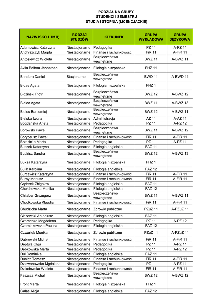 PODZIAŁ NA GRUPY STUDENCI I SEMESTRU STUDIA I STOPNIA (LICENCJACKIE) NAZWISKO I IMIĘ Adamowicz Katarzyna Andryszczyk Magda Antosiewicz Wioleta RODZAJ STUDIÓW KIERUNEK Niestacjonarne Pedagogika Niestacjonarne Finanse i rachunkowość Bezpieczeńswo Niestacjonarne wewnętrzne GRUPA WYKŁADOWA GRUPA JĘZYKOWA PZ 11 FiR 11 A-PZ 11 A-FiR 11 BWZ 11 A-BWZ 11 Avila Balboa Jhonathan Niestacjonarne Filologia hiszpańska Bandura Daniel Stacjonarne Bidas Agata Niestacjonarne Filologia hiszpańska Bidziński Piotr Niestacjonarne Bielec Agata Niestacjonarne Bielec Bartłomiej Niestacjonarne Bielska Iwona Bogdańska Aneta Niestacjonarne Niestacjonarne Borowski Paweł Niestacjonarne Boryceusz Paweł Brzezicka Marta Buczek Katarzyna Niestacjonarne Niestacjonarne Niestacjonarne Budzisz Sandra Niestacjonarne Buksa Katarzyna Niestacjonarne Filologia hiszpańska FHZ 1 Bulik Karolina Burcewicz Katarzyna Burny Mariusz Cąderek Zbigniew Chełchowska Monika Niestacjonarne Niestacjonarne Niestacjonarne Niestacjonarne Niestacjonarne FAZ 12 FiR 11 FiR 11 FAZ 11 FAZ 12 Bezpieczeńswo wewnętrzne Bezpieczeńswo wewnętrzne Bezpieczeńswo wewnętrzne Bezpieczeńswo wewnętrzne Administracja Pedagogika Bezpieczeńswo wewnętrzne Finanse i rachunkowość Pedagogika Filologia angielska Bezpieczeńswo wewnętrzne FHZ 11 BWD 11 A-BWD 11 FHZ 1 BWZ 12 A-BWZ 12 BWZ 11 A-BWZ 13 BWZ 12 A-BWZ 11 AZ 11 PZ 11 A-AZ 11 A-PZ 12 BWZ 11 A-BWZ 12 FiR 11 PZ 11 FAZ 11 A-FiR 11 A-PZ 11 BWZ 12 A-BWZ 13 Chodkowska Klaudia Filologia angielska Finanse i rachunkowość Finanse i rachunkowość Filologia angielska Filologia angielska Bezpieczeńswo Niestacjonarne wewnętrzne Niestacjonarne Finanse i rachunkowość Chudzicka Marta Niestacjonarne Zdrowie publiczne PZuZ 11 A-PZuZ 11 Ciszewski Arkadiusz Czarnecka Magdalena Czerniakowska Paulina Niestacjonarne Filologia angielska Niestacjonarne Pedagogika Niestacjonarne Filologia angielska FAZ 11 PZ 11 FAZ 12 A-PZ 12 Czwartek Monika Niestacjonarne Zdrowie publiczne PZuZ 11 A-PZuZ 11 Dąbrowski Michał Deptuła Olga Dębkowska Marta Dul Dominika Dunicz Tomasz Dziewanowska Mgdalena Dzikołowska Wioleta Niestacjonarne Niestacjonarne Niestacjonarne Niestacjonarne Niestacjonarne Niestacjonarne Niestacjonarne FiR 11 PZ 11 PZ 11 FAZ 11 FiR 11 PZ 11 FiR 11 A-FiR 11 A-PZ 11 A-PZ 12 A-FiR 11 A-PZ 11 A-FiR 11 BWZ 12 A-BWZ 12 Chilaber Grszegorz Faszcza Michał Finanse i rachunkowość Pedagogika Pedagogika Filologia angielska Finanse i rachunkowość Pedagogika Finanse i rachunkowość Bezpieczeńswo Niestacjonarne wewnętrzne A-FiR 11 A-FiR 11 BWZ 11 A-BWZ 11 FiR 11 A-FiR 11 Front Marta Niestacjonarne Filologia hiszpańska FHZ 1 Galas Alicja Niestacjonarne Filologia angielska FAZ 12 Gałązka Patrycja Gawrych Piotr Górecka Aleksandra Gugała Aneta Niestacjonarne Pedagogika Niestacjonarne Pedagogika Niestacjonarne Finanse i rachunkowość Bezpieczeńswo Niestacjonarne wewnętrzne Bezpieczeńswo Stacjonarne wewnętrzne Bezpieczeńswo Niestacjonarne wewnętrzne Niestacjonarne Finanse i rachunkowość Bezpieczeńswo Niestacjonarne wewnętrzne Niestacjonarne Administracja Gutowski Sebastian Niestacjonarne Zdrowie publiczne PZuZ 11 Guzik Żaneta Hereta Dawid Jabłecka Sylwia Jabłońska Joanna Jakubowska Klaudia Niestacjonarne Niestacjonarne Niestacjonarne Niestacjonarne Stacjonarne FAZ 11 FiR 11 PZ 11 FAZ 12 FAD 11 Jankowska Agata Niestacjonarne Zdrowie publiczne Jarzyna Aleksandra Stacjonarne Górska Karolina Górski Łukasz Górski Michał Grajda Kamil Grzelak Klaudia Filologia angielska Finanse i rachunkowość Pedagogika Filologia angielska Filologia angielska PZ 11 PZ 11 FiR 11 A-PZ 12 A-PZ 11 A-FiR 11 BWZ 11 A-BWZ 13 BWD 11 A-BWD 11 BWZ 12 A-BWZ 11 FiR 11 A-FiR 11 BWZ 11 A-BWZ 12 AZ 12 A-AZ 12 A-PZuZ 11 PZuZ 11 A-PZuZ 11 BWD 11 A-BWD 11 BWD 11 A-BWD 11 AZ 11 A-AZ 11 Jewdoszuk Rafał Bezpieczeńswo wewnętrzne Bezpieczeńswo Stacjonarne wewnętrzne Niestacjonarne Administracja Jezierska Sabina Niestacjonarne Filologia hiszpańska FHZ 1 Jędrych Klaudia Jędryszek Katarzyna Niestacjonarne Administracja Niestacjonarne Administracja AZ 12 AZ 11 Juraszewska Ewa Niestacjonarne Filologia hiszpańska FHZ 1 Jurczak Martyna Niestacjonarne Kaczmarczyk Anna Kaczyńska Anna Kaczyńska Monika Kalbarczyk Kacper Niestacjonarne Niestacjonarne Niestacjonarne Niestacjonarne Kalinowska Aleksandra Niestacjonarne Kalinowska Wioleta Niestacjonarne Kamińska Karolina Niestacjonarne Zdrowie publiczne Karczewski Patryk Niestacjonarne Karpińska Magdalena Kiepura Magdalena Kitlas Adam Klepczarek Daria Kocemba Szymon Niestacjonarne Niestacjonarne Niestacjonarne Niestacjonarne Niestacjonarne Kolmaga Aleksandra Niestacjonarne Filologia hiszpańska Komornicka Karolina Niestacjonarne Jasiński Piotr Bezpieczeńswo wewnętrzne Administracja Administracja Pedagogika Filologia angielska Bezpieczeńswo wewnętrzne Pedagogika Bezpieczeńswo wewnętrzne Administracja Finanse i rachunkowość Filologia angielska Administracja Filologia angielska A-FiR 11 A-PZ 12 A-AZ 12 A-AZ 11 BWZ 12 A-BWZ 13 AZ 12 AZ 11 PZ 11 FAZ 11 A-AZ 12 A-AZ 11 A-PZ 11 BWZ 11 A-BWZ 11 PZ 11 A-PZ 12 PZuZ 11 A-PZuZ 11 BWZ 12 A-BWZ 12 AZ 12 FiR 11 FAZ 12 AZ 11 FAZ 11 A-AZ 12 A-FiR 11 A-AZ 11 FHZ 11 Kondraciuk Adriana Kordek Małgorzata Korzeniak Katarzyna Bezpieczeńswo wewnętrzne Niestacjonarne Filologia angielska Niestacjonarne Pedagogika Stacjonarne Filologia angielska Kośmińska Daria Niestacjonarne Filologia hiszpańska FHZ 1 Kowalczyk Aleksandra Kowalczyk Łukasz Niestacjonarne Filologia hiszpańska Stacjonarne Filologia angielska FHZ 1 FAD 11 BWZ 11 A-BWZ 13 FAZ 12 PZ 11 FAD 11 A-PZ 11 Kozak Anna Niestacjonarne Zdrowie publiczne PZuZ 11 A-PZuZ 11 Koziarska Karolina Niestacjonarne Zdrowie publiczne PZuZ 11 A-PZuZ 11 Krajewska Kinga Kraśnicka Aneta Niestacjonarne Administracja Niestacjonarne Filologia angielska Bezpieczeńswo Stacjonarne wewnętrzne AZ 12 FAZ 11 A-AZ 12 BWD 11 A-BWD 11 Król Izabela Królikowska Katarzyna Niestacjonarne Filologia hiszpańska FHZ 1 Kr