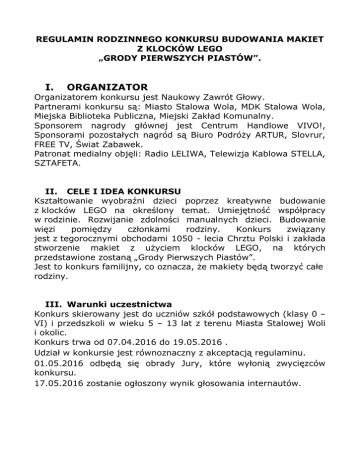 REGULAMIN RODZINNEGO KONKURSU BUDOWANIA MAKIET Z KLOCKÓW LEGO „GRODY PIERWSZYCH PIASTÓW”. I. ORGANIZATOR Organizatorem konkursu jest Naukowy Zawrót Głowy. Partnerami konkursu są: Miasto Stalowa Wola, MDK Stalowa Wola, Miejska Biblioteka Publiczna, Miejski Zakład Komunalny. Sponsorem nagrody głównej jest Centrum Handlowe VIVO!, Sponsorami pozostałych nagród są Biuro Podróży ARTUR, Slovrur, FREE TV, Świat Zabawek. Patronat medialny objęli: Radio LELIWA, Telewizja Kablowa STELLA, SZTAFETA. II. CELE I IDEA KONKURSU Kształtowanie wyobraźni dzieci poprzez kreatywne budowanie z klocków LEGO na określony temat. Umiejętność współpracy w rodzinie. Rozwijanie zdolności manualnych dzieci. Budowanie więzi pomiędzy członkami rodziny. Konkurs związany jest z tegorocznymi obchodami 1050 - lecia Chrztu Polski i zakłada stworzenie makiet z użyciem klocków LEGO, na których przedstawione zostaną „Grody Pierwszych Piastów”. Jest to konkurs familijny, co oznacza, że makiety będą tworzyć całe rodziny. III. Warunki uczestnictwa Konkurs skierowany jest do uczniów szkół podstawowych (klasy 0 – VI) i przedszkoli w wieku 5 – 13 lat z terenu Miasta Stalowej Woli i okolic. Konkurs trwa od 07.04.2016 do 19.05.2016 . Udział w konkursie jest równoznaczny z akceptacją regulaminu. 01.05.2016 odbędą się obrady Jury, które wyłonią zwycięzców konkursu. 17.05.2016 zostanie ogłoszony wynik głosowania internautów. IV. TERMINARZ Ogłoszenie konkursu: 7 kwietnia 2016 r. Składanie prac: od 28 do 29 kwietnia 2016 r. w godz. 15.00-18.00 Termin składania prac upływa 29 kwietnia 2016 r. o godzinie 18:00 Miejsce składania prac: Miejska Bibliotek Publiczna im. Melchiora Wańkowicza w Stalowej Woli, ul. Popiełuszki 10. Obrady jury odbędą się 30 kwietnia 2016 r. o godz. 9.00. Termin ogłoszenia wyników obrad Jury: 1 maja 2015r. o godz. 20.15 na scenie głównej przed Miejskim Domem Kultury. Termin głosowania na pozostałe prace (nie nagrodzone przez Jury). od 02.05.2016 do 15.05.2016 na specjalnie utworzonym wydarzeniu na FB Naukowego Zawrotu Głowy. Termin odbioru pracy – od 9 do 10.05.2016 w godzinach 15-18.00. V. FORMA SKŁADANIA PRAC Prace składane na konkurs muszą być dostarczone do Miejskiej Biblioteki Publicznej, gdzie zostaną podpisane i odpowiednio oznaczone. VI. NAGRODA Jury wyłoni trzy najlepsze prace. I Miejsce – wycieczka do LEGOLANDU w Danii dla jednego dziecka wraz z opiekunem. II Miejsce – voucher w kwocie 500zł na zakupy w sklepie Świat Zabawek w Centrum Handlowym VIVO!. III Miejsce – voucher w kwocie 400zł na zakupy w sklepie Świat Zabawek w Centrum Handlowym VIVO!. Przyznana zostanie również dodatkowa nagroda - voucher w kwocie 300zł na zakupy w sklepie Świat Zabawek w Centrum Handlowym VIVO! wyłoniona w głosowaniu internautów które będzie się odbywało w dniach 02.05.2016 do 15.05.2016 na specjalnie utworzonym wydarzeniu na FB Naukowego Zawrotu Głowy. Głosowanie internetowe odbędzie się po rozstrzygnięciu konkursu głównego i wezmą w nim udział wszystkie prace, które nie zostaną nagrodzone przez Jury. Dodatkowo makiety będą wyeksponowane w Miejskiej Bibliotece Publicznej od 30.04.2016 do 7.05.2016. Każdy uczestnik konkursu otrzyma dyplom zaświadczający o udziale w projekcie. VII. PRAWA AUTORSKIE Organizator ma prawo do bezpłatnej prezentacji wszystkich prac. Organizatorowi konkursu przysługuje prawo do bezpłatnego korzystania z wszystkich otrzymanych prac konkursowych na następujących polach eksploatacji: a) zwielokrotniania poprzez fotografowanie, drukowanie, wykonywanie odbitek, przy użyciu nośników cyfrowych, technik video, techniką komputerową lub przy pomocy rzutnika, b) publicznego udostępniania, tj. rozpowszechniania w szczególności na ogólnodostępnej wystawie, dla celów promocyjnych organizatora konkursu oraz w środkach masowego przekazu, a także wprowadzania do pamięci komputera, przesyłania za pomocą sieci multimedialnej, Internetu. Organizator ma obowiązek podczas wyżej wymienionych form prezentacji i udostępniania podpisywać autorów prezentowanych prac. VIII. Kontakt Osoba do kontaktu – w przypadku pytań odnośnie konkursu: Piotr Jaźwiński tel. 669 111 729, Monika Pączek tel. 690 022 303. IX. Skład Jury Przedstawiciel C.H. VIVO! Stalowa Wola Przedstawiciel Partnera Konkursu Naczelnik Wydziału Edukacji i Zdrowia Urzędu Miasta Stalowej Woli Dyrektor Miejskiego Domu Kultury X. Rozstrzygnięcie konkursu Jury wybierze najciekawszą pracę spośród szkół biorących udział w konkursie, ilustrującą najlepiej temat przewodni „Grody Pierwszych Piastów”. Kryteria oceny: wygląd zewnętrzny, estetyka, kreatywność, pomysłowość. XI. Ogłoszenie wyników konkursu Wyniki konkursu oraz wręczenie nagród będzie miało miejsce 1 maja 2016 roku o godzinie 20.15 na scenie głównej przy MDK w Stalowej Woli, natomiast Nagroda przyznana przez Internautów ogłoszona na stronie internetowej www.odkrywcy.edu.pl oraz FB Naukowego Zawrotu Głowy natomiast wręczenie nagrody odbędzie się w Szkole lub Przedszkolu ucznia, który został nagrodzony. XII. Uwagi dodatkowe Rozstrzygnięcie jury jest ostateczne od werdyktu nie przysługuje odwołanie). W głosowaniu internetowym zakazuje się korzystania z płatnej formy zbierania głosów (wykupu głosów) – w wyniku takiej sytuacji nastąpi dyskwalifikacja pracy. Organizator ma prawo do zmiany regulaminu. Wszelkie sprawy nie uwzględnione w regulaminie rozstrzyga Organizator. Dane osobowe wykorzystane są wyłącznie na cele konkursowe.