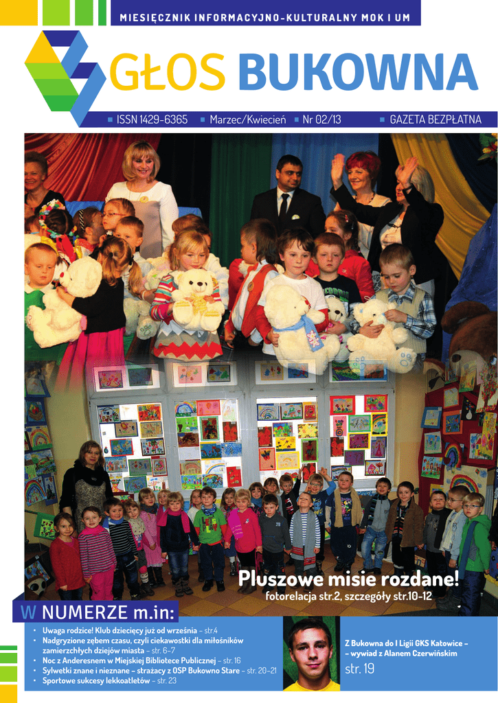 M I E S I Ę C Z N I K I N F O R M A C YJ N O - K U LT U R A L N Y M O K I U M GŁOS BUKOWNA ISSN 1429-6365 • Marzec/Kwiecień Nr 02/13 • GAZETA BEZPŁATNA Pluszowe misie rozdane! W NUMERZE m.in: fotorelacja str.2, szczegóły str.10-12 Uwaga rodzice! Klub dziecięcy już od września – str.4 Nadgryzione zębem czasu, czyli ciekawostki dla miłośników zamierzchłych dziejów miasta – str. 6–7 Noc z Anderesnem w Miejskiej Bibliotece Publicznej – str. 16 Sylwetki znane i nieznane – strażacy z OSP Bukowno Stare – str. 20–21 Sportowe sukcesy lekkoatletów – str. 23 GŁOS BUKOWNA Z Bukowna do I Ligii GKS Katowice – – wywiad z Alanem Czerwińskim str. 19 Marzec/Kwiecień Nr 02/13 Poetyckie laury rozdane po raz 21. Złoty Liść Bukowy, dwa wyróżnienia w kat.: regionalnej oraz poetyckiego sms-u VII Powiatowy Festiwal Kultury Dziecięcej Dla Przedszkolaków ,,O PLUSZOWEGO MISIA” Bukowno 2013 r. pod hasłem „Barwy świata wokół nas” c.d. str. 10 >> 2 GŁOS BUKOWNA Marzec/Kwiecień Nr 02/13 c.d. str. 9>> Mistrz Krótkiego Przekazu Złote Diabelskie Pióro, wyróżnienie w kategorii ogólnej Wyróżnienie w kat. poetyckiego sms-u Wyróżnienie w kat. poetyckiego sms-u Srebrny Liść Bukowy, Srebrne Diabelskie Pióro, Mistrz Krótkiego Przekazu Brązowe Diabelskie Pióro Z M mieniły się numery telefonów, na które możemy dodzwonić się do Urzędu Miejskiego. Ostatecznie zrezygnowano z analogowych linii telefonicznych PTSN, a do wykonywania i przyjmowania rozmów Urząd Miejski wykorzystuje już tylko cyfrowe 2 kanały ISDN BRA (2B+D) wraz z pulą numerów DDI oraz 2 kanały GSM. Do Urzędu dodzwonimy się więc wykręcając numer: 32-626-18-20. Z końcem kwietnia całkowicie przestaną działać cztery numery telefonów, do których można się było przez ostatnie lata przyzwyczaić: 642-10-38, 642-10-78, 642-11-08, 642-15-33 oraz dotychczasowe numery wewnętrzne. Pod numerem 32-626-18-20 uruchomiona została usługa infolinii, dzięki której dzwoniący przy użyciu swojej klawiatury - wciskając klawisz z odpowiednią cyfrą może wybrać połączenie z interesującym go referatem Urzędu. Jednocześnie Urząd Miejski w Bukownie udostępnia poniżej wykaz bezpośrednich numerów telefonicznych do poszczególnych referatów, zrealizowany dzięki zastosowaniu technologii DDI: • Sekretariat32 62 61 830 • Sekretariat32 62 61 831 • Urząd Stanu Cywilnego 32 62 61 839 • Referat Biuro Prawne 32 62 61 842 • Referat Przedsięwzięć Publicznych 32 62 61 835 • Referat Przedsięwzięć Publicznych (Kierownik) 32 62 61 833 • Referat Gospodarki Przestrzennej Nieruchomościami i Budownictwa 32 62 61 848 • Referat Przedsięwzięć Publicznych (Architektura) 32 62 61 855 • Referat Spraw Obywatelskich i OC 32 62 61 850 • Referat Spraw Obywatelskich i OC (Kierownik 32 62 61 853 • Stanowisko Zarządzania Kryzysowego 32 62 61 829 • Referat Organizacyjno-Administracyjny (Kierownik) 32 62 61 847 • Referat Organizacyjno-Administracyjny (Kadry) 32 62 61 857 • Referat Organizacyjno-Administracyjny (Elektroniczne Biuro Podawcze) 32 62 61 851 • Referat Organizacyjno-Administracyjny (Biuro Rady) 32 62 61 837 • Referat Rozwoju Miasta i Funduszy Zewnętrznych 32 62 61 836 • Referat Oświaty, Zdrowia i Pomocy Społecznej 32 62 61 828 • Referat Finansowo-Księgowy (Kierownik) 32 62 61 852 • Referat Finansowo-Księgowy (Podatki) 32 62 61 849 • Referat Finansowo-Księgowy 32 62 61 854 • Kasa32 62 61 856 • Referat Kontroli i Budżetu 32 62 61 858 • Referat Ochrony Środowiska i Rolnictwa 32 62 61 845 • Referat Gospodarki Lokalowej i Organizacji Transportu Lokalnego 32 62 61 846 • Referat Gospodarki Lokalowej i Organizacji Transportu Lokalnego (Kierownik)32 62 61 840 Numer faksu 32-642-15-44 pozostaje bez zmian. Za powstałe z tego powodu utrudnienia serdecznie przepraszamy. (um) GŁOS BUKOWNA miesięcznik wydawany przez MOK przy udziale Rady Miejskiej i Burmistrza Miasta, zrzeszony w Polskim Stowarzyszeniu Prasy Lokalnej Adres: 32-332 Bukowno, ul. Kolejowa 3, tel. 32/ 642 19 38 e-mail: [email protected] Redaktor naczelny: Iwona Jarno-Kurach ieszkańcy ulicy Granicznej od wielu lat czekali na wykonanie nawierzchni asfaltobetonowej. Ze względu na brak kanalizacji sanitarnej i deszczowej na tej ulicy prace inwestycyjne związane z budową drogi były wstrzymywane, a dojazd do budynków był utrzymywany przez doraźne uzupełnianie ubytków w nawierzchni tłuczniem. Jednak już niedługo się to zmieni i ulica Graniczna zyska nowe oblicze. W roku 2012 Spółka PWiK z Olkusza przystąpiła do budowy kanalizacji sanitarnej i wymiany wodociągu na tej ulicy. Dzięki staraniom Burmistrza Miasta tempo prac zostało zwiększone tak, aby zakończenie robót nastąpiło w pierwszym półroczu br. Ma on bowiem dalsze plany dotyczące zmian na ul. Granicznej. 5 kwietnia 2013 roku po przeprowadzeniu postępowania przetargowego podpisana została umowa z właścicielem firmy HANDREM – Wiesławem Słowikiem, na wykonanie kanalizacji deszczowej w ciągu ulicy Granicznej. Główna sieć ma powstać do końca maja br. Równocześnie Gmina Bukowno w lutym br. ogłosiła przetarg nieograniczony na roboty drogowe związane z budową ul. Granicznej. Po jego rozstrzygnięciu 2 kwietnia br. Burmistrz Miasta podpisał umowę z wybranym wykonawcą robót, tj. Przedsiębiorstwem Robót Drogowych w Olkuszu Sp. z o.o. Co ciekawe, do wyboru najlepszej oferty wykorzystano tzw. „elektroniczną dogrywkę”, dzięki czemu uzyskano spore oszczędności. Zgodnie z podpisaną umową na ul. Granicznej i łączniku do ul. Wodącej zostanie wykonana jezdnia asfaltobetonowa o szerokości 6m i chodnik po jednej stronie ulicy. Na odcinku od ul. Sławkowskiej na długości ok. 120m ze względu na małą szerokość dostępnego terenu zostanie wykonany ciąg pieszojezdny o szerokości 3m i nawierzchni z kostki brukowej. Całość prac ma zostać zakończona do dnia 15 październik