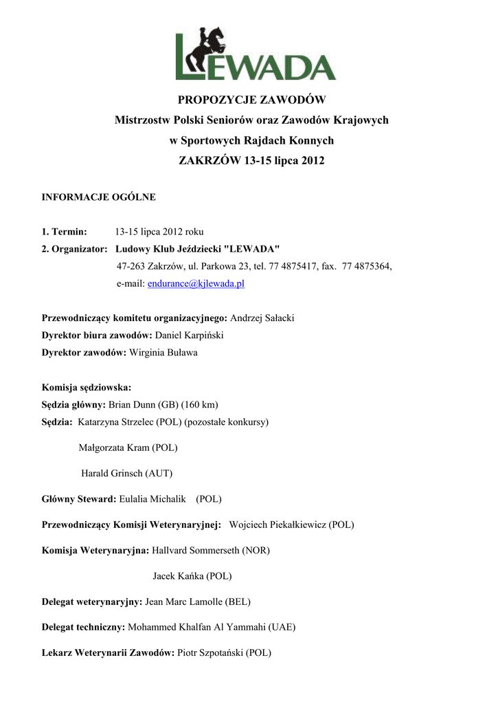 PROPOZYCJE ZAWODÓW Mistrzostw Polski Seniorów oraz Zawodów Krajowych w Sportowych Rajdach Konnych ZAKRZÓW 13-15 lipca 2012 INFORMACJE OGÓLNE 1. Termin: 13-15 lipca 2012 roku 2. Organizator: Ludowy Klub Jeździecki "LEWADA" 47-263 Zakrzów, ul. Parkowa 23, tel. 77 4875417, fax. 77 4875364, e-mail: [email protected] Przewodniczący komitetu organizacyjnego: Andrzej Sałacki Dyrektor biura zawodów: Daniel Karpiński Dyrektor zawodów: Wirginia Buława Komisja sędziowska: Sędzia główny: Brian Dunn (GB) (160 km) Sędzia: Katarzyna Strzelec (POL) (pozostałe konkursy) Małgorzata Kram (POL) Harald Grinsch (AUT) Główny Steward: Eulalia Michalik (POL) Przewodniczący Komisji Weterynaryjnej: Wojciech Piekałkiewicz (POL) Komisja Weterynaryjna: Hallvard Sommerseth (NOR) Jacek Kańka (POL) Delegat weterynaryjny: Jean Marc Lamolle (BEL) Delegat techniczny: Mohammed Khalfan Al Yammahi (UAE) Lekarz Weterynarii Zawodów: Piotr Szpotański (POL) Jarosław Rubesz (POL) Obsługa komputerowa, spikerka: Harald Grinsch (AUT) Serwis kowalski: Krystian Anioł 3. Miejsce: Ludowy Klub Jeździecki LEWADA; 47-263 Zakrzów, ul. Parkowa 23 4. Zgłoszenia: imienne do 8.06.2012, ostateczne do 29.06.2012 r. wyłącznie pisemne faxem lub emailem. Prosimy o dokładne zgłoszenie koni i zawodników (płeć konia oraz rocznik zawodnika). 5. Program zawodów: 12.07.2012 Czwartek godz. 17.00 - przegląd weterynaryjny dla konkursu nr 1, 2, 3 godz. 19.00 – odprawa techniczna w siedzibie LKJ Lewada (pałac) 13.07.2012 Piątek godz. 8.30 – konkurs nr 1 klasa N (85 km) godz. 9.00 – konkurs nr 2 klasa P (48 km) godz. 9.30 – konkurs nr 3 klasa L (30 km) godz. 17.00 – przegląd weterynaryjny dla konkursu nr 4 godz. 19.00 – odprawa techniczna w siedzibie LKJ Lewada (pałac) Godzina 8:30 – start konkurs nr 1 (kl. N – 85 km) Konkurs dla koni, które ukończyły 6 lat i zawodników od 14 roku życia. - tętno u konia nie może być wyższe niż 60 ud/min - konkurs rozgrywany na normę czasu z prędkością 10 – 16 km/h - czas przejazdu poszczególnych odcinków (pętli) zamykany na bramce weterynaryjnej, a całego dystansu na linii mety - czas przedstawienia konia do badania po każdym odcinku oraz po przekroczeniu linii mety wynosi 20 min. Bramki weterynaryjne: 37 km – obowiązkowy odpoczynek 30 min. 61 km – obowiązkowy odpoczynek 40 min. 85 km – meta Na ostatnich 500 m każdego odcinka trasy (pętli) kończącego się badaniem weterynaryjnym koń musi poruszać się kłusem lub galopem pod rygorem dyskwalifikacji Zasady rozgrywania konkursu zgodne z regulaminem dyscypliny obowiązującym dniu zawodów. Godzina 9:00 – start konkurs nr 2 (kl. P – 48 km) Konkurs dla koni, które ukończyły 5 lat i zawodników od 13 roku życia. - tętno maksymalne 60 ud/min. - czas przedstawienia konia do badania na bramce weterynaryjnej i na mecie – 20 minut - zawodnik ma możliwość dwukrotnego wejścia na bramkę weterynaryjną (z wyjątkiem bramki końcowej) - konkurs rozgrywany na normę czasu z prędkością 10 - 16 km/h - czas przejazdu poszczególnych odcinków (pętli) jest zamykany na bramce weterynaryjnej a całego dystansu na linii mety - limit prędkości obowiązuje na każdej pętli oddzielnie Bramki weterynaryjne: 24 km – obowiązkowy odpoczynek 30 min. 48 km – meta Na ostatnich 500 m każdego odcinka trasy (pętli) kończącego się badaniem weterynaryjnym koń musi poruszać się kłusem lub galopem pod rygorem dyskwalifikacji Zasady rozgrywania konkursu zgodne z regulaminem dyscypliny obowiązującym dniu zawodów. Godzina 9:30 – start konkurs nr 3 (kl. L – 30 km) Konkurs dla koni, które ukończyły 4 lata i zawodników od 12 roku życia - tętno maksymalne 60 ud./min. - czas przedstawienia konia do badania na bramce weterynaryjnej wynosi 20 minut - konkurs rozgrywany na normę czasu z prędkością 10 – 14 km/h - start indywidualny lub w grupach 2 – 3 osobowych - czas przejazdu jest zamykany na linii mety - przekroczenie normy czasu w górę i w dół powoduje eliminację - lotna bramka weterynaryjna w połowie dystansu 30 km – meta Na ostatnich 500 m trasy (pętli) koń musi poruszać się chodem wyższym, niż stęp pod rygorem eliminacji. Zasady rozgrywania konkursu zgodne z regulaminem dyscypliny obowiązującym dniu zawodów. 14.07.2012 Sobota godz. 6.00 – Start konkurs nr 4 (Mistrzostwa Polski Seniorów w ramach konkursu CEI3* 160 km na odbywających się równolegle zawodach międzynarodowych) 15.07.2012 Niedziela godz. 10.00 – ceremonia zakończenia zawodów i wręczenie nagród 6. Informacje o trasie: Pętle o długości: 15 km, 24 km, 37 km Podłoże: różnorodne drogi polne, kamieniste, trawiaste, odcinki asfaltu. Różnie wzniesień: do 50 m Start i meta przy stajniach LKJ LEWADA 7. Zebranie techniczne - czwartek, 12 lipca 2012 godz. 19.00 w pałacu- dla konkursu nr 1, 2, 3 - piątek, 13 lipca 2012 godz. 19.00 w pałacu- dla konkursu nr 4 Stajnie będą gotowe od godz.10.00 w czwartek 12 lipca 2012, pasza, żłoby i wiadra do pojenia własne. W ramach opłaty za boks Organizator zapewnia pierwszą ściółkę. Przy zgłoszeniach należy podać chęć zakupu dodatkowej ściółki – słoma 1 kostka 6 zł., siano 1 kostka 10 zł, balot trocin 50 zł. Wcześniejszy przyjazd lub dłuższy pobyt należy uzgodnić z wyprzedzeniem i odnotować w zgłoszeniu. Cisza nocna w stajniach od 22.00 do 06.00 8. Zawodników i konie obowiązuje pełna dokumentacja zgodna z w/wym. przepisami. Świadectwo wet. należy okazać przed wyładowaniem koni. Obowiązuje dokumentacja dla konia i zawodnika zgodna z przepisami Polskiego Związku Jeździeckiego. W czasie rajdu i treningu przed zawodami zawodnika obowiązuje twarde nakrycie głowy (kask z atestem), zgodne z przepisami obuwie oraz estetyczny ubiór. W przypadku braków w dokumentacji jeźdźca lub konia para nie będzie dopuszczona do startu w zawodach. Zawody rozgrywane będą zgodnie z obowiązującymi przepisami ogólnym