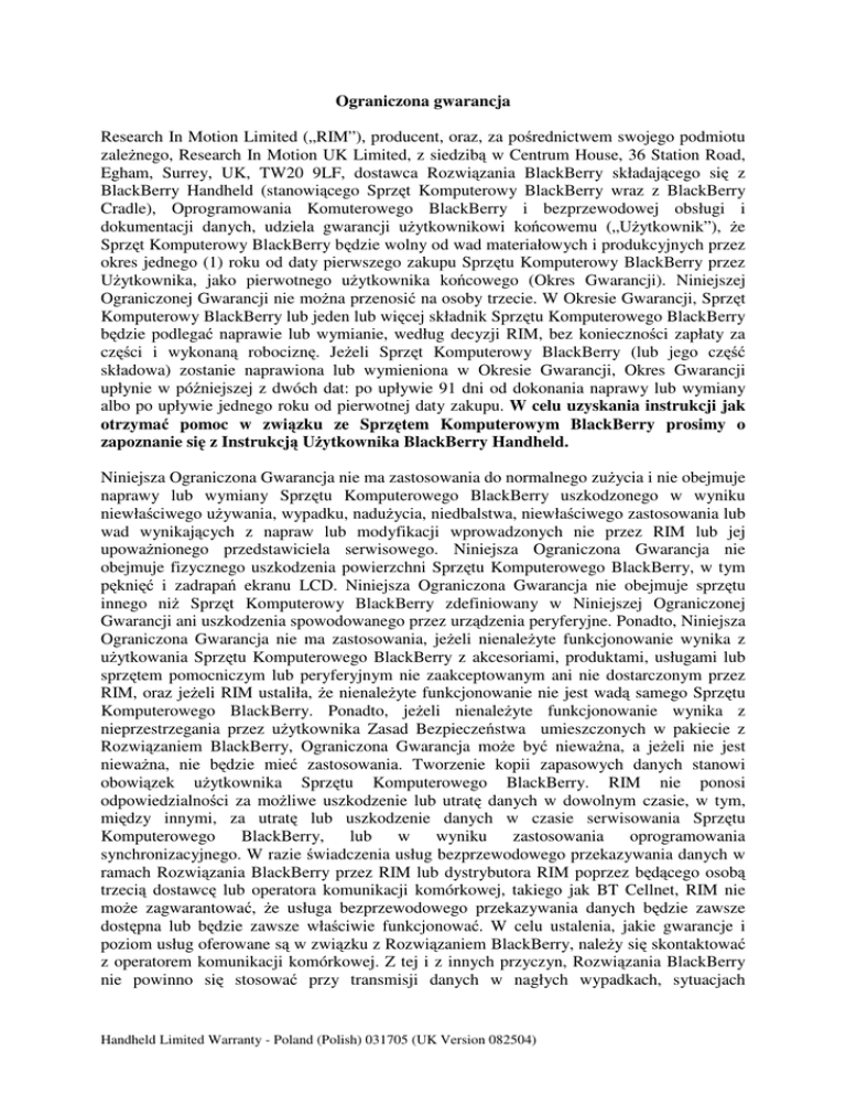 Ograniczona gwarancja Research In Motion Limited („RIM”), producent, oraz, za pośrednictwem swojego podmiotu zaleŜnego, Research In Motion UK Limited, z siedzibą w Centrum House, 36 Station Road, Egham, Surrey, UK, TW20 9LF, dostawca Rozwiązania BlackBerry składającego się z BlackBerry Handheld (stanowiącego Sprzęt Komputerowy BlackBerry wraz z BlackBerry Cradle), Oprogramowania Komuterowego BlackBerry i bezprzewodowej obsługi i dokumentacji danych, udziela gwarancji uŜytkownikowi końcowemu („UŜytkownik”), Ŝe Sprzęt Komputerowy BlackBerry będzie wolny od wad materiałowych i produkcyjnych przez okres jednego (1) roku od daty pierwszego zakupu Sprzętu Komputerowy BlackBerry przez UŜytkownika, jako pierwotnego uŜytkownika końcowego (Okres Gwarancji). Niniejszej Ograniczonej Gwarancji nie moŜna przenosić na osoby trzecie. W Okresie Gwarancji, Sprzęt Komputerowy BlackBerry lub jeden lub więcej składnik Sprzętu Komputerowego BlackBerry będzie podlegać naprawie lub wymianie, według decyzji RIM, bez konieczności zapłaty za części i wykonaną robociznę. JeŜeli Sprzęt Komputerowy BlackBerry (lub jego część składowa) zostanie naprawiona lub wymieniona w Okresie Gwarancji, Okres Gwarancji upłynie w późniejszej z dwóch dat: po upływie 91 dni od dokonania naprawy lub wymiany albo po upływie jednego roku od pierwotnej daty zakupu. W celu uzyskania instrukcji jak otrzymać pomoc w związku ze Sprzętem Komputerowym BlackBerry prosimy o zapoznanie się z Instrukcją UŜytkownika BlackBerry Handheld. Niniejsza Ograniczona Gwarancja nie ma zastosowania do normalnego zuŜycia i nie obejmuje naprawy lub wymiany Sprzętu Komputerowego BlackBerry uszkodzonego w wyniku niewłaściwego uŜywania, wypadku, naduŜycia, niedbalstwa, niewłaściwego zastosowania lub wad wynikających z napraw lub modyfikacji wprowadzonych nie przez RIM lub jej upowaŜnionego przedstawiciela serwisowego. Niniejsza Ograniczona Gwarancja nie obejmuje fizycznego uszkodzenia powierzchni Sprzętu Komputerowego BlackBerry, w tym pęknięć i zadrapań ekranu LCD. Niniejsza Ograniczona Gwarancja nie obejmuje sprzętu innego niŜ Sprzęt Komputerowy BlackBerry zdefiniowany w Niniejszej Ograniczonej Gwarancji ani uszkodzenia spowodowanego przez urządzenia peryferyjne. Ponadto, Niniejsza Ograniczona Gwarancja nie ma zastosowania, jeŜeli nienaleŜyte funkcjonowanie wynika z uŜytkowania Sprzętu Komputerowego BlackBerry z akcesoriami, produktami, usługami lub sprzętem pomocniczym lub peryferyjnym nie zaakceptowanym ani nie dostarczonym przez RIM, oraz jeŜeli RIM ustaliła, Ŝe nienaleŜyte funkcjonowanie nie jest wadą samego Sprzętu Komputerowego BlackBerry. Ponadto, jeŜeli nienaleŜyte funkcjonowanie wynika z nieprzestrzegania przez uŜytkownika Zasad Bezpieczeństwa umieszczonych w pakiecie z Rozwiązaniem BlackBerry, Ograniczona Gwarancja moŜe być niewaŜna, a jeŜeli nie jest niewaŜna, nie będzie mieć zastosowania. Tworzenie kopii zapasowych danych stanowi obowiązek uŜytkownika Sprzętu Komputerowego BlackBerry. RIM nie ponosi odpowiedzialności za moŜliwe uszkodzenie lub utratę danych w dowolnym czasie, w tym, między innymi, za utratę lub uszkodzenie danych w czasie serwisowania Sprzętu Komputerowego BlackBerry, lub w wyniku zastosowania oprogramowania synchronizacyjnego. W razie świadczenia usług bezprzewodowego przekazywania danych w ramach Rozwiązania BlackBerry przez RIM lub dystrybutora RIM poprzez będącego osobą trzecią dostawcę lub operatora komunikacji komórkowej, takiego jak BT Cellnet, RIM nie moŜe zagwarantować, Ŝe usługa bezprzewodowego przekazywania danych będzie zawsze dostępna lub będzie zawsze właściwie funkcjonować. W celu ustalenia, jakie gwarancje i poziom usług oferowane są w związku z Rozwiązaniem BlackBerry, naleŜy się skontaktować z operatorem komunikacji komórkowej. Z tej i z innych przyczyn, Rozwiązania BlackBerry nie powinno się stosować przy transmisji danych w nagłych wypadkach, sytuacjach Handheld Limited Warranty - Poland (Polish) 031705 (UK Version 082504) zagroŜenia Ŝycia lub innych sytuacjach krytycznych. RIM wyłącza wszelką odpowiedzialność w imieniu własnym i w imieniu swoich odsprzedawców za wydarzenia lub szkody wynikające z takiego zastosowania lub nienaleŜytego funkcjonowania usługi bezprzewodowego przekazywania danych lub jej niedostępności przy uŜytkowaniu Rozwiązania BlackBerry, w tym braku zasięgu usługi na obszarze, na którym UŜytkownik chce uŜyć Rozwiązanie BlackBerry. NAPRAWA LUB WYMIANA SPRZĘTU KOMPUTEROWEGO BLACKBERRY LUB USZKODZONEJ CZĘŚCI SKŁADOWEJ STANOWIĄ WYŁĄCZNE ODSZKODOWANIE W ZWIĄZKU Z KUPNEM I UśYWANIEM ROZWIĄZANIA BLACKBERRY. RIM, W IMIENIU WŁASNYM, SWOICH DYSTRYBUTORÓW I ODSPRZEDAWCÓW ROZWIĄZANIA BLACKBERRY, A TAKśE W IMIENIU SPÓŁEK KONTROLOWANYCH PRZEZ RIM LUB ZNAJDUJĄCYCH SIĘ WRAZ Z RIM POD WSPÓLNĄ KONTROLĄ, ORAZ PODMIOTÓW ZALEśNYCH RIM (ŁĄCZNIE ZWANYCH „GRUPĄ SPÓŁEK RIM”, A INDYWIDUALNIE „SPÓŁKĄ Z GRUPY RIM”), NINIEJSZYM WYŁĄCZA WSZELKIE INNE GWARANCJE, ZAPEWNIENIA, OŚWIADCZENIA, UDZIELONE WYRAŹNIE LUB W SPOSÓB DOROZUMIANY, W TYM USTAWOWE GWARANCJE W ZAKRESIE WARTOŚCI HANDLOWEJ, ZADOWALAJĄCEJ JAKOŚCI LUB PRZYDATNOŚCI DO OKREŚLONEGO CELU. NINIEJSZE POSTANOWIENIE NIE OGRANICZA PRAW USTAWOWYCH, JAKIE PRZYSŁUGUJĄ UśYTKOWNIKOWI JAKO KONSUMENTOWI. RIM ANI śADNA SPÓŁKA Z GRUPY RIM NIE BĘDZIE W śADNYM PRZYPADKU PONOSIĆ ODPOWIEDZIALNOŚCI ZA JAKIEKOLWIEK POŚREDNIE, PRZYPADKOWE, SPECJALNE LUB NASTĘPCZE STRATY LUB SZKODY (W TYM, ODSZKODOWANIE ZA SZKODĘ Z TYTUŁU UTRACONYCH KORZYŚCI, PRZERWY W DZIAŁALNOŚCI FIRMY, UTRATY INFORMACJI GOSPODARCZYCH LUB INNYCH SZKÓD FINANSOWYCH) WYNIKAJĄCE Z UśYWANIA LUB NIEMOśNOŚCI UśYWANIA OPROGRAMOWANIA, NAWET JEśELI RIM LUB GRUPA RIM ZOSTAŁY ZAWIADOMIONE O MOśLIWOŚCI WYSTĄPIENIA TAKICH SZKÓD. NINIEJSZE WYŁĄCZENIE ODPOWIEDZIALNOŚCI MA BYĆ STOSOWANE I JE