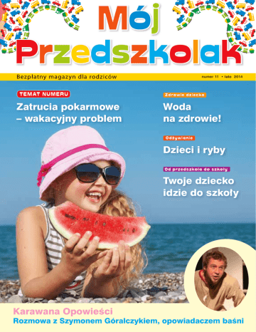 Mój Przedszkolak Bezpłatny magaz yn dla rodziców TE MAT N U M E RU Zatrucia pokarmowe – wakacyjny problem numer 11 • lato 2014 Zd rowie d z iec ka Woda na zdrowie! Od ż ywia n ie Dzieci i ryby Od p rzed sz ko l a d o sz ko ł y Twoje dziecko idzie do szkoły Karawana Opowieści Rozmowa z Szymonem Góralczykiem, opowiadaczem baśni Mój Przedszkolak Z Drodzy Czytelnicy! bliża się upragniony czas odpoczynku, zabawy i dni beztrosko spędzanych na ulubionych rozrywkach. Wasze dzieci na pewno nie mogą się doczekać pakowania walizek i wyjazdu na zaplanowane od dawna wakacje. Jeśli wybieramy się w długą podróż, musimy pamiętać, że mali pasażerowie szybko się nudzą i droga może okazać się męcząca nie tylko dla dzieci, ale także dla rodziców, którzy są zasypywani pytaniami – daleko jeszcze? W bieżącym numerze podpowiadamy, jak temu zaradzić i jak przygotować się do wyprawy z dzieckiem tak, by już sama podróż do miejsca docelowego była dla malucha wspaniałą przygodą. W magazynie poruszamy również kwestie związane z bezpieczeństwem dzieci podczas letniego wypoczynku. Jak bezpiecznie korzystać z kąpielisk? Jak uniknąć niekorzystnego działania słońca? Na te i inne pytania znajdą Państwo odpowiedzi wewnątrz numeru. Zamów bezpłatną prenumeratę na www.mojprzedszkolak.com.pl Wizyty u lekarza obawiają się nie tylko dzieci, ale również rodzice. Co zrobić, by takie spotkanie przebiegło bez problemu? W artykule Pan kotek był chory i leżał w łóżeczku radzimy, jak najlepiej przygotować siebie i dziecko na wizytę u lekarza. Zapraszam do lektury i życzę udanych i bezpiecznych wakacji Jesteśmy już na Facebooku! Dołącz do nas! Mój Przedszkolak Bezpłatny magaz yn dla rodziców Wydawca Forum Media Polska Sp. z o.o. Sąd Rejonowy Nowe Miasto i Wilda w Poznaniu VIII Wydział Gospodarczy KRS KRS nr 0000037307 REGON 631046924 NIP 781-15-51-223 Kapitał zakładowy: 300 000,00 zł Prezes Zarządu Magdalena Balanicka Daria Poniedziałek Zastępca Redaktora Naczelnego Redakcja ul. Polska 13, 60-595 Poznań www.mojprzedszkolak.com.pl [email protected] Redaktor Naczelny Katarzyna Grunt-Segień Zastępca Redaktora Naczelnego Daria Poniedziałek Koordynacja projektu Kamila Subel [email protected] Redaktor techniczny Edyta Żmuda Reklama Iza Łagódka [email protected] 61 66 55 779 Ewa Mokrzycka tel. 61 66 83 103, fax 61 66 55 799 [email protected] Infolinia 0 801 88 44 22 61 66 55 800 Projekt graficzny/DTP Yezioro Druk ORTIS Nakład 120000 egzemplarzy Serwis zdjęciowy Dreamstime Spis t reśc i Szc zęś l iwy rod z ic 6 Bez piec ze ń stwo d z iec ka Mały podróżnik „Już dojechaliśmy…?!” Zatrucia pokarmowe – wakacyjny problem Karawana opowieści. Rozmowa z Szymonem Góralczykiem, opowiadaczem baśni twoje dziecko idzie do szkoły 26 29 37 46 Jak zaczarować pokój dziecka Jaś z kompleksami Ka n a powe p rz y g od y Mądre bajki, mądre dziecko To się c z y ta 48 Zd rowie d z iec ka 17 18 20 40 44 Od p rzed sz ko l a d o sz ko ł y 15 38 S E N S po l eca Wywiad n u m e ru 11 Na plaży fajnie jest Rozwój d z iec ka Te m at n u m e ru 8 35 Polecamy książki Dzień dziecka na sportowo Woda na zdrowie! Pan kotek był chory i leżał w łóżeczku. I przyszedł kot doktor… Auuuuu… coś mnie ugryzło! Gdy słońce praży… Jak chronić dziecko przed upałem od A do Z Wszawica – wstydliwy problem Choroba lokomocyjna – jak ją pokonać? N owe tec h n o l og ie 24 Strona internetowa przedszkola Od ż ywia n ie 32 Dzieci i ryby W NASTĘ PN Y M N U M E RZ E Jesienne przeziębienia. Najskuteczniejsze sposoby zapobiegania chorobom Kiedy rysunki dziecka powinny nas zaniepokoić? Grypa jelitowa. Jak pomóc dziecku? Lekcja dobrych manier – gry i zabawy, które pomogą nauczyć dziecko właściwych zachowań w różnych sytuacjach 2 Mój Przedszkolak SMARtFON VERtIS FAMY – DOŁĄCZ DO RODZINY FAMY! C zy masz już telefon dla swojej rodzinki? Dołącz do wesołej rodzinki Vertis Famy! W bardzo korzystnej cenie dostajesz do ręki pełnowartościowy smartfon z dostępem do internetu, grami i możliwością odtwarzania swojej ulubionej muzyki. Prosta obsługa, kolorowa obudowa i dostęp do marketu bezpłatnych aplikacji to tylko niektóre z jego funkcji. W tym telefonie obejrzysz swój ulubiony klip na YouTube, nagrasz krótki filmik i zrobisz zdjęcia. Vertis Famy to idealny prezent dla Twoich rodziców, rodzeństwa.. i CIEBIE! Smartfon dla chłopca i dziewczynki z darmowym internetem! Koniec z nudą! Dzięki kolorowym obudowom dopasujesz smartfon do swojego stylu. W telefonie zamontowano także moduł GPS (dzięki któremu nigdy się nie zgubisz), WiFi i 3G (obsługujący jedyny w Polsce darmowy internet). W zestawie z kompaktowym telefonem znajdziesz słuchawki, kabel USB (umożliwiający połączenie z komputerem) i folię ochronną na wyświetlacz (chroniącą przed zabrudzeniem). Smartfon dostępny w kolorach: białym, czarnym i niebieskim. Więcej informacji znajdziesz na: www.overmax.pl Smartfon kupisz m.in. w sklepie internetowym: www.overmania.pl oraz w największych sieciach handlowych w kraju. Cena ok. 250 zł R EK L A M A Profilaktyka Tylko słońce i relaks – żadnych zmartwień do 20% rabatu na szczepionki Zaszczep siebie i najbliższych przed podróżą w kraje tropikalne Akcja szczepień ochronnych trwa do 30.06.2014 Dowiedz się więcej www.promocja.medicover.pl/wakacje 3 Wa r t o wi e d z i e ć NOWOŚĆ VitaBox Owocowe uderzenie witamin Producent: BioGarden Zawartość: 40 kapsułek Cena detaliczna: 40 tab. około 25 zł Nie zawsze dostarczamy organizmowi odpowiedniej dawki minerałów i witamin. Niedobory skutkują bólem głowy, strzykaniem w łydkach czy spadkiem energii w ciągu dnia. Czasem bez powodu czujemy się osłabieni i częściej chorujemy. J E D Y N Y N A R Y N K U produk t Z E K S T R A K T E M Z 6 O W O C Ó W ! A wystarczy urozmaicić naszą dietę oraz wzbogacić ją preparatem wielowitaminowym