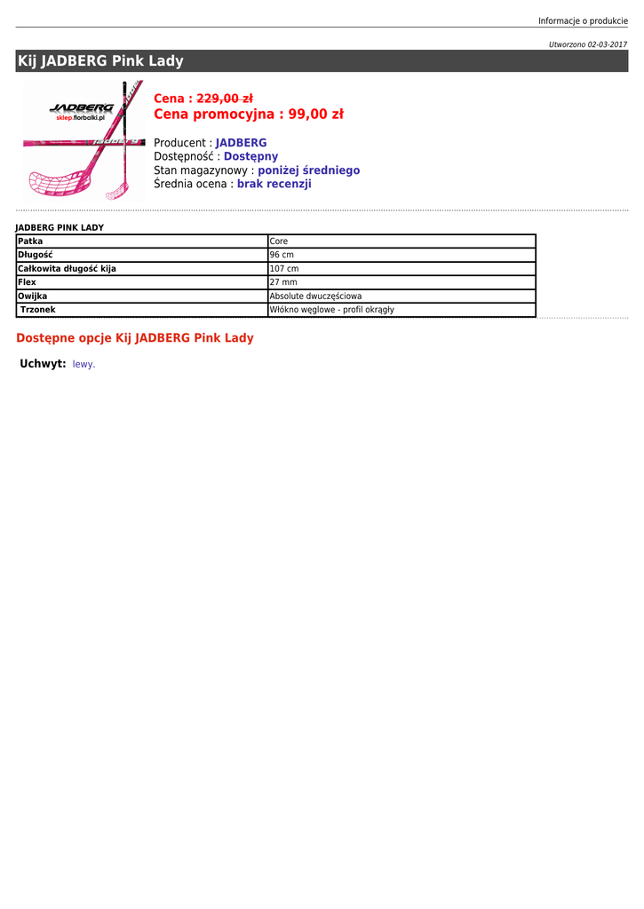 Informacje o produkcie Utworzono 02-03-2017 Kij JADBERG Pink Lady Cena : 229,00 zł Cena promocyjna : 99,00 zł Producent : JADBERG Dostępność : Dostępny Stan magazynowy : poniżej średniego Średnia ocena : brak recenzji JADBERG PINK LADY Patka Core Długość 96 cm Całkowita długość kija 107 cm Flex 27 mm Owijka Absolute dwuczęściowa Trzonek Dostępne opcje Kij JADBERG Pink Lady Uchwyt: lewy. Włókno węglowe - profil okrągły