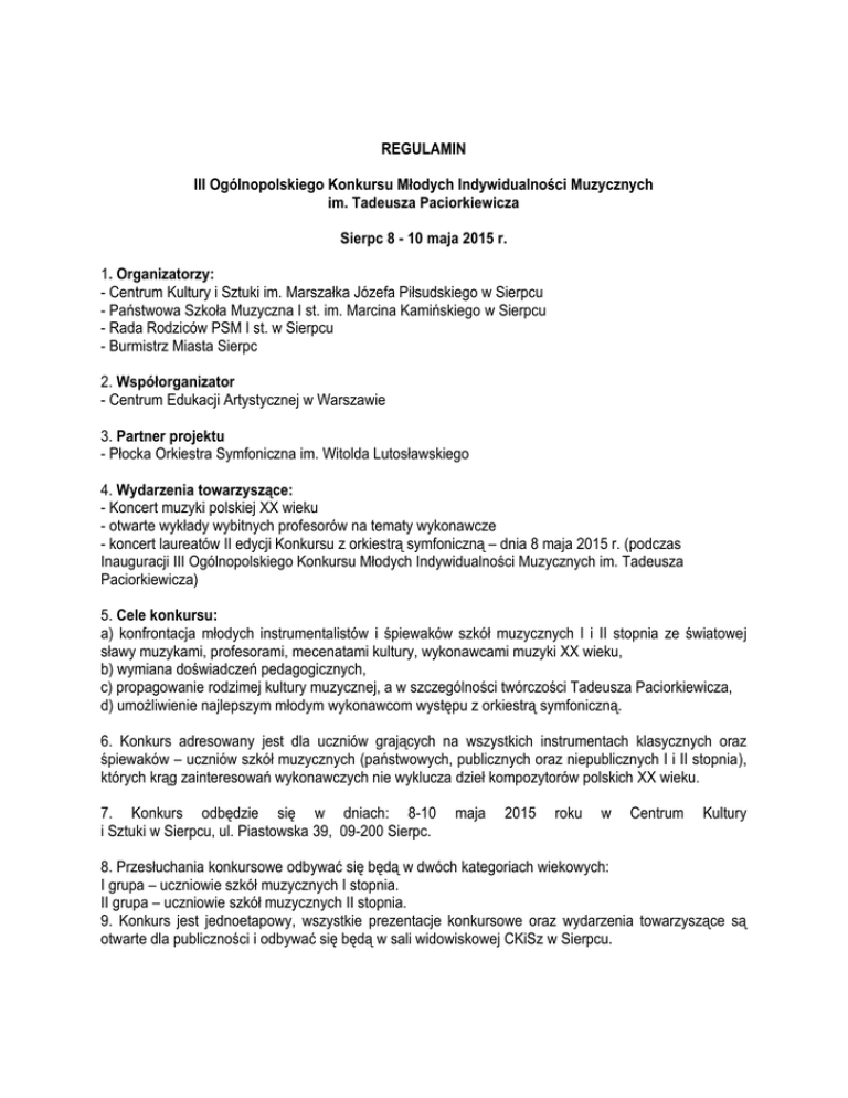 REGULAMIN III Ogólnopolskiego Konkursu Młodych Indywidualności Muzycznych im. Tadeusza Paciorkiewicza Sierpc 8 - 10 maja 2015 r. 1. Organizatorzy: - Centrum Kultury i Sztuki im. Marszałka Józefa Piłsudskiego w Sierpcu - Państwowa Szkoła Muzyczna I st. im. Marcina Kamińskiego w Sierpcu - Rada Rodziców PSM I st. w Sierpcu - Burmistrz Miasta Sierpc 2. Współorganizator - Centrum Edukacji Artystycznej w Warszawie 3. Partner projektu - Płocka Orkiestra Symfoniczna im. Witolda Lutosławskiego 4. Wydarzenia towarzyszące: - Koncert muzyki polskiej XX wieku - otwarte wykłady wybitnych profesorów na tematy wykonawcze - koncert laureatów II edycji Konkursu z orkiestrą symfoniczną – dnia 8 maja 2015 r. (podczas Inauguracji III Ogólnopolskiego Konkursu Młodych Indywidualności Muzycznych im. Tadeusza Paciorkiewicza) 5. Cele konkursu: a) konfrontacja młodych instrumentalistów i śpiewaków szkół muzycznych I i II stopnia ze światowej sławy muzykami, profesorami, mecenatami kultury, wykonawcami muzyki XX wieku, b) wymiana doświadczeń pedagogicznych, c) propagowanie rodzimej kultury muzycznej, a w szczególności twórczości Tadeusza Paciorkiewicza, d) umożliwienie najlepszym młodym wykonawcom występu z orkiestrą symfoniczną. 6. Konkurs adresowany jest dla uczniów grających na wszystkich instrumentach klasycznych oraz śpiewaków – uczniów szkół muzycznych (państwowych, publicznych oraz niepublicznych I i II stopnia), których krąg zainteresowań wykonawczych nie wyklucza dzieł kompozytorów polskich XX wieku. 7. Konkurs odbędzie się w dniach: 8-10 i Sztuki w Sierpcu, ul. Piastowska 39, 09-200 Sierpc. maja 2015 roku w Centrum Kultury 8. Przesłuchania konkursowe odbywać się będą w dwóch kategoriach wiekowych: I grupa – uczniowie szkół muzycznych I stopnia. II grupa – uczniowie szkół muzycznych II stopnia. 9. Konkurs jest jednoetapowy, wszystkie prezentacje konkursowe oraz wydarzenia towarzyszące są otwarte dla publiczności i odbywać się będą w sali widowiskowej CKiSz w Sierpcu. 10. Program musi zawierać co najmniej jeden utwór kompozytora polskiego XX wieku. W grupie I dozwolone jest wykonanie transkrypcji dzieła polskiego kompozytora XX wieku. Program konkursowy należy wykonać z pamięci. Utwory napisane po 1945 roku oraz sonaty mogą być wykonywane z nut. a) I grupa – dowolny program, którego łączny czas nie przekracza 15 minut, b) II grupa: - instrumentaliści - dowolny program, którego łączny czas nie przekracza 25 minut, - śpiewacy - dowolny program, którego łączny czas nie przekracza 15 min. 11. Każdy uczestnik będzie miał możliwość usłyszenia opinii na temat swojego występu od każdego członka jury. 12. Zgłoszenia uczestników wraz z drukiem potwierdzającym przelew opłaty wpisowej należy przesłać drogą elektroniczną na adres: [email protected] w nieprzekraczalnym terminie – do 10. 04. 2015 r. Formularz zgłoszeniowy znajduje się na stronach: www.ckisz.sierpc.pl oraz www.szkolamuzycznasierpc.pl 13. Uczestnicy są obowiązani do wpłaty wpisowego w wysokości: 100 zł. do dnia 10. 04. 2015 r. na rachunek: Centrum Kultury i Sztuki w Sierpcu Bank Pekao S.A O/Sierpc 40 1240 3204 1111 0010 4910 4812 Z dopiskiem: „Paciorkiewicz – Konkurs 2015” W tytule przelewu prosimy wpisać imię i nazwisko ucznia oraz nazwę szkoły muzycznej, którą reprezentuje (w razie braku danych ucznia, wpłata nie zostanie odnotowana). 14. Wpisowe nie podlega zwrotowi. 15. Organizatorzy nie zapewniają akompaniatorów. Koszty dojazdu, zakwaterowania oraz wyżywienia uczestnicy pokrywają we własnym zakresie. 16. Osoby nagrodzone (wytypowane przez jury) zobowiązane są do uczestnictwa w koncercie laureatów z orkiestrą symfoniczną, który odbędzie się podczas inauguracji IV edycji Konkursu w Centrum Kultury i Sztuki w Sierpcu. 17. Organizatorzy zastrzegają sobie prawo do nieodpłatnych nagrań w czasie trwania przesłuchań konkursowych i koncertu laureatów do celów archiwalnych. 18. Jury ma prawo przerwania występu uczestnika, jeśli produkcja przekroczy czas określony w regulaminie. 19. Decyzje jury są nieodwołalne. 20. Informacje szczegółowe organizatorzy opublikują na stronie internetowej Centrum Kultury i Sztuki w Sierpcu www.ckisz.sierpc.pl oraz Państwowej Szkoły Muzycznej im. Marcina Kamińskiego w Sierpcu www.szkolamuzycznasierpc.pl do końca stycznia 2015 r. 21. Jury konkursy, złożone z wybitnych polskich artystów, powołane zostało przez Dyrektora Centrum Edukacji Artystycznej w Warszawie. 22. Organizatorzy powołają także „Jury Młodych” składające się z wybranych uczniów szkół muzycznych i ogólnokształcących. Jury młodych, składające się z co najmniej 10 osób, przyzna nagrodę publiczności. 23. Nagrody: a) Nagrodą główną III Ogólnopolskiego Konkursu Młodych Indywidualności Muzycznych im. Tadeusza Paciorkiewicza jest występ z orkiestrą symfoniczną podczas koncertu inaugurującego IV Ogólnopolski Konkurs Młodych Indywidualności Muzycznych im. Tadeusza Paciorkiewicza. Nagrodę w postaci koncertu z orkiestrą otrzymują laureaci wytypowani przez Jurorów. b) Zdobywcy pierwszych trzech miejsc i laureat nagrody publiczności otrzymają statuetki oraz dyplomy laureatów. c) Wszyscy laureaci oraz wyróżnieni uczestnicy w postaci książek, płyt CD i DVD o tematyce muzycznej. d) Dyplomy oraz nagrody rzeczowe Koncertu Laureatów w dniu 10 maja 2015 r. zostaną konkursu wręczone otrzymają nagrody laureatom podczas e) Przewidziane są nagrody pozaregulaminowe. 24. Udział w konkursie jest równoznaczny z wyrażeniem zgody na przetwarzanie danych osobowych jego uczestników na potrzeby konkursu (ustawa o ochronie danych osobowych z dnia 29.08.1997r. Dz.U. Nr 133, poz. 833 z późn. zm.). Kontakt: [email protected] oraz sekretariat PSM I st. im. Marcina Kamińskiego w Sierpcu – tel. 24-275-10-30