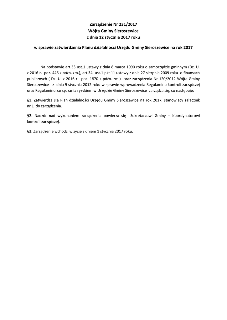 Zarządzenie Nr 231/2017 Wójta Gminy Sieroszewice z dnia 12 stycznia 2017 roku w sprawie zatwierdzenia Planu działalności Urzędu Gminy Sieroszewice na rok 2017 Na podstawie art.33 ust.1 ustawy z dnia 8 marca 1990 roku o samorządzie gminnym (Dz. U. z 2016 r. poz. 446 z późn. zm.), art.34 ust.1 pkt 11 ustawy z dnia 27 sierpnia 2009 roku o finansach publicznych ( Dz. U. z 2016 r. poz. 1870 z późn. zm.) oraz zarządzenia Nr 120/2012 Wójta Gminy Sieroszewice z dnia 9 stycznia 2012 roku w sprawie wprowadzenia Regulaminu kontroli zarządczej oraz Regulaminu zarządzania ryzykiem w Urzędzie Gminy Sieroszewice zarządza się, co następuje: §1. Zatwierdza się Plan działalności Urzędu Gminy Sieroszewice na rok 2017, stanowiący załącznik nr 1 do zarządzenia. §2. Nadzór nad wykonaniem zarządzenia powierza się kontroli zarządczej. Sekretarzowi Gminy – Koordynatorowi §3. Zarządzenie wchodzi w życie z dniem 1 stycznia 2017 roku. UZASADNIENIE do Zarządzenia Nr 231/2017 Wójta Gminy Sieroszewice z dnia 12 stycznia 2017 roku w sprawie zatwierdzenia Planu działalności Urzędu Gminy Sieroszewice na rok 2017 W związku z realizacją kontroli zarządczej w Urzędzie Gminy Sieroszewice na podstawie ustawy o finansach publicznych oraz Zarządzenia Nr 120/2012 Wójta Gminy Sieroszewice z dnia 9 stycznia 2012 roku w sprawie wprowadzenia Regulaminu kontroli zarządczej oraz Regulaminu zarządzania ryzykiem w Urzędzie Gminy Sieroszewice Wójt jako kierownik jednostki do końca stycznia zatwierdza Plan działalności na dany rok. Zarządzeniem Wójta Nr 231/2017 z dnia 12 stycznia 2017 roku zatwierdza się Plan działalności Urzędu Gminy Sieroszewice na rok 2017. W związku z powyższym wydanie niniejszego zarządzenia jest uzasadnione.