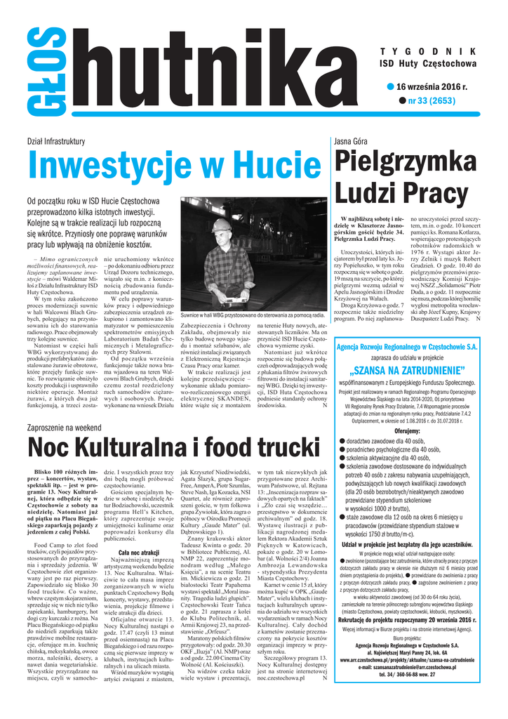 t y g o d n i k ISD Huty Częstochowa l 16 września 2016 r. l nr 33 (2653) Dział Infrastruktury Jasna Góra Inwestycje w Hucie Pielgrzymka Ludzi Pracy Od początku roku w ISD Hucie Częstochowa przeprowadzono kilka istotnych inwestycji. Kolejne są w trakcie realizacji lub rozpoczną się wkrótce. Przyniosły one poprawę warunków pracy lub wpływają na obniżenie kosztów. – Mimo ograniczonych możliwości finansowych, realizujemy zaplanowane inwestycje – mówi Waldemar Miłoś z Działu Infrastruktury ISD Huty Częstochowa. W tym roku zakończono proces modernizacji suwnic w hali Walcowni Blach Grubych, polegający na przystosowaniu ich do starowania radiowego. Prace obejmowały trzy kolejne suwnice. Natomiast w części hali WBG wykorzystywanej do produkcji prefabrykatów zainstalowano żurawie obrotowe, które przejęły funkcje suwnic. To rozwiązanie obniżyło koszty produkcji i usprawniło niektóre operacje. Montaż żurawi, z których dwa już funkcjonują, a trzeci zosta- nie uruchomiony wkrótce – po dokonaniu odbioru przez Urząd Dozoru technicznego, wiązało się m.in. z koniecznością zbudowania fundamentu pod urządzenia. W celu poprawy warunków pracy i odpowiedniego zabezpieczenia urządzeń zakupiono i zamontowano klimatyzator w pomieszczeniu spektrometrów emisyjnych Laboratorium Badań Chemicznych i Metalograficznych przy Stalowni. Od początku września funkcjonuje także nowa brama wjazdowa na teren Walcowni Blach Grubych, dzięki czemu został rozdzielony ruch samochodów ciężarowych i osobowych. Prace, wykonane na wniosek Działu W najbliższą sobotę i niedzielę w Klasztorze Jasnogórskim gościć będzie 34. Pielgrzmka Ludzi Pracy. Suwnice w hali WBG przystosowano do sterowania za pomocą radia. Zabezpieczenia i Ochrony Zakładu, obejmowały nie tylko budowę nowego wjazdu i montaż szlabanów, ale również instalacji związanych z Elektroniczną Rejestracja Czasu Pracy oraz kamer. W trakcie realizacji jest kolejne przedsięwzięcie – wykonanie układu pomiarowo-rozliczeniowego energii elektrycznej SKANDEN, które wiąże się z montażem na terenie Huty nowych, atestowanych liczników. Ma on przynieść ISD Hucie Częstochowa wymierne zyski. Natomiast już wkrótce rozpocznie się budowa połączeń odprowadzających wodę z płukania filtrów żwirowych filtrowni do instalacji sanitarnej WBG. Dzięki tej inwestycji, ISD Huta Częstochowa podniesie standardy ochrony środowiska. N Zaproszenie na weekend Noc Kulturalna i food trucki Blisko 100 różnych imprez – koncertów, wystaw, spektakli itp. – jest w programie 13. Nocy Kulturalnej, która odbędzie się w Częstochowie z soboty na niedzielę. Natomiast już od piątku na Placu Biegańskiego zaparkują pojazdy z jedzeniem z całej Polski. Food Camp to zlot food trucków, czyli pojazdów przystosowanych do przyrządzania i sprzedaży jedzenia. W Częstochowie zlot organizowany jest po raz pierwszy. Zapowiedziało się blisko 30 food trucków. Co ważne, wbrew częstym skojarzeniom, sprzedaje się w nich nie tylko zapiekanki, hamburgery, hot dogi czy kurczaki z rożna. Na Placu Biegańskiego od piątku do niedzieli zaparkują także prawdziwe mobilne restauracje, oferujące m.in. kuchnię chińską, meksykańską, owoce morza, naleśniki, desery, a nawet dania wegetariańskie. Wszystkie przyrządzane na miejscu, czyli w samocho- dzie. I wszystkich przez trzy dni będą mogli próbować częstochowianie. Gościem specjalnym będzie w sobotę i niedzielę Artur Bodziachowski, uczestnik programu Hell’s Kitchen, który zaprezentuje swoje umiejętności kulinarne oraz poprowadzi konkursy dla publiczności. Cała noc atrakcji Najważniejszą imprezą artystyczną weekendu będzie 13. Noc Kulturalna. Właściwie to cała masa imprez zorganizowanych w wielu punktach Częstochowy Będą koncerty, wystawy, przedstawienia, projekcje filmowe i wiele atrakcji dla dzieci. Oficjalne otwarcie 13. Nocy Kulturalnej nastąpi o godz. 17.47 (czyli 13 minut przed osiemnastą) na Placu Biegańskiego i od razu rozpoczną się pierwsze imprezy w klubach, instytucjach kulturalnych i na ulicach miasta. Wśród muzyków wystąpią artyści związani z miastem, jak Krzysztof Niedźwiedzki, Agata Ślazyk, grupa SugarFree, AmperA, Piotr Szumlas, Steve Nash, Iga Kozacka, NSI Quartet, ale również zaproszeni goście, w tym folkowa grupa Żywiołak, która zagra o północy w Ośrodku Promocji Kultury „Gaude Mater” (ul. Dąbrowskiego 1). Znany krakowski aktor Tadeusz Kwinta o godz. 20 w Bibliotece Publicznej, Al. NMP 22, zaprezentuje monodram według „Małego Księcia”, a na scenie Teatru im. Mickiewicza o godz. 21 białostocki Teatr Papahema wystawi spektakl „Moral insanity. Tragedia ludzi głupich”. Częstochowski Teatr Tańca o godz. 21 zaprasza z kolei do Klubu Politechnik, al. Armii Krajowej 23, na przedstawienie „Orfeusz”. Maratony polskich filmów przygotowały: od godz. 20.30 OKF „Iluzja” (Al. NMP) oraz a od godz. 22.00 Cinema City Wolność (Al. Kościuszki). Na widzów czeka także wiele wystaw i prezentacji, w tym tak niezwykłych jak przygotowane przez Archiwum Państwowe, ul. Rejtana 13: „Inscenizacja rozpraw sadowych opartych na faktach” i „Zło czai się wszędzie… przestępstwo w dokumencie archiwalnym” od godz. 18. Wystawę ilustracji z publikacji nagrodzonej medalem Rektora Akademii Sztuk Pięknych w Katowicach, pokaże o godz. 20 w Lomobar (al. Wolności 2/4) Joanna Ambrozja Lewandowska - stypendystka Prezydenta Miasta Częstochowy. Karnet w cenie 15 zł, który można kupić w OPK „Gaude Mater”, wielu klubach i instytucjach kulturalnych uprawnia do udziału we wszystkich wydarzeniach w ramach Nocy Kulturalnej. Cały dochód z karnetów zostanie przeznaczony na pokrycie kosztów organizacji imprezy w przyszłym roku. Szczegółowy program 13. Nocy Kulturalnej dostępny jest na stronie internetowej noc.czestochowa.pl N Uroczystości, których inicjatorem był przed
