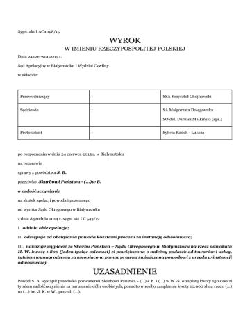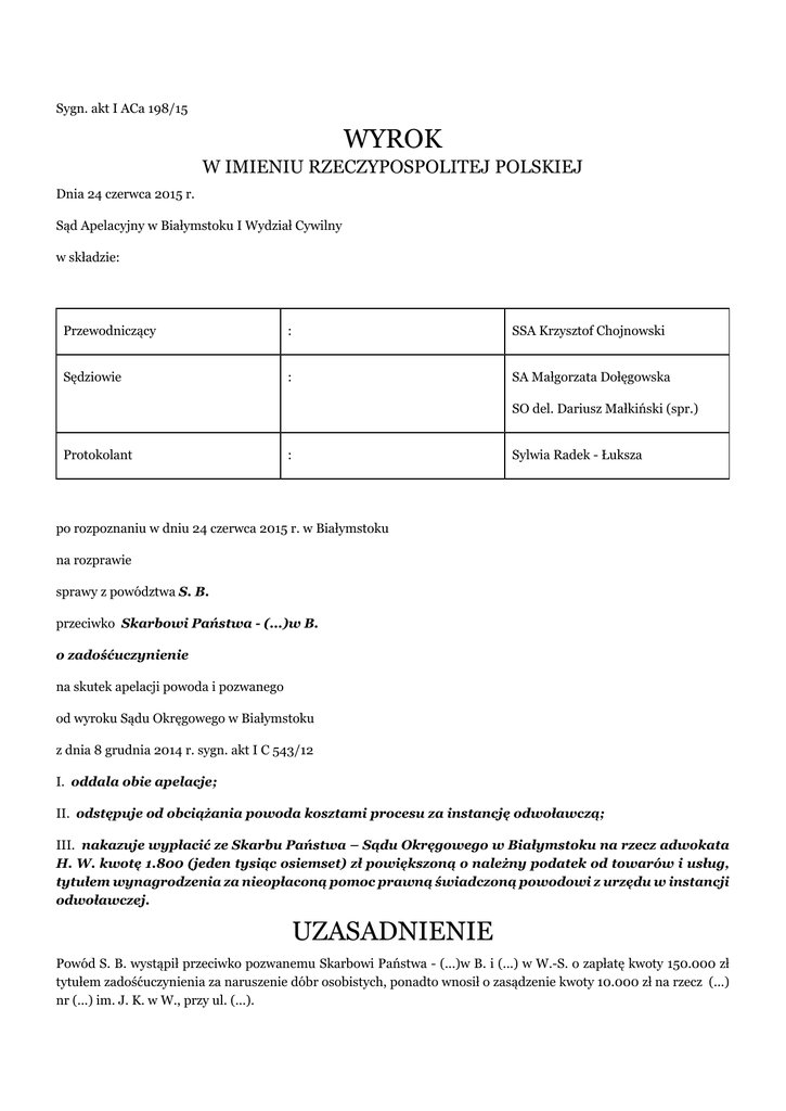 Sygn. akt I ACa 198/15 WYROK W IMIENIU RZECZYPOSPOLITEJ POLSKIEJ Dnia 24 czerwca 2015 r. Sąd Apelacyjny w Białymstoku I Wydział Cywilny w składzie: Przewodniczący : SSA Krzysztof Chojnowski Sędziowie : SA Małgorzata Dołęgowska SO del. Dariusz Małkiński (spr.) Protokolant : Sylwia Radek - Łuksza po rozpoznaniu w dniu 24 czerwca 2015 r. w Białymstoku na rozprawie sprawy z powództwa S. B. przeciwko Skarbowi Państwa - (...)w B. o zadośćuczynienie na skutek apelacji powoda i pozwanego od wyroku Sądu Okręgowego w Białymstoku z dnia 8 grudnia 2014 r. sygn. akt I C 543/12 I. oddala obie apelacje; II. odstępuje od obciążania powoda kosztami procesu za instancję odwoławczą; III. nakazuje wypłacić ze Skarbu Państwa – Sądu Okręgowego w Białymstoku na rzecz adwokata H. W. kwotę 1.800 (jeden tysiąc osiemset) zł powiększoną o należny podatek od towarów i usług, tytułem wynagrodzenia za nieopłaconą pomoc prawną świadczoną powodowi z urzędu w instancji odwoławczej. UZASADNIENIE Powód S. B. wystąpił przeciwko pozwanemu Skarbowi Państwa - (...)w B. i (...) w W.-S. o zapłatę kwoty 150.000 zł tytułem zadośćuczynienia za naruszenie dóbr osobistych, ponadto wnosił o zasądzenie kwoty 10.000 zł na rzecz (...) nr (...) im. J. K. w W., przy ul. (...). Pozwany Skarb Państwa - (...) w B. oraz (...)w W.-S. zastępowany przez Prokuratorię Generalną Skarbu Państwa wnosił o oddalenie powództwa w całości. Sąd Okręgowy w Białymstoku I Wydział Cywilny w wyroku z dnia 8 grudnia 2014 r. wydanym w sprawie o sygn. akt: I C 543/12 zasądził od pozwanego na rzecz powoda kwotę 1.000 zł wraz z odsetkami ustawowymi od dnia wydania orzeczenia do dnia zapłaty (pkt I), oddalił powództwo w pozostałym zakresie (pkt II), odstąpił w całości od obciążania powoda kosztami procesu (pkt III) i nakazał wypłacić ze Skarbu Państwa- Sądu Okręgowego w Białymstoku na rzecz pełnomocnika powoda kwotę należnego wynagrodzenia za nieopłaconą pomoc prawną świadczoną z urzędu, wraz z podatkiem VAT (pkt IV). Wyrok powyższy zapadł na gruncie następujących ustaleń faktycznych i prawnych. Powód przebywał w (...)w B. w okresie od dnia 16 grudnia 2004 r. do dnia 15 lutego 2005 r., początkowo w celi nr 102, gdzie umieszczono łącznie 14 skazanych, następnie został przeniesiony do celi nr 116, w której przebywał w dniach 17 - 22 grudnia 2004 r., i gdzie łączna liczba skazanych wahała się od 4 do 6. Następnie został przeniesiony do celi nr 303, gdzie przebywał w okresie od dnia 22 grudnia 2004 r. do dnia 13 stycznia 2005 r., wówczas liczba skazanych przebywających w celi wynosiła od 11 do 12. W dalszej kolejności powód został przeniesiony do celi nr 327, gdzie przebywał w dniach: 13 - 31 stycznia 2005 r., z dwójką współosadzonych. W okresie od dnia 31 stycznia do dnia 15 lutego 2005 r. powód przebywał w celi nr 340, gdzie razem z nim osadzonych było od 14 do 16 skazanych. Stan techniczny cel, w których przebywał powód w powyższych okresach był dobry, zaś ich wyposażenie kompletne i zgodne z przepisami Rozporządzenia Ministra Sprawiedliwości z dnia 17 października 2003 roku w sprawie warunków bytowych osób osadzonych w zakładach karnych i aresztach śledczych. Powód otrzymywał środki higieny osobistej oraz służące utrzymaniu czystości w celi, korzystał z łaźni, w której dokonywał wymiany prześcieradeł, ręczników, ścierek, poszewek, otrzymywał posiłki trzy razy dziennie o odpowiedniej wartości odżywczej, w tym co najmniej jeden posiłek gorący oraz napój do zaspakajania pragnienia. Powód miał możliwość dokonywania zakupów artykułów żywnościowych w kantynie. W pawilonie, w którym przebywał, w celach wieloosobowych kąciki sanitarne były całkowicie zabudowane, w celach małoosobowych usytuowano je w rogu pomieszczenia i wydzielono zabudową lekką, zaś wejście do nich zabezpieczone było przesłoną z tkaniny. Stan oświetlenia był odpowiedni i kompletny. S. B. w okresach: od dnia 18 kwietnia 2002 r. do dnia 13 czerwca 2002 r., od dnia 23 marca 2003 r. do dnia 16 grudnia 2004 r., od dnia 06 lipca 2009 r. do dnia 13 października 2009 r. przebywał w (...) w W.-S. początkowo w pięcioosobowej celi nr 4 o powierzchni 17,18 m2, następnie w okresie od dnia 23 kwietnia do dnia 13 czerwca 2002 r. w celi nr 24, o powierzchni 17,03 m2, po czym został zwolniony z aresztu. Z uwagi na wybrakowanie dokumentacji z okresu od dnia 10 kwietnia 2002 r. do dnia 13 czerwca 2002 r. niemożliwym było ustalenie liczby osób przebywających w celach z powodem. Po przyjęciu do (...)W.-S. powód był badany przez lekarza, zgłosił wówczas bóle żeber po stronie prawej, wskazując, że przed miesiącem doznał urazu. Powodowi zmierzono ciśnienie i tętno, dokonano pomiaru masy ciała i wzrostu, dalej zalecono leki przeciwbólowe na okres 5 dni. Ponadto powód był przyjmowany przez lekarza w dniach: 29 kwietnia, 6 maja, 13 maja, a także 6 czerwca; w powyższym okresie był konsultowany laryngologicznie w dniu 30 kwietnia 2002 r. i dermatologicznie w dniu 8 maja 2002 r., otrzymując zalecone lekarstwa. Następnie w okresie od dnia 23.03.2003 r. do dnia 16 grudnia 2004 r. powód przebywał naprzemiennie w celach 3-osobowych o powierzchni 9,76 m2, w 5-osobowych o powierzchni od 16,26 - 17,14 m2, a także w zaadaptowanych świetlicach o powierzchni od 16,77 - 18,74 m2. Z uwagi na wybrakowanie dokumentacji z okresu od dnia 23 marca 2003 r. do dnia 16 grudnia 2004 r. niemożliwym było ustalenie liczby osób przebywających w celach z powodem. We wskazanym wyżej okresie powód bezpośrednio po przyjęciu został zbadany przez lekarza, nie zgłaszał wówczas żadnych dolegliwości, zmierzono mu ciśnienie, tętno, następnie dokonano pomiaru masy ciała i wzrostu. Nie wydano wówczas zaleceń lekarskich, gdyż stan zdrowia osadzonego tego nie wymagał. W dniu 3 kwietnia 2003 r. powód podał, że cie