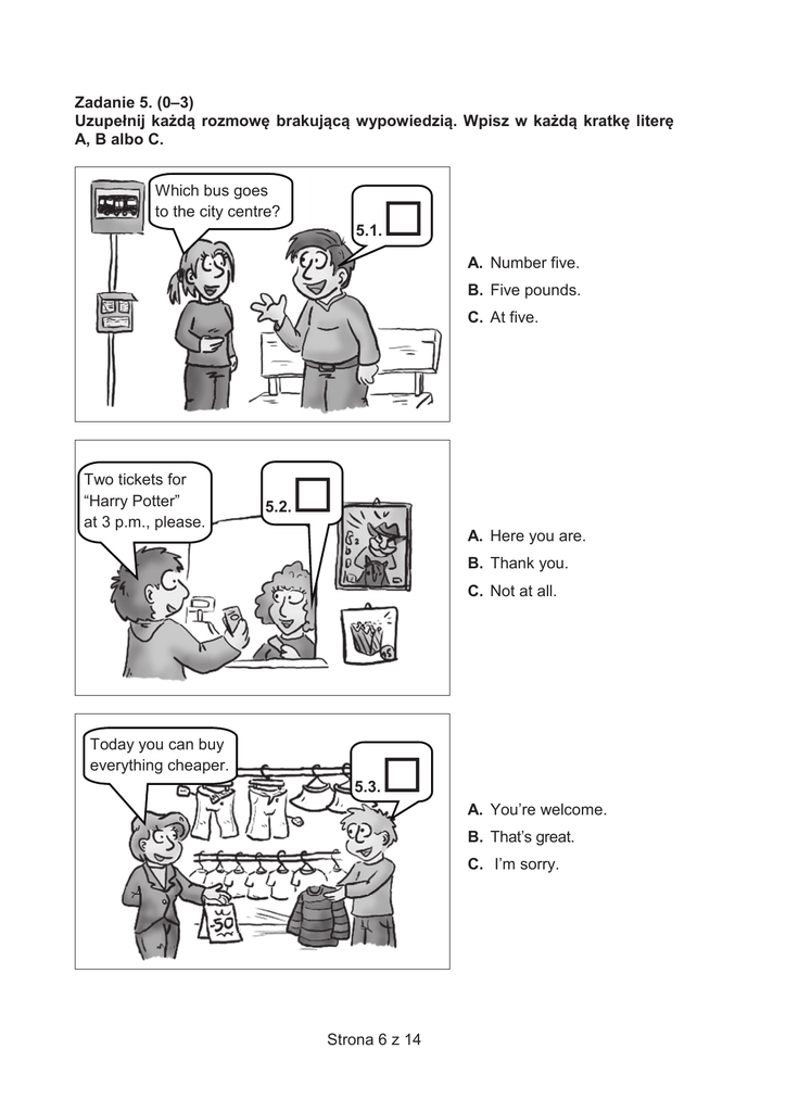 Zadanie 5. (0–3) Uzupełnij kaĪdą rozmowĊ brakującą wypowiedzią. Wpisz w kaĪdą kratkĊ literĊ A, B albo C. Which bus goes to the city centre? 5.1. A. Number five. B. Five pounds. C. At five. Two tickets for “Harry Potter” at 3 p.m., please. 5.2. A. Here you are. B. Thank you. C. Not at all. Today you can buy everything cheaper. 5.3. A. You’re welcome. B. That’s great. C. I’m sorry. Strona 6 z 14 Zadanie 6. (0–5) Dla kaĪdej z opisanych sytuacji (6.1.–6.5.) wybierz właĞciwą reakcjĊ (A–F). Wpisz odpowiednią literĊ w kratkĊ obok kaĪdego opisu sytuacji. Uwaga! Jedna reakcja nie pasuje do Īadnej sytuacji. 6.1. Kolega pyta CiĊ, kiedy idziesz do dentysty. Co mu odpowiesz? 6.2. Masz gorączkĊ. Prosisz koleĪankĊ o zakup leku. Co jej powiesz? 6.3. KoleĪanka pyta CiĊ, co robisz dziĞ po południu. Co jej odpowiesz? 6.4. Kolega pyta CiĊ, kim jest z zawodu Twoja mama. Co mu odpowiesz? 6.5. Angielski turysta pyta CiĊ, gdzie jest najbliĪsza apteka. Co mu odpowiesz? A. Get me some aspirin from the chemist’s, please. B. The aspirin is on the table in the kitchen. C. She’s a nurse. She works in a hospital. D. I’m going to the dentist’s with my mum. E. Next Thursday, in the afternoon. F. Over there, next to the hospital. Strona 7 z 14