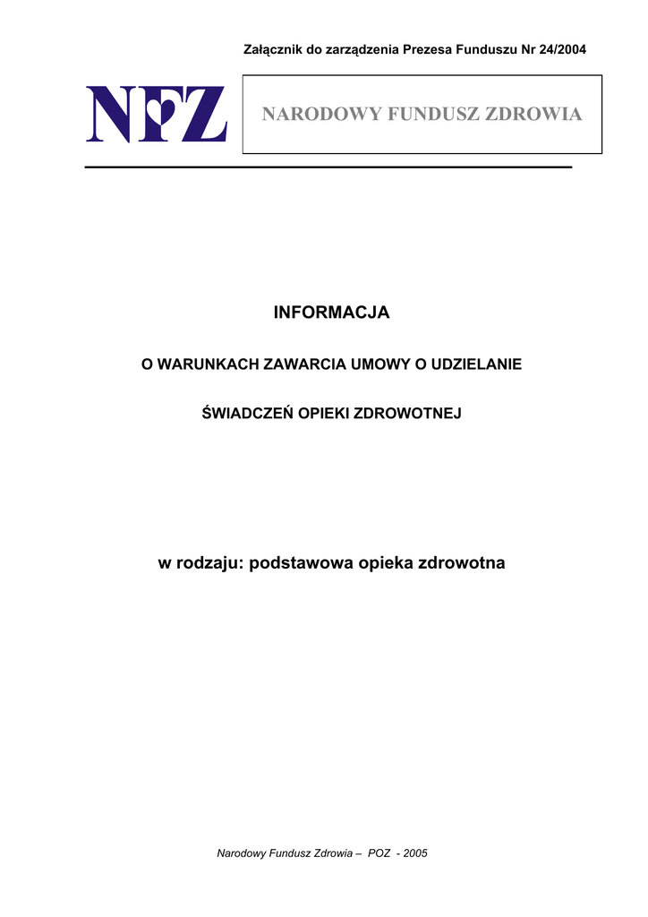 Załącznik do zarządzenia Prezesa Funduszu Nr 24/2004 NARODOWY FUNDUSZ ZDROWIA INFORMACJA O WARUNKACH ZAWARCIA UMOWY O UDZIELANIE ŚWIADCZEŃ OPIEKI ZDROWOTNEJ w rodzaju: podstawowa opieka zdrowotna Narodowy Fundusz Zdrowia – POZ - 2005 Przedmiot zamówienia został określony zgodnie z nazwą i kodem określonym we Wspólnym Słowniku Zamówień określonym Rozporządzeniem Nr 2195/2002 z dnia 5 listopada 2002 r. w sprawie wspólnego słownika zamówień publicznych Dz. Urz. WE L 340 z dnia 16 grudnia 2002 r. oraz Art. 141 ust. 4 ustawy z dnia 27 sierpnia 2004 r. o świadczeniach opieki zdrowotnej finansowanych ze środków publicznych (Dz. U. 210 poz. 2135) 85121100-4- ogólne usługi lekarskie 85141100-0 usługi świadczone przez położne 85141200-1- usługi świadczone przez pielęgniarki INFORMACJA O WARUNKACH ZAWARCIA UMOWY O UDZIELANIE ŚWIADCZEŃ OPIEKI ZDROWOTNEJ W RODZAJU: PODSTAWOWA OPIEKA ZDROWOTNA Rozdział I Postanowienia wspólne § 1. Niniejsza informacja o warunkach zawarcia umowy o udzielanie świadczeń opieki zdrowotnej, zwana dalej „Informacją”, określa, zgodnie z ustawą z dnia 27 sierpnia 2004 r. o świadczeniach opieki zdrowotnej finansowanych ze środków publicznych (Dz. U. Nr 210, poz. 2135), zwaną dalej „ustawą”, warunki, jakie powinny być spełnione przez podmioty zainteresowane zawieraniem umów o udzielanie świadczeń opieki zdrowotnej w rodzaju: podstawowa opieka zdrowotna (POZ). § 2. Ilekroć w Informacji jest mowa o: 1. „deklaracji” – rozumie się przez to deklarację wyboru przez świadczeniobiorcę osoby udzielającej świadczeń, zgodną ze wzorem ustalonym przez Fundusz; 2. „lekarzu POZ” - rozumie się przez to lekarza podstawowej opieki zdrowotnej, o którym mowa w art. 5 pkt 13 ustawy; 3. „listach świadczeniobiorców” - rozumie się przez to listy osób, które złożyły pisemną deklarację wyboru lekarza POZ, pielęgniarki lub położnej POZ stanowiące podstawę wypłaty przez Oddział Funduszu wynagrodzenia z tytułu umowy wg kapitacyjnej stawki rocznej; 4. „listach uczniów” - rozumie się przez to listy uczniów objętych opieką przez pielęgniarkę szkolną, stanowiące podstawę wypłaty przez Oddział Funduszu wynagrodzenia z tytułu umowy wg kapitacyjnej stawki rocznej; 5. „oferencie” - rozumie się przez świadczeniodawcę ubiegającego się o zawarcie umowy o udzielanie świadczeń opieki zdrowotnej w rodzaju: podstawowa opieka 2 zdrowotna; 6. „opiece pediatrycznej” – rozumie się przez to świadczenia lekarza POZ udzielane osobom do 18 roku życia; 7. „osobie udzielającej świadczeń” – rozumie się przez to lekarza POZ, pielęgniarkę lub położną POZ; 8. „pielęgniarce lub położnej POZ” - rozumie się przez to pielęgniarkę podstawowej opieki zdrowotnej, o której mowa art. 5 pkt 25 ustawy, lub położną podstawowej opieki zdrowotnej, o której mowa w art. 5 pkt 28 ustawy; 9. „pielęgniarce szkolnej” – rozumie się przez to wyłącznie pielęgniarkę POZ środowiska nauczania i wychowania lub higienistkę szkolną; 10. „POZ” – rozumie się przez to podstawową opiekę zdrowotną. § 3. 1. Przedmiotem umowy o udzielanie świadczeń opieki zdrowotnej w rodzaju: podstawowa opieka zdrowotna, zwanej dalej „umową” jest udzielanie świadczeń w rodzaju podstawowa opieka zdrowotna, która jest częścią systemu ochrony zdrowia, zapewniającą zdrowym i chorym świadczenia w miejscu zamieszkania oraz środowisku nauczania i wychowania, w warunkach ambulatoryjnych, bądź w uzasadnionych przypadkach, domowych. 2. W ramach świadczeń w rodzaju: podstawowa opieka zdrowotna wyodrębnia się następujące zakresy świadczeń: 1) świadczenia lekarza POZ; 2) świadczenia pielęgniarki POZ; 3) świadczenia położnej POZ; 4) świadczenia pielęgniarki szkolnej; 5) nocna i świąteczna ambulatoryjna opieka lekarska i pielęgniarska; 6) nocna i świąteczna wyjazdowa opieka lekarska i pielęgniarska; 7) transportu sanitarny w POZ. 3. Świadczenia POZ ukierunkowane są na promocję i profilaktykę zdrowotną, diagnostykę schorzeń, leczenie, zapobieganie lub ograniczanie niepełnosprawności, usprawnianie oraz pielęgnację i edukację zdrowotną. 4. Świadczenia w POZ są realizowane przez: 3 1) lekarza POZ; 2) pielęgniarkę POZ; 3) położną POZ - zgodnie z zakresami zadań. 5. Do świadczeń w POZ należą działania związane w szczególności z: 1) badaniem i poradą lekarską; 2) diagnostyką i leczeniem; 3) kierowaniem na leczenie specjalistyczne, szpitalne, uzdrowiskowe i do opieki długoterminowej; 4) opieką nad zdrowotną nad dzieckiem i młodzieżą; 5) orzekaniem i opiniowaniem o stanie zdrowia; 6) szczepieniami ochronnymi określonymi w kalendarzu szczepień; 7) opieką nad niepełnosprawnymi; 8) promocją zdrowia i profilaktyką chorób; 9) zadaniami pielęgniarki rodzinnej; 10) zadaniami położnej rodzinnej; 11) zadaniami pielęgniarki szkolnej. § 4. 1. Świadczenia POZ udzielane są świadczeniobiorcom, którzy dokonali wyboru lekarza POZ, pielęgniarki i położnej POZ poprzez złożenie deklaracji wyboru. 2. W przypadku niepublicznych samodzielnych zakładów publicznych opieki zdrowotnej zakładów oraz opieki praktyk zdrowotnej, grupowych listę świadczeniobiorców sporządza się odrębnie dla każdego lekarza POZ, pielęgniarki lub położnej POZ realizujących świadczenia u oferenta. Zachowują ważność deklaracje wyboru złożone przed 1 października 2004 r w tym wspólne deklaracje dla lekarza, pielegniarki i położnej poz. § 5. 1. Metoda finansowania świadczeń POZ oparta jest o roczną stawkę kapitacyjną na jednego świadczeniobiorcę. 2. W strukturze rocznej stawki kapitacyjnej znajdują się środki finansowe przeznaczone na: 1) świadczenia lekarskie; 2) świadczenia pielęgniarki /rodzinnej; 3) świadczenia położnej /rodzinnej; 4 4) świadczenia pielęgniarki szkolnej. 3. W strukturze rocznej stawki kapitacyjnej obowi