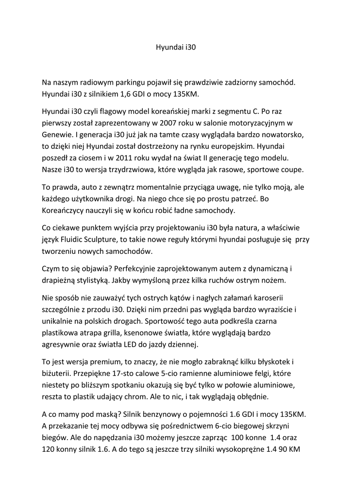 Hyundai i30 Na naszym radiowym parkingu pojawił się prawdziwie zadziorny samochód. Hyundai i30 z silnikiem 1,6 GDI o mocy 135KM. Hyundai i30 czyli flagowy model koreańskiej marki z segmentu C. Po raz pierwszy został zaprezentowany w 2007 roku w salonie motoryzacyjnym w Genewie. I generacja i30 już jak na tamte czasy wyglądała bardzo nowatorsko, to dzięki niej Hyundai został dostrzeżony na rynku europejskim. Hyundai poszedł za ciosem i w 2011 roku wydał na świat II generację tego modelu. Nasze i30 to wersja trzydrzwiowa, które wygląda jak rasowe, sportowe coupe. To prawda, auto z zewnątrz momentalnie przyciąga uwagę, nie tylko moją, ale każdego użytkownika drogi. Na niego chce się po prostu patrzeć. Bo Koreańczycy nauczyli się w końcu robić ładne samochody. Co ciekawe punktem wyjścia przy projektowaniu i30 była natura, a właściwie język Fluidic Sculpture, to takie nowe reguły którymi hyundai posługuje się przy tworzeniu nowych samochodów. Czym to się objawia? Perfekcyjnie zaprojektowanym autem z dynamiczną i drapieżną stylistyką. Jakby wymyśloną przez kilka ruchów ostrym nożem. Nie sposób nie zauważyć tych ostrych kątów i nagłych załamań karoserii szczególnie z przodu i30. Dzięki nim przedni pas wygląda bardzo wyraziście i unikalnie na polskich drogach. Sportowość tego auta podkreśla czarna plastikowa atrapa grilla, ksenonowe światła, które wyglądają bardzo agresywnie oraz światła LED do jazdy dziennej. To jest wersja premium, to znaczy, że nie mogło zabraknąć kilku błyskotek i biżuterii. Przepiękne 17-sto calowe 5-cio ramienne aluminiowe felgi, które niestety po bliższym spotkaniu okazują się być tylko w połowie aluminiowe, reszta to plastik udający chrom. Ale to nic, i tak wyglądają obłędnie. A co mamy pod maską? Silnik benzynowy o pojemności 1.6 GDI i mocy 135KM. A przekazanie tej mocy odbywa się pośrednictwem 6-cio biegowej skrzyni biegów. Ale do napędzania i30 możemy jeszcze zaprząc 100 konne 1.4 oraz 120 konny silnik 1.6. A do tego są jeszcze trzy silniki wysokoprężne 1.4 90 KM oraz 110 i 128KM koni o pojemności 1.6. Czyli w naszej testowanej wersji mamy najmocniejszą wersję. Gdzieś już to chyba widziałem. Noo już wiem hyundai i30 w wersji coupe przypomina auta z włoskiej stacji alfa romeo. Ciągnące się po bokach zmiękczone zaokrąglenia dodają mu muskulatury i wydaje się, że zaraz wyrwie do przodu. A zwieńczeniem sportowej sylwetki coupe jest tylny spoiler dachowy oraz LED-owe światła tylne, które w nocy rozświetlają się w kształcie pięknej obwódki. A pod tylną klapą mamy bagażnik który ma 378 litrów. Co daje mu środkowe miejsce wśród rywali z tego samego segmentu. Gdy zachodzi potrzeba przewiezienia większych ładunków, można powiększyć przestrzeń załadunkową do 1316 litrów. Jakość wykończenia bagażnika stoi na przyzwoitym poziomie, no i znajdziemy tutaj kilka dodatków lampkę, haczyki pozwalające na zawieszenie mniejszych reklamówek oraz gniazdo 12V. Czy wnętrzem tego samochodu będziemy równie zauroczeni w jak jego zewnętrzem? Po zamknięciu drzwi i30 wita nas sympatycznym dźwiękiem, coś na wzór kościelnych dzwonów. Szkoda tylko, że nie mamy jeszcze napisu dzień dobry wyświetlanego na ekranie komputera pokładowego, wtedy to byłby hit. Gdy wsiadamy do i30 ogromne wrażenie robi przestronność tego wnętrza. Niby jest to kompakt, ale miejsca jest aż nadto. Pierwsze wrażanie jest fenomenalne, myślę, że takiego wnętrza nie powstydziłoby się auto wyżej klasy. Chyba zaczynam być równie zauroczony wnętrzem, co zewnętrzem. Bo materiały wykończeniowe są przyzwoitej jakości. Miękkie tworzywa w górnej części kabiny, niestety w dolnych partiach króluje twardy plastik. Ale wszystko jest dobrze spasowane, nic nie trzeszczy. Szacun. Fotele, to jest poezja, gdy w nie siadamy czujemy, że nas otulają, można się po prostu rozpłynąć. W dodatku regulowane są w kilku płaszczyznach, więc niezależnie od gabarytów, każdy znajdzie tutaj dobrą pozycję. Zegary pokładowe to też jest coś. Mnie osobiście bardzo się podobają. W głębokich tubach znajdują się dwa analogowe zegary, prędkościomierz i obrotomierz, które są czytelne, duże. I mamy tutaj taki mały sportowy akcencik, czyli niebieskie elementy podświetlenia w zegarach. Ale hyundai lubuje się w tego rodzaju podświetleniu, bo wszystkie gałki, wszystkie guziki i schowki są podświetlone na kolor niebieski. Który nie do końca każdemu może się spodobać. A dobrze, że powiedziałeś o schowkach bo mamy ich tutaj trochę. Oczywiście nie mogło ich zabraknąć w boczkach drzwi, w podłotkietniku, który jest tak głęboki, że można tu wsadzić rękę, aż do łokcia. Znajdziemy tu też schowek w nogach pasażera, który jest średniej wielkości, ale za to jest klimatyzowany. I kilka małych pod konsolą centralną. Na duże brawa zasługuje konsola centralna jest tu panel do obsługi klimatyzacji oraz 7-calowy ekran dotykowy do obsługi radia, nawigacji i telefonu. Wszystko wygląda elegancko, nie jest przeładowane przyciskami i jest bardzo proste w obsłudze. Ale pod ekranem dotykowym znajdziemy coś co ma podkreślić to, że jest to prawdziwie męski i sportowy samochód. Dwa gniazdka 12V, dzięki robiąc ten test możemy jednocześnie golić i np. odkurzać samochód. No to sprawdźmy ile miejsca jest z tyłu. Pamiętajmy, że jest to trzydrzwiowe auto, więc nie powinniśmy za dużo wymagać. Odsuwamy przedni fotel i mamy zadowalająca ilość miejsca. Kanapa jest trzyosobowa, ale dwójka będzie tutaj podróżować w miarę komfortowych warunkach. No nie. Właśnie odkryliśmy poważną wadę tego samochodu. Przednie fotele nie mają pamięci położenia. A to oznacza, że za każdym razem, gdy będziemy kogoś wypuszczać na nowo musimy ustawiać sobie fotel. W tej klasie samochodu to jest absurd. i30 wygląda jak rasowe spor