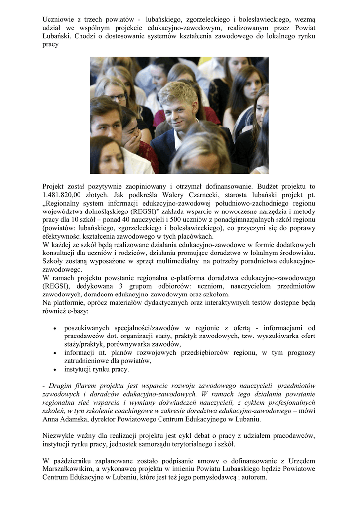Uczniowie z trzech powiatów - lubańskiego, zgorzeleckiego i bolesławieckiego, wezmą udział we wspólnym projekcie edukacyjno-zawodowym, realizowanym przez Powiat Lubański. Chodzi o dostosowanie systemów kształcenia zawodowego do lokalnego rynku pracy Projekt został pozytywnie zaopiniowany i otrzymał dofinansowanie. Budżet projektu to 1.481.820,00 złotych. Jak podkreśla Walery Czarnecki, starosta lubański projekt pt. „Regionalny system informacji edukacyjno-zawodowej południowo-zachodniego regionu województwa dolnośląskiego (REGSI)” zakłada wsparcie w nowoczesne narzędzia i metody pracy dla 10 szkół – ponad 40 nauczycieli i 500 uczniów z ponadgimnazjalnych szkół regionu (powiatów: lubańskiego, zgorzeleckiego i bolesławieckiego), co przyczyni się do poprawy efektywności kształcenia zawodowego w tych placówkach. W każdej ze szkół będą realizowane działania edukacyjno-zawodowe w formie dodatkowych konsultacji dla uczniów i rodziców, działania promujące doradztwo w lokalnym środowisku. Szkoły zostaną wyposażone w sprzęt multimedialny na potrzeby poradnictwa edukacyjnozawodowego. W ramach projektu powstanie regionalna e-platforma doradztwa edukacyjno-zawodowego (REGSI), dedykowana 3 grupom odbiorców: uczniom, nauczycielom przedmiotów zawodowych, doradcom edukacyjno-zawodowym oraz szkołom. Na platformie, oprócz materiałów dydaktycznych oraz interaktywnych testów dostępne będą również e-bazy: poszukiwanych specjalności/zawodów w regionie z ofertą - informacjami od pracodawców dot. organizacji staży, praktyk zawodowych, tzw. wyszukiwarka ofert staży/praktyk, porównywarka zawodów, informacji nt. planów rozwojowych przedsiębiorców regionu, w tym prognozy zatrudnieniowe dla powiatów, instytucji rynku pracy. - Drugim filarem projektu jest wsparcie rozwoju zawodowego nauczycieli przedmiotów zawodowych i doradców edukacyjno-zawodowych. W ramach tego działania powstanie regionalna sieć wsparcia i wymiany doświadczeń nauczycieli, z cyklem profesjonalnych szkoleń, w tym szkolenie coachingowe w zakresie doradztwa edukacyjno-zawodowego – mówi Anna Adamska, dyrektor Powiatowego Centrum Edukacyjnego w Lubaniu. Niezwykle ważny dla realizacji projektu jest cykl debat o pracy z udziałem pracodawców, instytucji rynku pracy, jednostek samorządu terytorialnego i szkół. W październiku zaplanowane zostało podpisanie umowy o dofinansowanie z Urzędem Marszałkowskim, a wykonawcą projektu w imieniu Powiatu Lubańskiego będzie Powiatowe Centrum Edukacyjne w Lubaniu, które jest też jego pomysłodawcą i autorem.