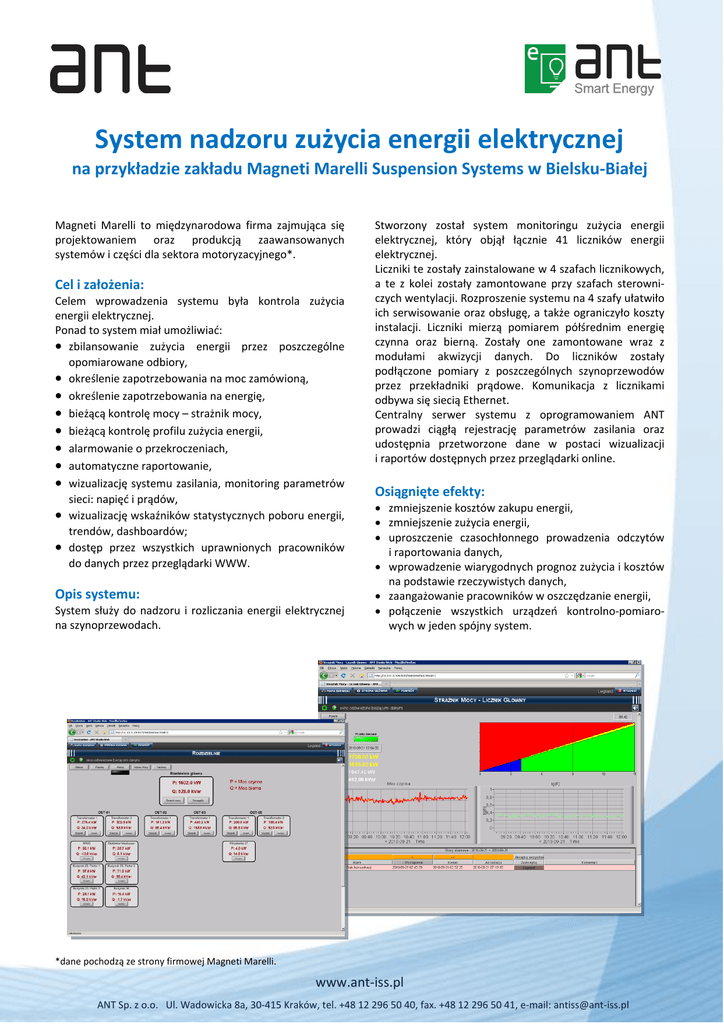 case study System nadzoru zużycia energii elektrycznej na przykładzie zakładu Magneti Marelli Suspension Systems w Bielsku-Białej Magneti Marelli to międzynarodowa firma zajmująca się projektowaniem oraz produkcją zaawansowanych systemów i części dla sektora motoryzacyjnego*. Cel i założenia: Celem wprowadzenia systemu była kontrola zużycia energii elektrycznej. Ponad to system miał umożliwiać: · zbilansowanie zużycia energii przez poszczególne opomiarowane odbiory, · określenie zapotrzebowania na moc zamówioną, · określenie zapotrzebowania na energię, · bieżącą kontrolę mocy – strażnik mocy, · bieżącą kontrolę profilu zużycia energii, · alarmowanie o przekroczeniach, · automatyczne raportowanie, · wizualizację systemu zasilania, monitoring parametrów sieci: napięć i prądów, · wizualizację wskaźników statystycznych poboru energii, trendów, dashboardów; · dostęp przez wszystkich uprawnionych pracowników do danych przez przeglądarki WWW. Opis systemu: System służy do nadzoru i rozliczania energii elektrycznej na szynoprzewodach. Stworzony został system monitoringu zużycia energii elektrycznej, który objął łącznie 41 liczników energii elektrycznej. Liczniki te zostały zainstalowane w 4 szafach licznikowych, a te z kolei zostały zamontowane przy szafach sterowniczych wentylacji. Rozproszenie systemu na 4 szafy ułatwiło ich serwisowanie oraz obsługę, a także ograniczyło koszty instalacji. Liczniki mierzą pomiarem półśrednim energię czynna oraz bierną. Zostały one zamontowane wraz z modułami akwizycji danych. Do liczników zostały podłączone pomiary z poszczególnych szynoprzewodów przez przekładniki prądowe. Komunikacja z licznikami odbywa się siecią Ethernet. Centralny serwer systemu z oprogramowaniem ANT prowadzi ciągłą rejestrację parametrów zasilania oraz udostępnia przetworzone dane w postaci wizualizacji i raportów dostępnych przez przeglądarki online. Osiągnięte efekty: · zmniejszenie kosztów zakupu energii, · zmniejszenie zużycia energii, · uproszczenie czasochłonnego prowadzenia odczytów i raportowania danych, · wprowadzenie wiarygodnych prognoz zużycia i kosztów na podstawie rzeczywistych danych, · zaangażowanie pracowników w oszczędzanie energii, · połączenie wszystkich urządzeń kontrolno-pomiarowych w jeden spójny system. *dane pochodzą ze strony firmowej Magneti Marelli. www.ant-iss.pl ANT Sp. z o.o. Ul. Wadowicka 8a, 30-415 Kraków, tel. +48 12 296 50 40, fax. +48 12 296 50 41, e-mail: [email protected]