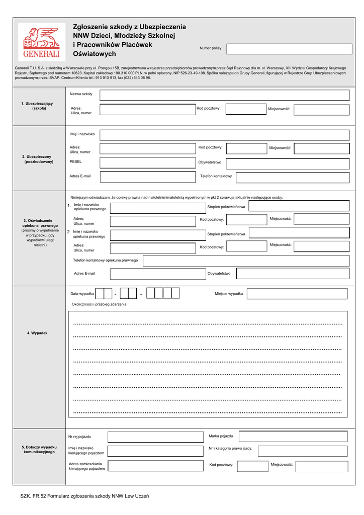 Zgłoszenie szkody z Ubezpieczenia NNW Dzieci, Młodzieży Szkolnej i Pracowników Placówek Oświatowych Numer polisy Generali T.U. S.A. z siedzibą w Warszawie przy ul. Postępu 15B, zarejestrowana w rejestrze przedsiębiorców prowadzonym przez Sąd Rejonowy dla m. st. Warszawy, XIII Wydział Gospodarczy Krajowego Rejestru Sądowego pod numerem 10623. Kapitał zakładowy 190.310.000 PLN, w pełni opłacony, NIP 526-23-49-108. Spółka należąca do Grupy Generali, figurującej w Rejestrze Grup Ubezpieczeniowych prowadzonym przez ISVAP. Centrum Klienta tel.: 913 913 913, fax (022) 543 08 98. Nazwa szkoły 1. Ubezpieczający (szkoła) Adres: Ulica, numer Kod pocztowy: Miejscowość: Uli Uli Imię i nazwisko Adres: Ulica, numer 2. Ubezpieczony (poszkodowany) PESEL Adres E-mail Kod pocztowy: Miejscowość: Uli Obywatelstwo Uli Telefon kontaktowy Niniejszym oświadczam, że opiekę prawną nad małoletnim/małoletnią wypełnionym w pkt 2 sprawują aktualnie następujące osoby: 1. Imię i nazwisko Stopień pokrewieństwa opiekuna prawnego 3. Oświadczenie opiekuna prawnego (prosimy o wypełnienie w przypadku, gdy wypadkowi uległ nieletni) Adres: Ulica, numer 2. Imię i nazwisko Kod pocztowy: Miejscowość: Uli Uli Stopień pokrewieństwa opiekuna prawnego Adres: Ulica, numer Kod pocztowy: Adres E-mail Data wypadku Uli Uli Telefon kontaktowy opiekuna prawnego Miejscowość: Obywatelstwo - - Miejsce wypadku Okoliczności i przebieg zdarzenia : ………………………………………………………………………………………………………………………………… 4. Wypadek .……………………………………………………………………………………………………………………………….. .………………………..……………………………………………………………………………………………………… ………………………….…………………………………………………………………………………………………….. ……………………………..………………………………………………………………………………………………… ……………………………….……………………………………………………………………………………………….. .…………………………………..…………………………………………………………………………………………… …………………………………….………………………………………………………………………………………….. 5. Dotyczy wypadku komunikacyjnego Nr rej pojazdu Marka pojazdu Imię i nazwisko kierującego pojazdem Nr i kategoria prawa jazdy: Adres zamieszkania kierującego pojazdem Kod pocztowy: Miejscowość: Uli Uli SZK. FR.52 Formularz zgłoszenia szkody NNW Lew Uczeń Oświadczam, że w chwili wypadku Ubezpieczony był trzeźwy i nie był pod wpływem narkotyków lub innych tego typu środków. 6. Stan trzeźwości w chwili wypadku ……………………………………… ……………………………………… (imię i nazwisko składającego oświadczenie) (seria i numer dowodu osobistego) ……………………………………… (podpis Ubezpieczonego lub opiekuna prawnego - w przypadku, gdy Ubezpieczony jest nieletni) Ważne: Przed zaznaczeniem upewnij się czy umowa, z której chcesz zgłosić roszczenie znajduje się w zakresie Twojego ubezpieczenia. Rany cięte i szarpane Trwałe inwalidztwo Całkowite 7. Zgłoszenie dotyczy odszkodowania z tytułu: (proszę o zaznaczenie jednej lub kilku pozycji Niezdolność Ubezpieczonego do pracy i nauki Dzienne świadczenie z tytułu rekonwalescencji Śmierć Ubezpieczonego Zakup lub wyposażenie wózka inwalidzkiego Złamania Śmierć przedstawiciela ustawowego Poparzenia Zdiagnozowanie nowotworu złośliwego Odmrożenia Zwrot kosztów nabycia protez, środków pomocniczych Dzienne świadczenie szpitalne NNW Zwrot kosztów leczenia Ubezpieczonego Dzienne świadczenie szpitalne – zatrucie pokarmowe Zwrot kosztów pogrzebu na wypadek śmierci Ubezpieczonego Urazy narządów ruchu (stłuczenia, skręcenia, zwichnięcia) Inne ……………………………………………………………… Wstrząśnienie mózgu 1. 2. 3. 4. 5. 6. 7. 8. 9. 10. 11. 12. 13. 14. 15. 16. 17. 18. 8. Wykaz dokumentów niezbędnych przy zgłoszeniu roszczenia 19. Kserokopia dowodu osobistego Ubezpieczonego lub Opiekuna Prawnego, jeżeli Ubezpieczony jest niepełnoletni Kserokopia Odpisu Skróconego Aktu Urodzenia Ubezpieczonego lub postanowienie Sądu o ustanowieniu opieki jeżeli Ubezpieczony jest niepełnoletni Kserokopia dowodu osobistego osoby ponoszące koszt pogrzebu Ubezpieczonego Kserokopia dowodu osobistego Uposażonego/Uposażonych Kserokopia Odpisu Skróconego Aktu Zgonu Ubezpieczonego Kserokopia Odpisu Skróconego Aktu Zgonu Rodzica/Opiekuna Prawnego Kserokopia Statystycznej Karty Zgonu lub innego dokumentu medycznego określającego przyczynę śmierci Kserokopia dokumentacji medycznej potwierdzającej udzielenie pierwszej pomocy medycznej bezpośrednio po wypadku/urazie (karta informacyjna ze Szpitalnego Oddziału Ratunkowego, Izby Przyjęć, Pogotowia Ratunkowego lub inny dokument medyczny) Kserokopia dokumentacji medycznej obrazującej przebieg leczenia następstw nieszczęśliwego wypadku/choroby w postaci: kart informacyjnych leczenia szpitalnego, historii choroby z leczenia ambulatoryjnego i rehabilitacyjnego, odpisów wyników badań wraz z zaświadczeniem o zakończeniu leczenia Kserokopia dokumentacji medycznej z opisem przyczyny zatrucia Kserokopia karty informacyjnej leczenia szpitalnego Kserokopia dokumentacji potwierdzającej posiadanie uprawnień do prowadzenia pojazdu (karta rowerowa, motorowerowa lub prawo jazdy), jeżeli Ubezpieczony prowadził pojazd w chwili wypadku Kserokopia protokołu powypadkowego (z komis