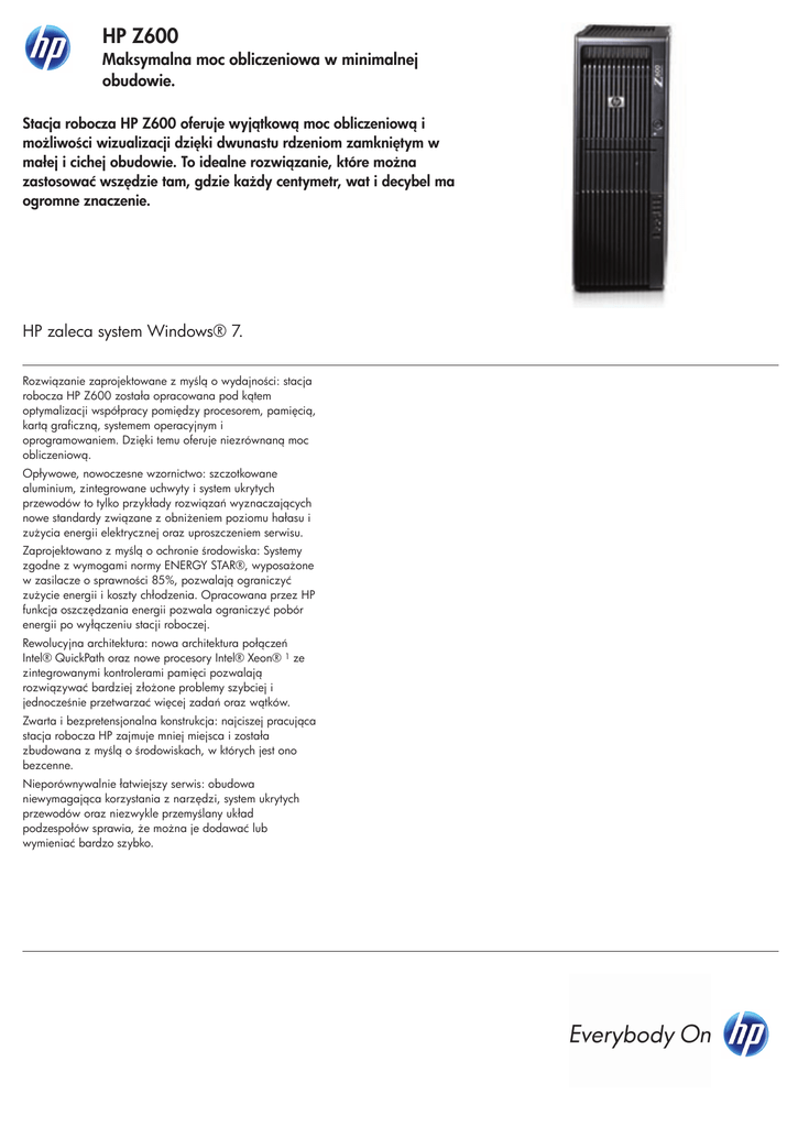 HP Z600 Maksymalna moc obliczeniowa w minimalnej obudowie. Stacja robocza HP Z600 oferuje wyjątkową moc obliczeniową i możliwości wizualizacji dzięki dwunastu rdzeniom zamkniętym w małej i cichej obudowie. To idealne rozwiązanie, które można zastosować wszędzie tam, gdzie każdy centymetr, wat i decybel ma ogromne znaczenie. HP zaleca system Windows® 7. Rozwiązanie zaprojektowane z myślą o wydajności: stacja robocza HP Z600 została opracowana pod kątem optymalizacji współpracy pomiędzy procesorem, pamięcią, kartą graficzną, systemem operacyjnym i oprogramowaniem. Dzięki temu oferuje niezrównaną moc obliczeniową. Opływowe, nowoczesne wzornictwo: szczotkowane aluminium, zintegrowane uchwyty i system ukrytych przewodów to tylko przykłady rozwiązań wyznaczających nowe standardy związane z obniżeniem poziomu hałasu i zużycia energii elektrycznej oraz uproszczeniem serwisu. Zaprojektowano z myślą o ochronie środowiska: Systemy zgodne z wymogami normy ENERGY STAR®, wyposażone w zasilacze o sprawności 85%, pozwalają ograniczyć zużycie energii i koszty chłodzenia. Opracowana przez HP funkcja oszczędzania energii pozwala ograniczyć pobór energii po wyłączeniu stacji roboczej. Rewolucyjna architektura: nowa architektura połączeń Intel® QuickPath oraz nowe procesory Intel® Xeon® 1 ze zintegrowanymi kontrolerami pamięci pozwalają rozwiązywać bardziej złożone problemy szybciej i jednocześnie przetwarzać więcej zadań oraz wątków. Zwarta i bezpretensjonalna konstrukcja: najciszej pracująca stacja robocza HP zajmuje mniej miejsca i została zbudowana z myślą o środowiskach, w których jest ono bezcenne. Nieporównywalnie łatwiejszy serwis: obudowa niewymagająca korzystania z narzędzi, system ukrytych przewodów oraz niezwykle przemyślany układ podzespołów sprawia, że można je dodawać lub wymieniać bardzo szybko. HP Z600 HP zaleca system Windows® 7. DANE TECHNICZNE Obudowa Miniwieża z możliwością zamontowania w stelażu System operacyjny Oryginalny Windows® 7 Professional 32 Oryginalny Windows® 7 Professional 64 Oryginalny Windows® 7 Ultimate 64 System operacyjny Red Hat Enterprise Linux WS 5 (jedynie uzupełnianie zestawu na żądanie) Zestaw instalacyjny systemu Linux (HP Installer Kit for Linux) Zestaw instalacyjny HP do systemu Linux zawiera sterowniki do 32- i 64-bitowej wersji Red Hat Enterprise Linux WS4 i WS5. Red Hat Enterprise Linux WS5: Oprogramowanie nie jest pobierane na dysk twardy. Adres URL i numer licencji na oprogramowanie do pobrania najnowszej wersji — w zestawie. Procesor Sześciordzeniowy procesor Intel® Xeon® X5675 (3,06 GHz, 12 MB pamięci podręcznej, pamięć 1333 MHz); Sześciordzeniowy procesor Intel® Xeon® X5670 (2,93 GHz, 12 MB pamięci podręcznej, pamięć 1333 MHz); Sześciordzeniowy procesor Intel® Xeon® X5660 (2,80 GHz, 12 MB pamięci podręcznej, pamięć 1333 MHz); Procesor Intel® Xeon® X5672 (3,20 GHz, 12 MB pamięci podręcznej, pamięć 1333 MHz); Sześciordzeniowy procesor Intel® Xeon® X5650 (2,66 GHz, 12 MB pamięci podręcznej, pamięć 1333 MHz); Sześciordzeniowy procesor Intel® Xeon® E5649 (2,53 GHz, 12 MB pamięci podręcznej, pamięć 1333 MHz); Sześciordzeniowy procesor Intel® Xeon® E5645 (2,40 GHz, 12 MB pamięci podręcznej, pamięć 1333 MHz); Procesor Intel® Xeon® X5667 (3,06 GHz, 12 MB pamięci podręcznej, pamięć 1333 MHz); Procesor Intel® Xeon® E5647 (2,93 GHz, 12 MB pamięci podręcznej, pamięć 1066 MHz); Procesor Intel® Xeon® E5640 (2,66 GHz, 12 MB pamięci podręcznej, pamięć 1066 MHz); Procesor Intel® Xeon® E5630 (2,53 GHz, 12 MB pamięci podręcznej, pamięć 1066 MHz); Procesor Intel® Xeon® E5620 (2,40 GHz, 12 MB pamięci podręcznej, pamięć 1066 MHz); Procesor Intel® Xeon® E5607 (2,26 GHz, 8 MB pamięci podręcznej, pamięć 1066 MHz); Procesor Intel® Xeon® E5606 (2,13 GHz, 8 MB pamięci podręcznej, pamięć 1066 MHz); Procesor Intel® Xeon® E5507 (2,26 GHz, 4 MB pamięci podręcznej, pamięć 800 MHz); Procesor Intel® Xeon® E5506 (2,13 GHz, 4 MB pamięci podręcznej, pamięć 800 MHz) Zestaw układów Intel® 5520 Pamięć Niezbuforowane moduły pamięci DDR3 1333 MHz ECC DIMM Wewnętrzna pamięć masowa SATA (7200 obr./min) 160 GB maksymalnie 2 TB SATA (10000 obr./min) 160 GB maksymalnie 300 GB SAS (15000 obr./min) 300 GB maksymalnie 600 GB Napęd Solid State SATA maksymalnie Zintegrowany kontroler SATA 3.0 Gb/s z funkcjami RAID 0, 1, 10, 5. Karta RAID SAS z 4 portami LSI 3041E (opcj.); Karta RAID SAS z 8 portami LSI 8888ELP (opcj.); Karta RAID SAS 6Gb/s z 4 portami LSI 9212 (opcj.); Karta ROC RAID SAS 6 Gb/s LSI MegaRAID 9260-8i Nośniki wyjmowalne Napęd DVD-ROM SATA HP, napęd DVD+/-RW SATA HP, napęd DVD+/-RW SATA HP montowany w gnieździe, nagrywarka Blu-Ray SATA HP Grafika Specjalistyczna karta 2D, Karta graficzna NVIDIA Quadro NVS 295 (256 MB); Karta graficzna NVIDIA Quadro NVS 450 (512 MB); Karta graficzna NVIDIA NVS 300 (512 MB); Karta graficzna AMD FirePro 2270 (512 MB) Podstawowa karta 3D, Karta graficzna NVIDIA Quadro FX380 (256 MB); Karta graficzna NVIDIA Quadro FX580 (512 MB); Karta graficzna NVIDIA Quadro 600 (1 GB); Karta graficzna ATI FirePro V3800 (512 MB); Karta graficzna ATI FirePro V4800 (1 GB); Karta graficzna NVIDIA Quadro 400 (512 MB) Karta 3D klasy średniej, Karta graficzna NVIDIA Quadro FX1800 (768 MB); Karta graficzna NVIDIA Quadro 2000 (1 GB); Karta graficzna ATI FirePro V5800 (1 GB) Karta 3D klasy wyższej, Karta graficzna NVIDIA Quadro FX3800 (1 GB); Karta graficzna NVIDIA Quadro 4000 (2 GB); Karta graficzna NVIDIA Quadro FX4800 (1,5 GB); Karta graficzna NVIDIA Quadro 5000 (2,5 GB) Karta dźwiękowa Zintegrowana karta dźwiękowa High Definition Realtek ALC262, opcjonalna karta dźwiękowa Creative X-Fi Titanium PCIe, opcjonalne, wąskie głośniki HP, podłączane przez port USB Komunikacja Zintegrowana karta LAN Broadcom 5764 10/100/1000 PCIe, opcjonalna karta sieciowa Br