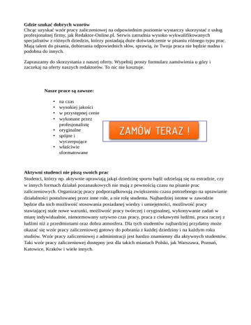 Gdzie szukać dobrych wzorów Chcąc uzyskać wzór pracy zaliczeniowej na odpowiednim poziomie wystarczy skorzystać z usług profesjonalnej firmy, jak Redaktor-Online.pl. Serwis zatrudnia wysoko wykwalifikowanych specjalistów z różnych dziedzin, którzy posiadają duże doświadczenie w pisaniu różnego typu prac. Mają talent do pisania, dobierania odpowiednich słów, sprawią, że Twoja praca nie będzie nudna i podobna do innych. Zapraszamy do skorzystania z naszej oferty. Wypełnij prosty formularz zamówienia u góry i zaczekaj na oferty naszych redaktorów. To nic nie kosztuje. Nasze prace są zawsze: na czas wysokiej jakości w przystępnej cenie wykonane przez profesjonalistę • oryginalne • spójne i wyczerpujące • właściwie sformatowane • • • • Aktywni studenci nie piszą swoich prac Studenci, którzy np. aktywnie uprawiają jakąś dziedzinę sportu bądź udzielają się na estradzie, czy w innych formach działań pozanaukowych nie mają z pewnością czasu na pisanie prac zaliczeniowych. Organizację pracy podporządkowują zwiększeniu czasu potrzebnego na uprawianie działalności postulowanej przez inne role, a nie rolę studenta. Najbardziej istotne w zawodzie będzie dla nich możliwość stosowania posiadanej wiedzy i umiejętności, możliwość pracy stawiającej stale nowe warunki, możliwość pracy twórczej i oryginalnej, wykonywanie zadań w miarę indywidualnie, nienormowany sztywno czas pracy, praca z ciekawymi ludźmi, praca raczej z ludźmi niż z przedmiotami oraz dobra atmosfera. Dla tych studentów najbardziej przydatny może okazać się wzór pracy zaliczeniowej gotowy do pobrania z każdej dziedziny i na każdym roku studiów. Wzór pracy zaliczeniowej z administracji jest bardzo znamienny dla aktywnych studentów. Taki wzór pracy zaliczeniowej dostępny jest dla takich miastach Polski, jak Warszawa, Poznań, Katowice, Kraków i wiele innych.