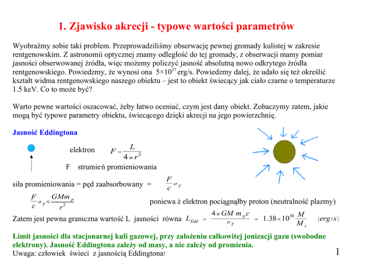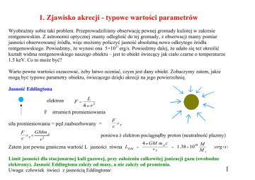 1. Zjawisko akrecji - typowe wartości parametrów Wyobraźmy sobie taki problem. Przeprowadziliśmy obserwację pewnej gromady kulistej w zakresie rentgenowskim. Z astronomii optycznej znamy odległość do tej gromady, z obserwacji mamy pomiar jasności obserwowanej źródła, więc możemy policzyć jasność absolutną nowo odkrytego źródła rentgenowskiego. Powiedzmy, że wynosi ona 5×1037 erg/s. Powiedzmy dalej, że udało się też określić kształt widma rentgenowskiego naszego obiektu – jest to obiekt świecący jak ciało czarne o temperaturze 1.5 keV. Co to może być? Warto pewne wartości oszacować, żeby łatwo oceniać, czym jest dany obiekt. Zobaczymy zatem, jakie mogą być typowe parametry obiektu, świecącego dzięki akrecji na jego powierzchnię. Jasność Eddingtona L 4 r2 strumień promieniowania elektron F F= siła promieniowania = pęd zaabsorbowany = F c T GMm p r2 F c T poniewa ż elektron pociągnąłby proton (neutralność plazmy) Zatem jest pewna graniczna wartość L jasności równa LEdd = 4 GM m p c T = 1.38 × 1038 M Ms [ erg / s ] Limit jasności dla stacjonarnej kuli gazowej, przy założeniu całkowitej jonizacji gazu (swobodne elektrony). Jasność Eddingtona zależy od masy, a nie zależy od promienia. Uwaga: człowiek świeci z jasnością Eddingtona! 1 1. Zjawisko akrecji - typowe wartości parametrów Promień R= R R Schw R Schw R Schw = 2.95 × 10 3 M [m] MS Minimalna skala czasowa Koherentne zmiany mogą zachodzić wtedy, gdy obszar pozostaje w związku przyczynowym, t.j. min = R = 10 c 5 R R Schw M Ms [s] a więc w skali mikrosekund dla gwiazdy neutrowej czy 1000 s dla supermasywnej czarnej dziury. Wydajność akrecji = 1 R Schw 2 R nie zale ży od masy obiektu Tempo akrecji Eddingtona ˙ 4 GM m p 1 14 M = 1.3 × 10 [ kg / s ] M c = L L Edd c T Ms ponieważ to wprowadzamy Tempo akrecji odpowiadajace jasności Eddingtona zależy od wydajności akrecji, a więc od tego, czy akrecja następuje np. na białego karła czy na gwiazdę neutronową. Czasami więc wprowadza się definicję tempa akrecji Eddingtona bez uwzględnienia wydajności (i.e. jakby zakładając wydajność 1, co jest trochę mylące). ˙ 2 M Edd = 2 1. Typowe wartości parametrów cd. Maksymalna energia fotonów emitowanych przez akreujący gaz Zakładając, że cała energia spadającej radialnie cząstki zostaje zamieniona na 1 foton, otrzymamy związek E max = GMm p R = 470 MeV R Schw R lub w formie temperatury, z relacji E=kT, T max = 6 × 1012 R Schw R [K] Taki mechanizm zakłada, że akreująca plazma plazma jest optycznie cienka, uciekające fotony nie oddziałują z materią, a widmo powstającego promieniowania nie ma wtedy kształtu charakterystycznego dla ciała czarnego. Ta górna granica nie realizuje się w praktyce. W każdym razie nie zależy ona od masy obiektu, a zalezy od zwartości. Minimalna temperatura fotonów emitowanych przez akreujący gaz Najwydajniejszą formą świecenia jest świecenie ciała doskonale czarnego ono osiąga najniższą temperaturę przy zadanym strumieniu promieniowania. Jest to dobre przybliżenie dla ośrodka optycznie grubego, osiągającego równowagę termiczną materii i promieniowania. L = T 4bb R2 (albo 4 keV) co można przekształcić do 1/2 L 1 4 R Schw T bb = 4 × 10 L Edd R 7 / Ms 14 M / [K] Teraz można odpowiedzieć na pytanie zadane na początku wykładu odnośnie źródła w gromadzie kulistej. Jest nim albo gwiazda neutronowa, albo gwiazdowa czarna diura, ponieważ pasują jasność i temperatura. Dalsze rozróżnienie czarnej dziury od gwiazdy neutronowej stanowi już poważny problem, o czym potem. 3 1. Typowe wartości parametrów cd. Pole magnetyczne Charakterystyczna wartość pola magnetycznego o gęstości energii takiej jak gęstość energii 2 promieniowania B L = 2 8 4 R c R Schw L 1 2 M s 1 2 B = 4 [G ] R L Edd M co po przeliczeniu można wygodnie wyrazić jako Zatem pole magnetyczne skaluje się nie z masą, a z pierwiastkiem. / / Ewolucyjna skala czasowa Tempo wzrastania masy centralnej w wyniku stacjonarnej akrecji ewol = M ˙ M co wygodnie wyrazić jako ewol = 1 L Edd 3 × 10 L 8 [ lat ] Tak ocenione tempo ewolucji nie zależy od masy obiektu centralnego i jest takie samo dla gwiazdy jak i dla supermasywnej czarnej dziury w cenrum galaktyki. Jest on zaledwie kilkukrotnie krótszy od wieku Wszechświata (ok. 12-14 miliardów lat), jeśli wydajność akrecji jest rzędu 10%. DYGRESJA: W praktyce nie wszystko jest takie proste. Na przykład niektóre akreujące białe karły raczej zmniejszają, a nie zwiększają, masę ponieważ w trakcie powtarzających się wybuchów termojądrowych (zjawisko gwiazdy nowej) odrzucają więcej masy niż zaakreują pomiędzy wybuchami. Otrzymane relacje pozwalają na oszacowanie parametrów obiektu, gdy obserwacje pozwalają na określenie przynajmniej kilku z nich. 4 2. Wyznaczanie parametrów z obserwacji Jasność Największy problem stanowi pomiar odległości - generalnie jeden z największych problemów w astronomii. Przykład. Długo toczyła się dyskusja o odległościach i jasnościach błysków gamma - rozbłysków pojawiających się erratycznie na niebie w przypadkowych kierunkach, izotropowo, trwających od ułamka sekundy do kilkuset sekund. Rozkład przestrzenny oraz zależność liczby rozbłysków od jasności obserwowanej sugerowała pochodzenie albo z halo galaktycznego, z odległości ok. 100 kps (1ps = 3×1018 cm), albo z odległości kosmologicznych, czyli ok. 10 Gps. W pierwszym przypadku typowe jasności wynosiłyby 1041 erg/s, a w tym drugim 1051 erg/s - różnica dziesęciu rzędów wielkości! Dopiero kilka lat temu obserwacje wykonane przez teleskop Beppo-SAX doprowadziły do precyzyjnego określenia pozycji kilku błysków gamma (np. GRB970508), następnie ich identyfikacji ze źródłami pomieniowania w innych zakresach widmowych, w tym do odkrycia poświat w zakresie optycznym, co pozwoliło na określenie odległości w oparciu