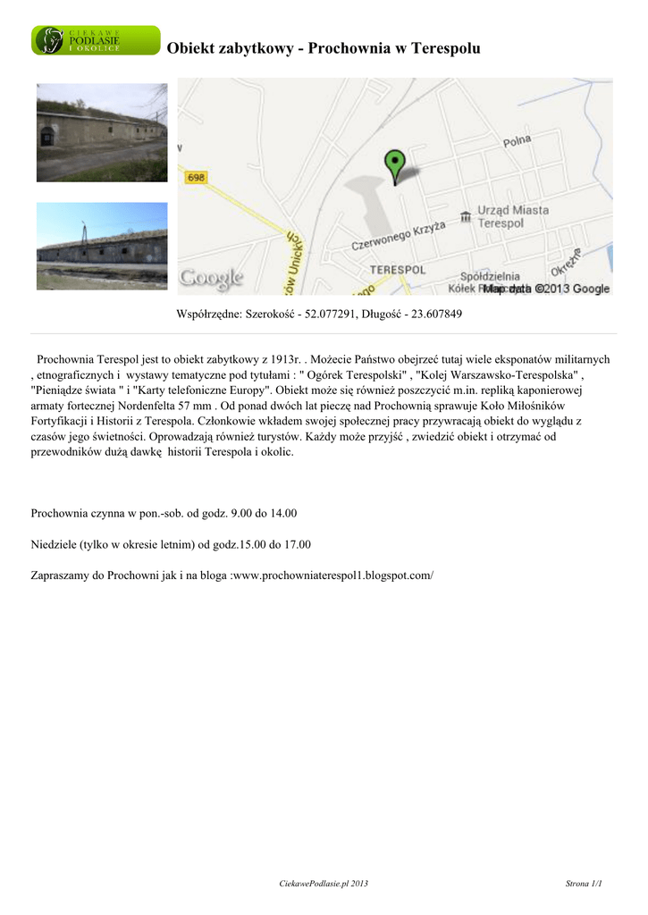 Obiekt zabytkowy - Prochownia w Terespolu Współrzędne: Szerokość - 52.077291, Długość - 23.607849 Prochownia Terespol jest to obiekt zabytkowy z 1913r. . Możecie Państwo obejrzeć tutaj wiele eksponatów militarnych , etnograficznych i wystawy tematyczne pod tytułami : " Ogórek Terespolski" , "Kolej Warszawsko-Terespolska" , "Pieniądze świata " i "Karty telefoniczne Europy". Obiekt może się również poszczycić m.in. repliką kaponierowej armaty fortecznej Nordenfelta 57 mm . Od ponad dwóch lat pieczę nad Prochownią sprawuje Koło Miłośników Fortyfikacji i Historii z Terespola. Członkowie wkładem swojej społecznej pracy przywracają obiekt do wyglądu z czasów jego świetności. Oprowadzają również turystów. Każdy może przyjść , zwiedzić obiekt i otrzymać od przewodników dużą dawkę historii Terespola i okolic. Prochownia czynna w pon.-sob. od godz. 9.00 do 14.00 Niedziele (tylko w okresie letnim) od godz.15.00 do 17.00 Zapraszamy do Prochowni jak i na bloga :www.prochowniaterespol1.blogspot.com/ CiekawePodlasie.pl 2013 Strona 1/1