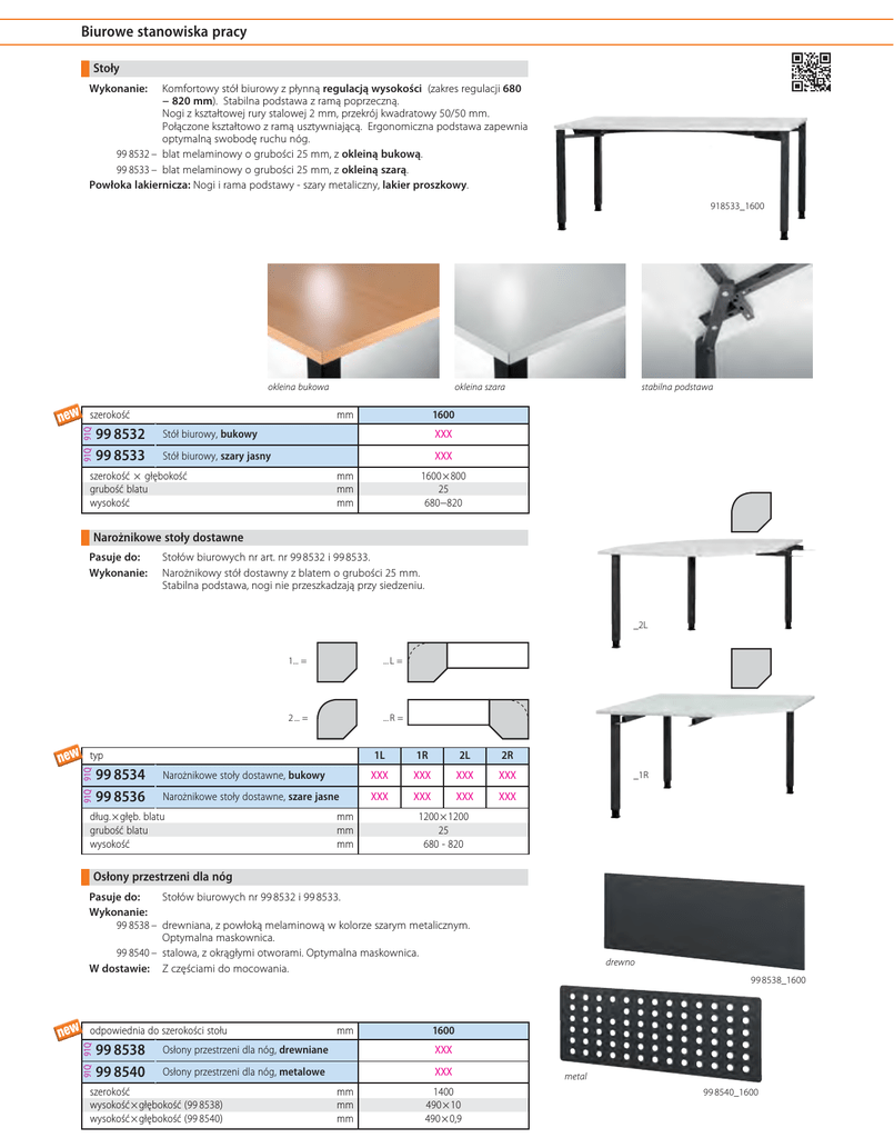 Biurowe stanowiska pracy Stoły Wykonanie: Komfortowy stół biurowy z płynną regulacją wysokości (zakres regulacji 680 − 820 mm). Stabilna podstawa z ramą poprzeczną. Nogi z kształtowej rury stalowej 2 mm, przekrój kwadratowy 50/50 mm. Połączone kształtowo z ramą usztywniającą. Ergonomiczna podstawa zapewnia optymalną swobodę ruchu nóg. 99 8532 – blat melaminowy o grubości 25 mm, z okleiną bukową. 99 8533 – blat melaminowy o grubości 25 mm, z okleiną szarą. Powłoka lakiernicza: Nogi i rama podstawy - szary metaliczny, lakier proszkowy. 918533_1600 okleina bukowa 91Q 91Q szerokość 99 8532 99 8533 okleina szara stabilna podstawa 1600 mm XXX Stół biurowy, bukowy XXX Stół biurowy, szary jasny szerokość × głębokość grubość blatu wysokość mm mm mm 1600×800 25 680−820 Narożnikowe stoły dostawne Pasuje do: Wykonanie: Stołów biurowych nr art. nr 99 8532 i 99 8533. Narożnikowy stół dostawny z blatem o grubości 25 mm. Stabilna podstawa, nogi nie przeszkadzają przy siedzeniu. _2L 1... = ... L = 2 ... = ... R = 1L 1R 2L 2R Narożnikowe stoły dostawne, bukowy XXX XXX XXX XXX Narożnikowe stoły dostawne, szare jasne XXX XXX XXX XXX 91Q 91Q typ 99 8534 99 8536 dług.×głęb. blatu grubość blatu wysokość mm mm mm _1R 1200×1200 25 680 - 820 Osłony przestrzeni dla nóg Pasuje do: Stołów biurowych nr 99 8532 i 99 8533. Wykonanie: 99 8538 – drewniana, z powłoką melaminową w kolorze szarym metalicznym. Optymalna maskownica. 99 8540 – stalowa, z okrągłymi otworami. Optymalna maskownica. W dostawie: Z częściami do mocowania. drewno 99 8538_1600 91Q 91Q odpowiednia do szerokości stołu 99 8538 99 8540 mm 1600 Osłony przestrzeni dla nóg, drewniane XXX Osłony przestrzeni dla nóg, metalowe XXX szerokość wysokość×głębokość (99 8538) wysokość×głębokość (99 8540) mm mm mm 1400 490×10 490×0,9 metal 99 8540_1600 Biurowe stanowiska pracy Kontenery na rolkach Wykonanie: Kontenery na rolkach o głębokości 600 mm, z drewna melaminowego. Metalowe szuflady z drewnianym frontem i możliwością otwierania z boku. Górna szuflada z korytkiem z tworzywa sztucznego na przybory do pisania, z blokadą. Rolki wpuszczane i bez hamulców, przystosowane do miękkiego podłoża. Wielk. 3 – 3 szuflady (wysokości frontów 70, 120 i 320 mm). W dolnej szufladzie można zamontować zawieszany kosz. Wielk. 4 – 4 szuflady (wysokości frontów: 70, 2×120 i 200 mm). 99 8541_3 91Q liczba szuflad 99 8541 Kontenery na rolkach szer.×głęb.×wys. mm 3 4 XXX XXX 432×600×511 Stoły konferencyjne Wykonanie: Komfortowy stół konferencyjny. Stabilna podstawa z ramą poprzeczną. Nogi z kształtowej rury stalowej 2 mm, przekrój kwadratowy 50/50 mm. Połączone kształtowo z ramą usztywniającą. Ergonomiczna podstawa zapewnia optymalną swobodę ruchu nóg. Blat melaminowy o grubości 25 mm z okleiną bukową Powłoka lakiernicza: Nogi i rama podst - szary metaliczny, lakier proszkowy. 91Q długość 99 8542 mm 2000 mm mm mm 2000×1050 25 720 XXX Stoły konferencyjne dł.×szer. grubość blatu wysokość Szafka pomocnicza Drewniana szafka z przesuwnymi drzwiami, ze środkową ścianą działową i dwoma półkami (z obu stron ścianki działowej), o grubości 25 mm, możliwość przestawiania co 32 mm. Szafka z mocnymi tylnymi ściankami z wykończeniem meblowym. Dostawa z uchwytami. Stalowy cokół o wysokości 30 mm ze śrubami do regulacji wysokości. Zamek patentowy i dwa klucze. Powłoka lakiernicza: Szary metaliczny, lakier proszkowy. Wykonanie: 1200 91Q szerokość 99 8543 Szafka pomocnicza z drzwiami przesuwnymi liczba półek szer.×głęb.×wys. wys. użytkowa XXX mm mm 2 1200×450×779 705 możliwość otwierania z boku 99 8541_4 przykład zastosowania